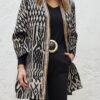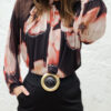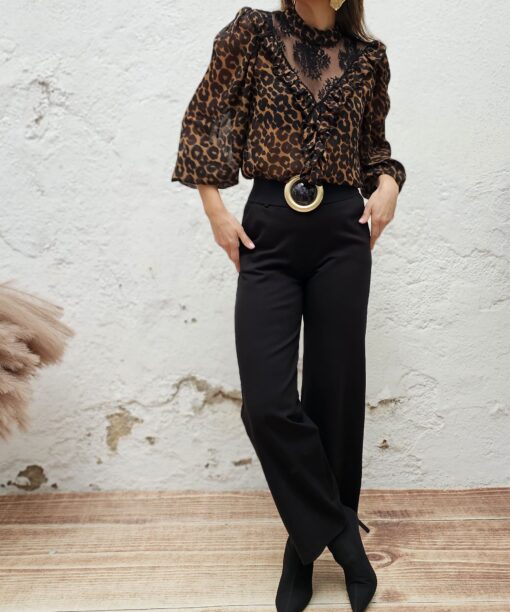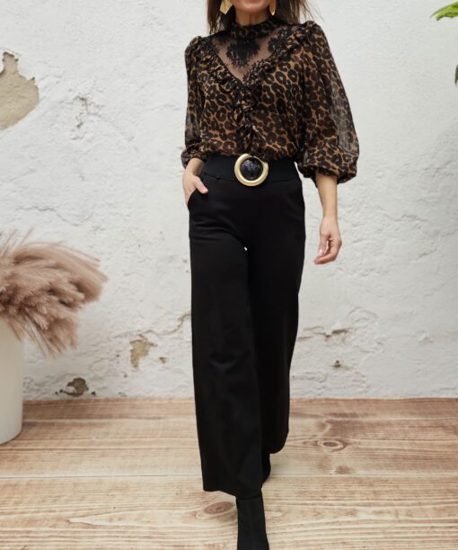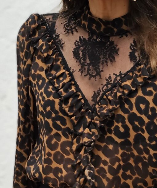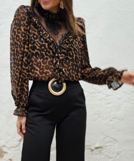 Manchitas de print negras con fondo camel. Tl en la parte delantera hasta el inicio del escote. Ligera transparencia, pero tan ligera/sutil que es inapreciable al ojo humano que te mira.