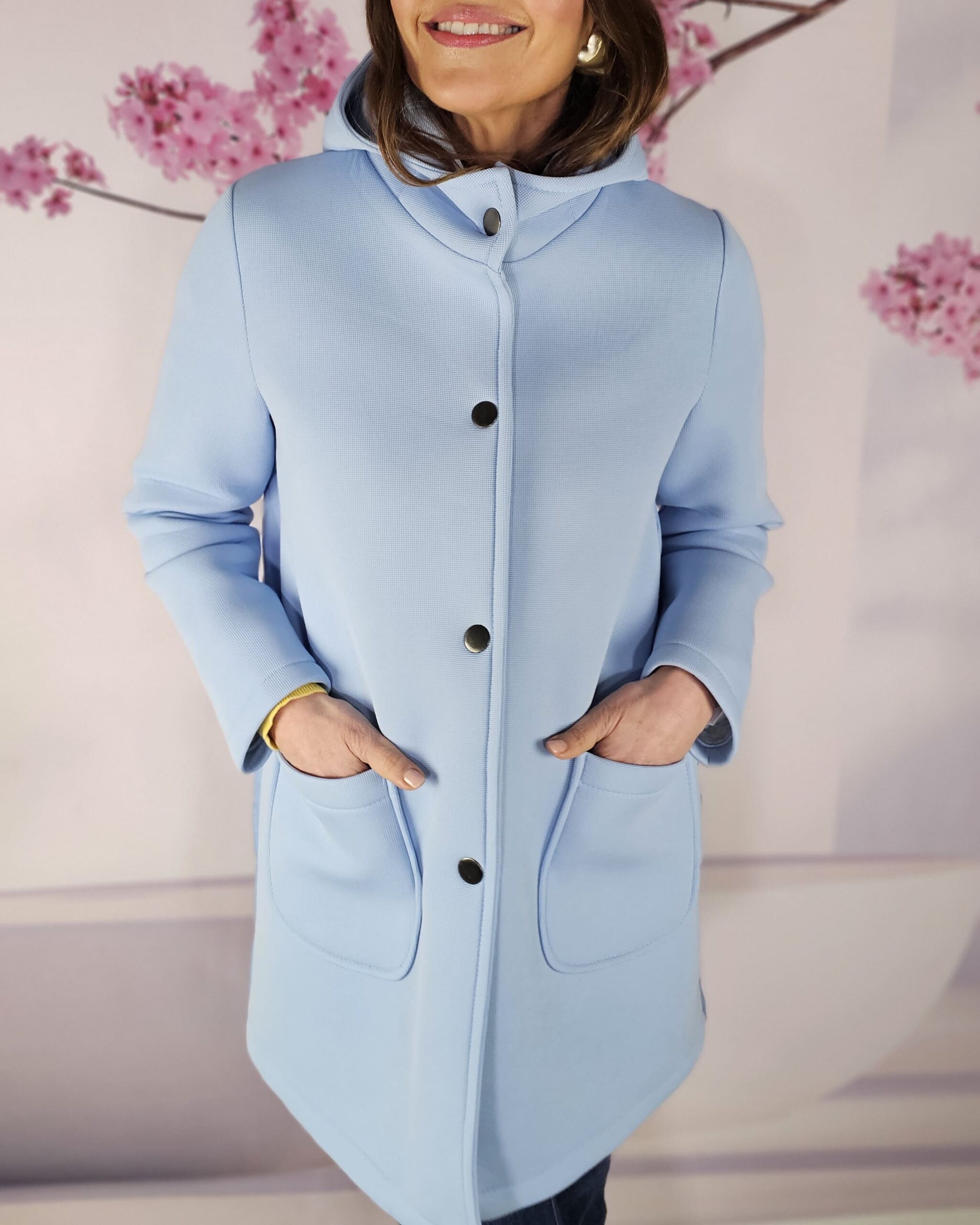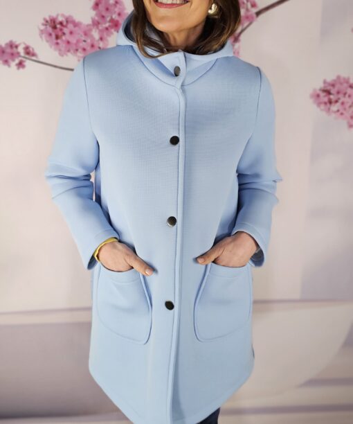 El abrigo ideal para llevar a diario, tejido con empaque, con un diseño muy college, capucha y cierre con corchete.