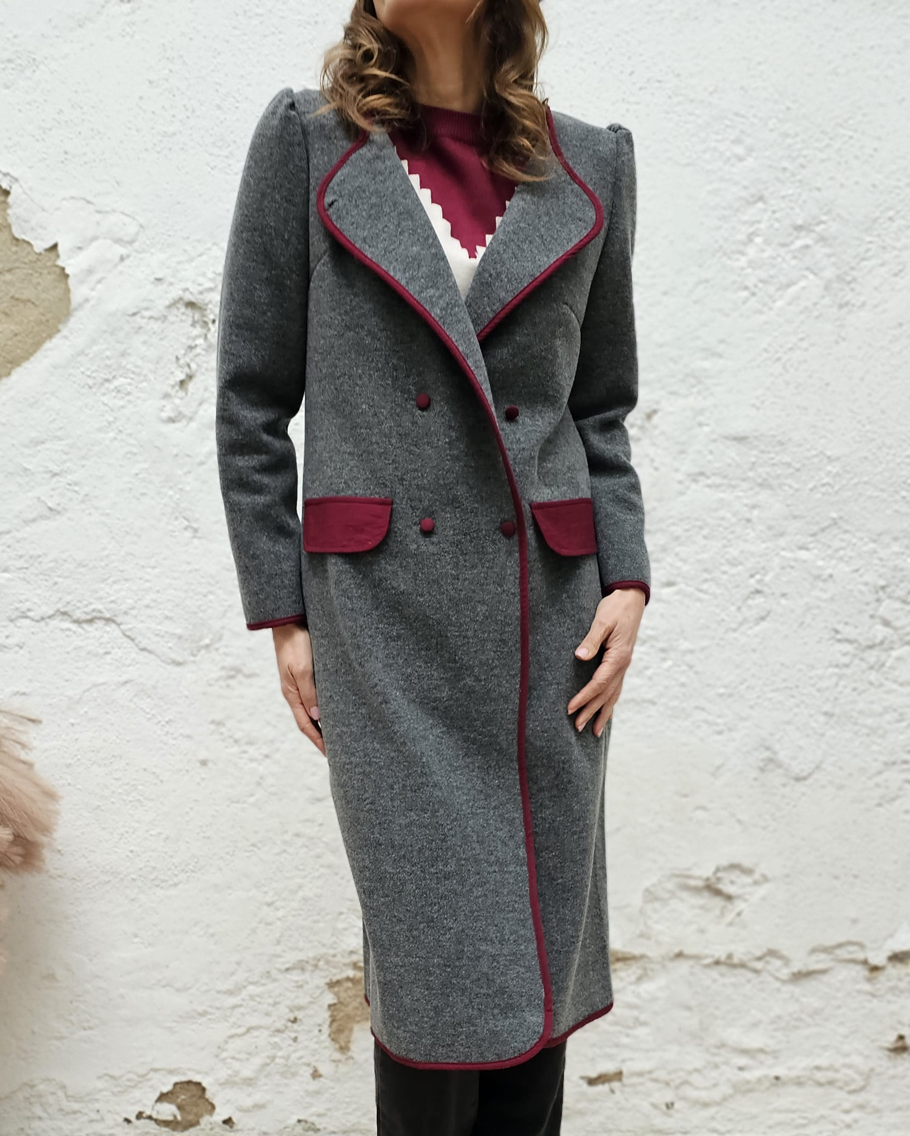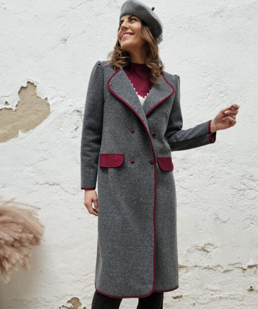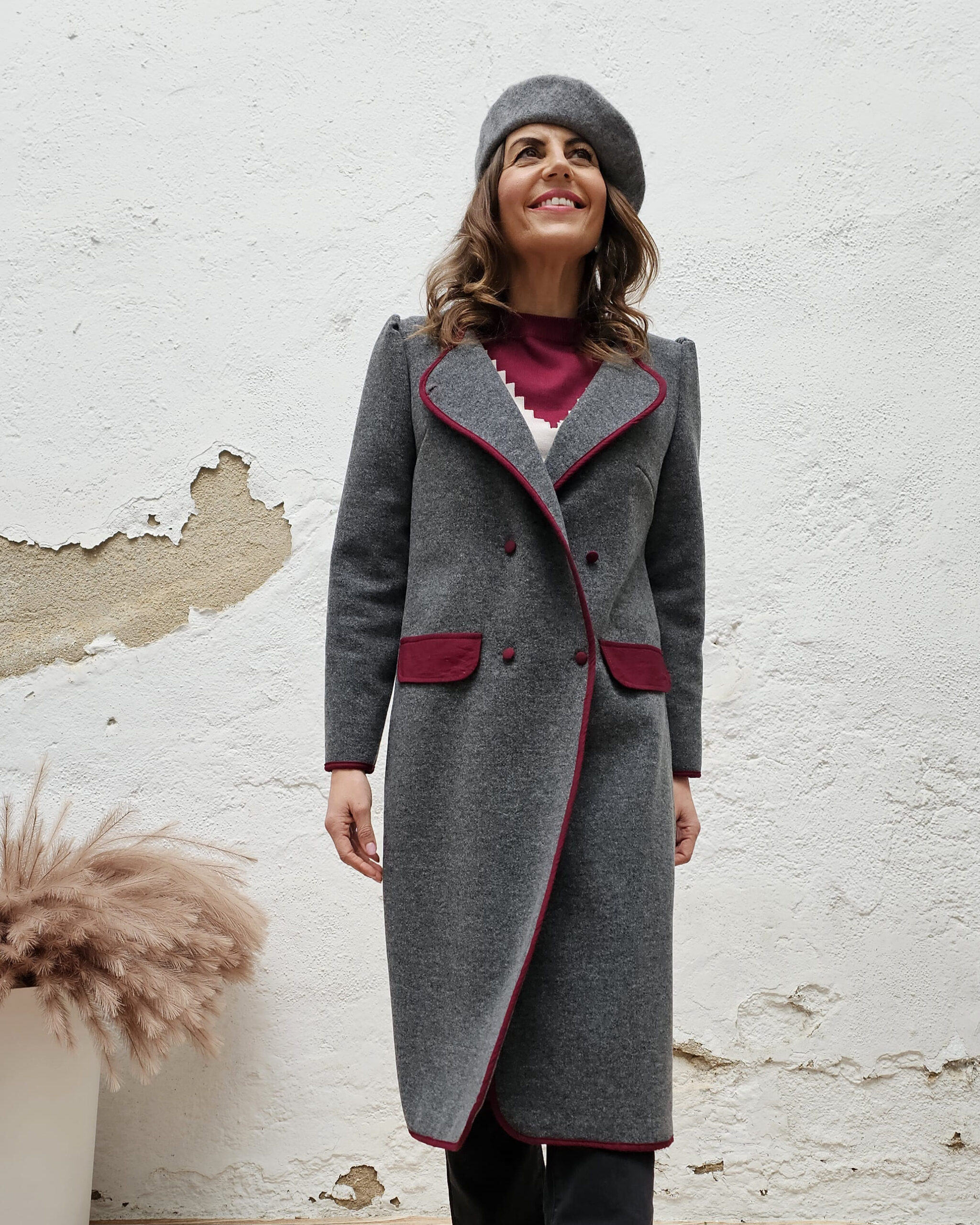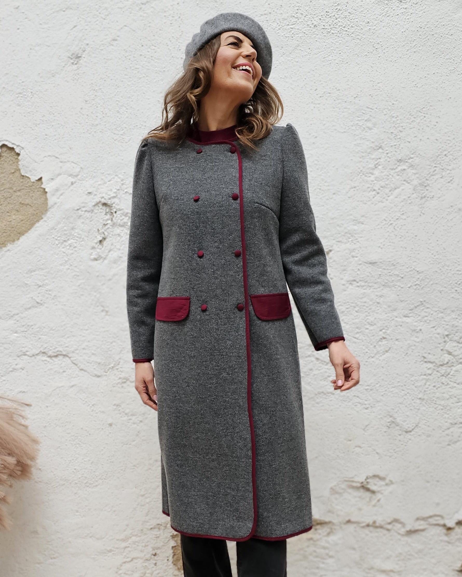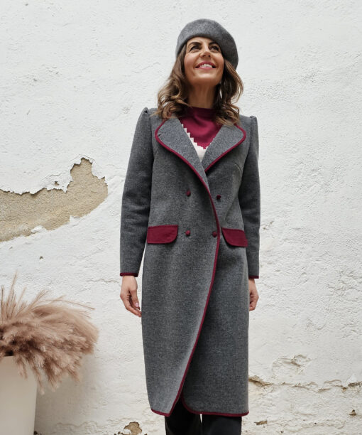 Botones forrados en tono vino tinto, solapas en tono vino tinto…un abrigo que desprende estilazo donde vayas.