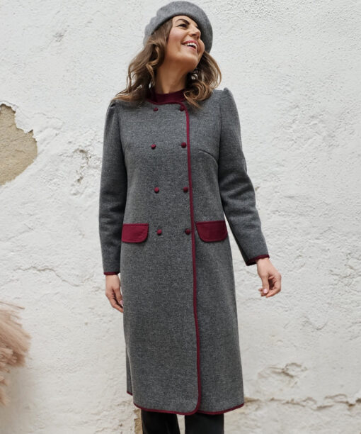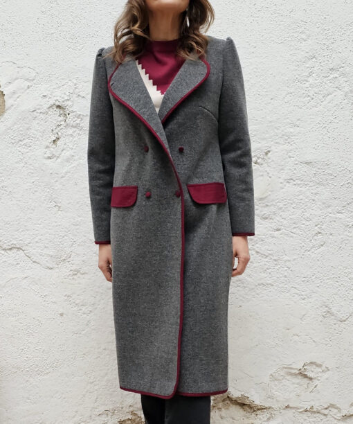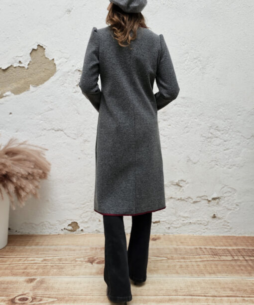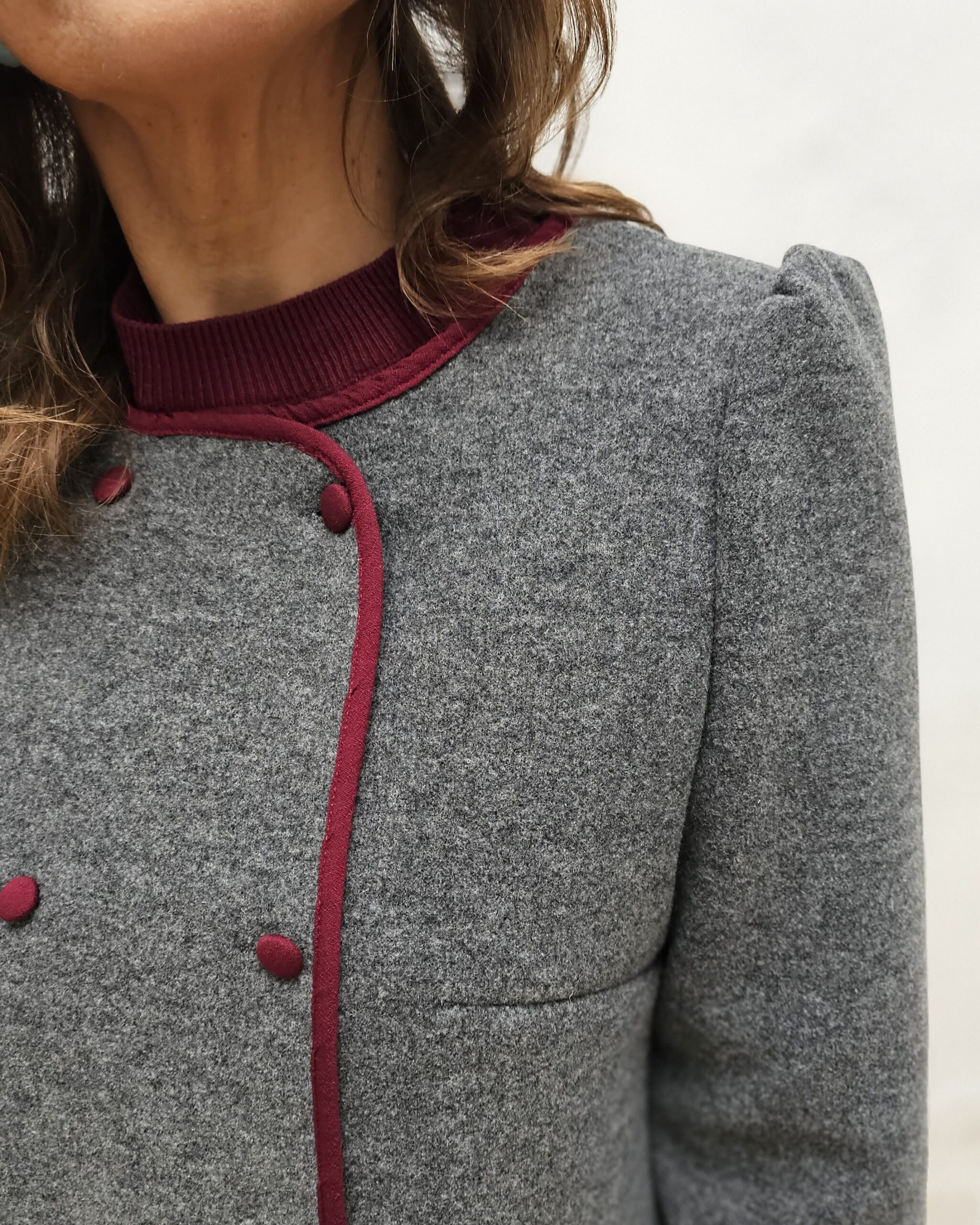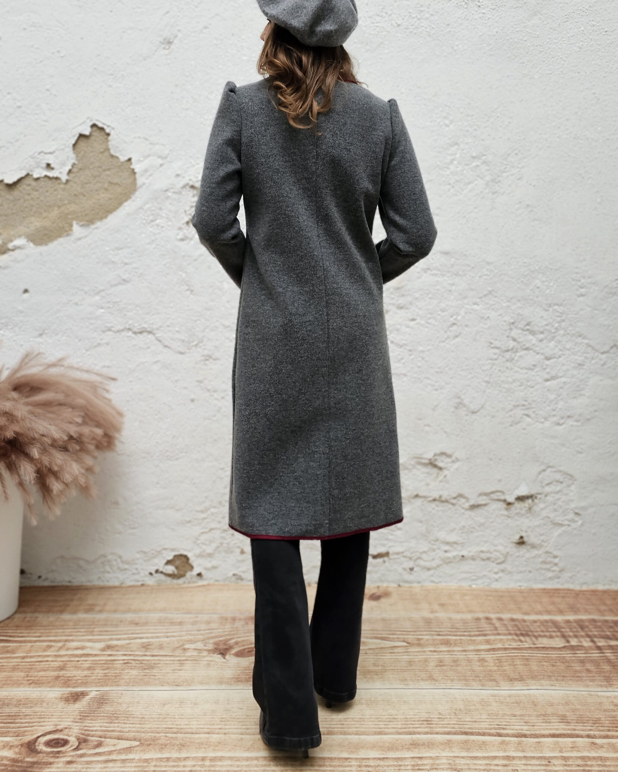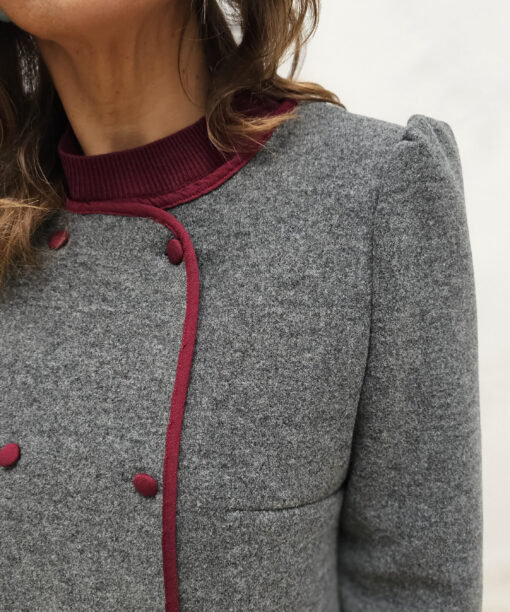 Botones forrados en tono vino tinto, solapas en tono vino tinto…un abrigo que desprende estilazo donde vayas.