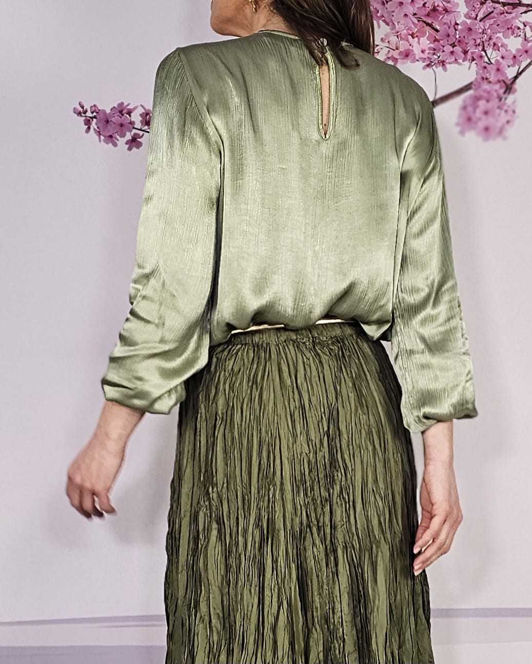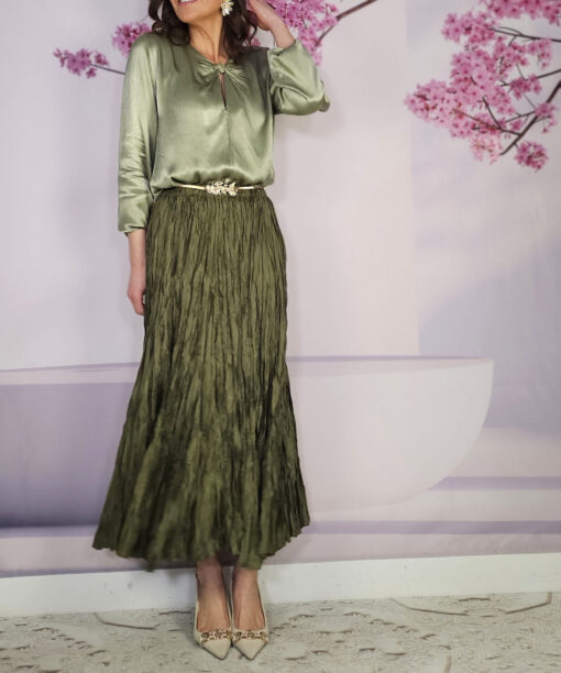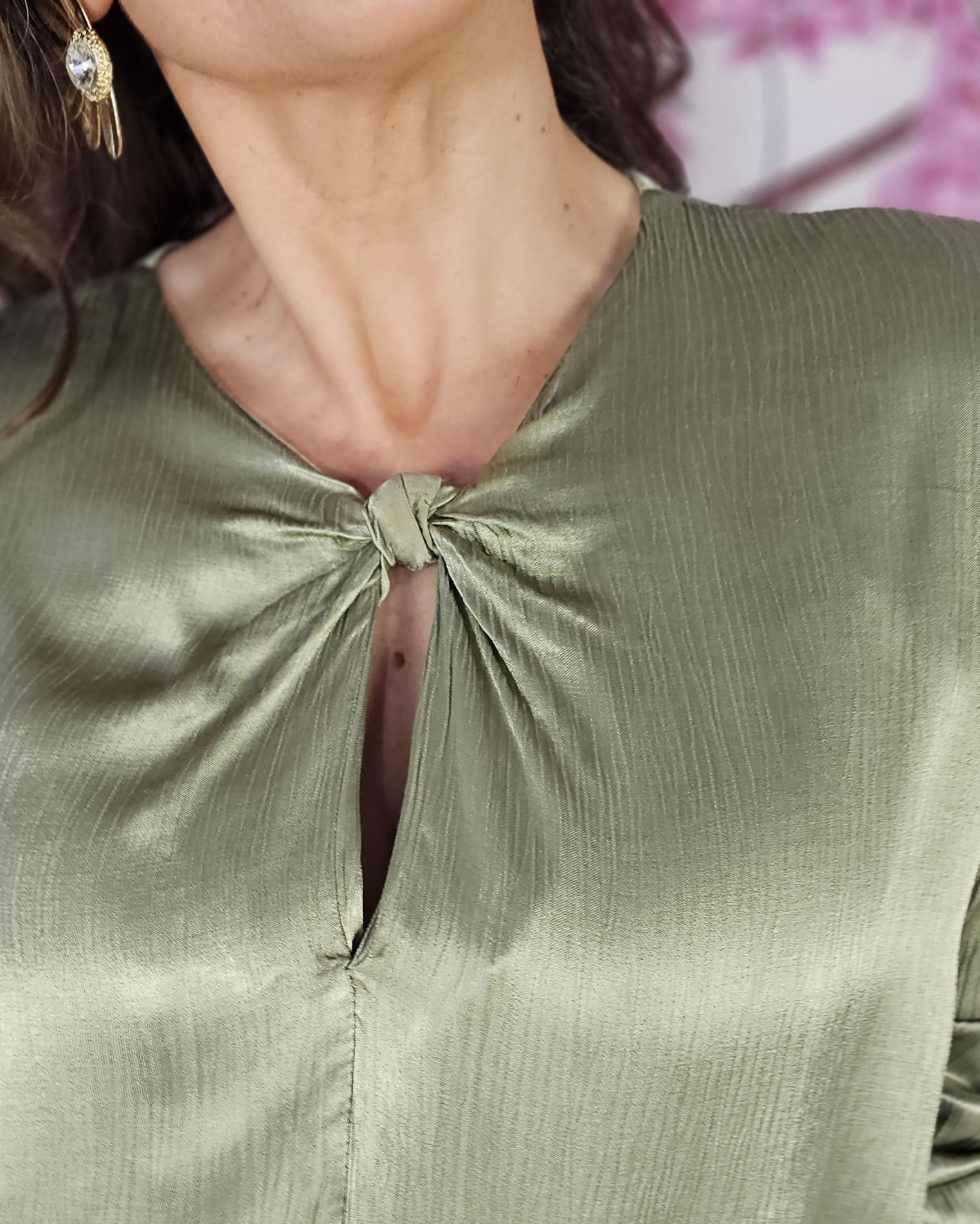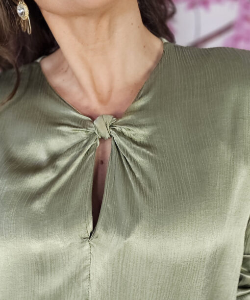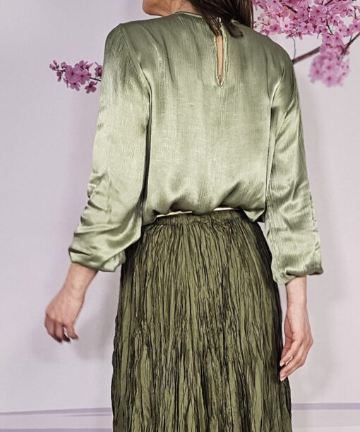 Raso, nudo perfecto que viene ya hecho a ala altura del pecho, manga larga con puño engomado…una blusa con Alma
