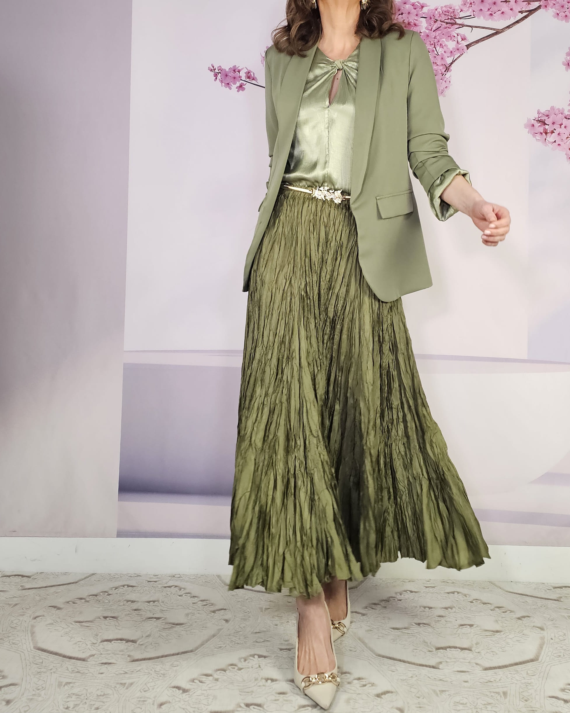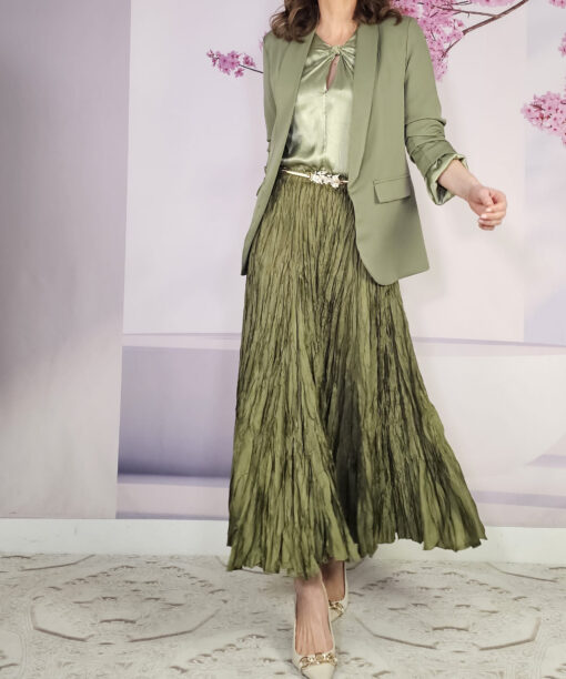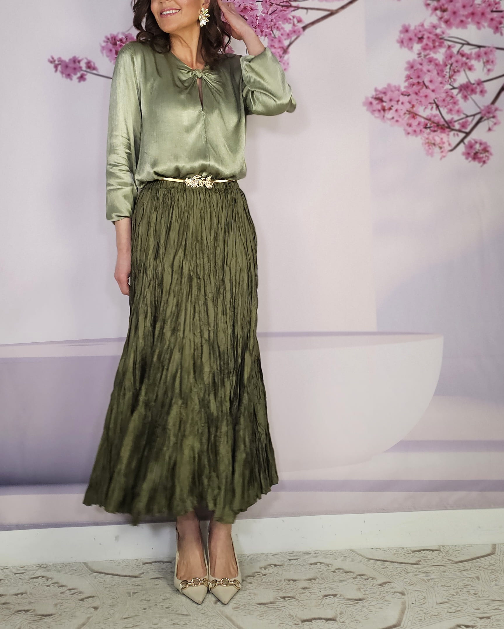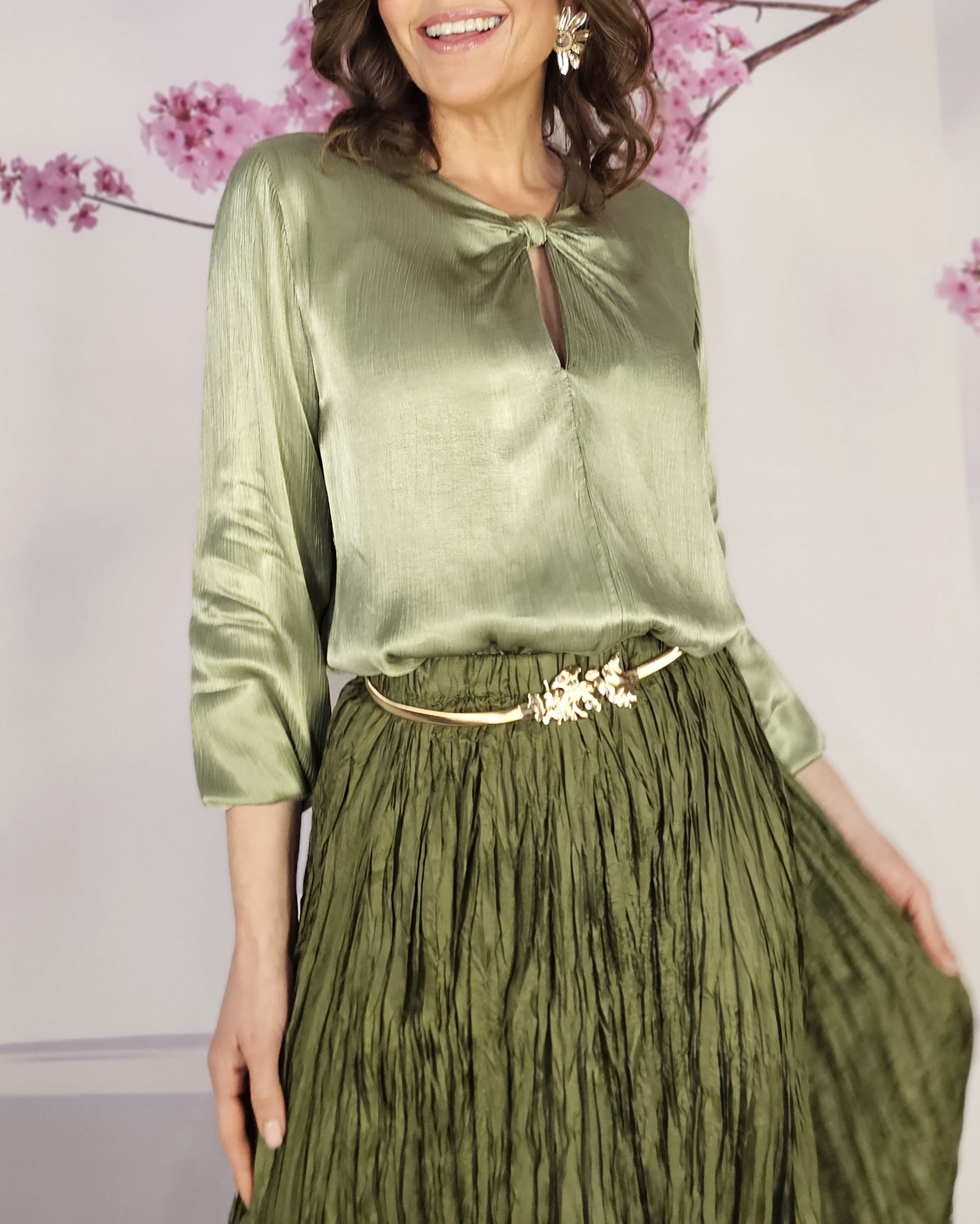 Raso, nudo perfecto que viene ya hecho a ala altura del pecho, manga larga con puño engomado…una blusa con Alma