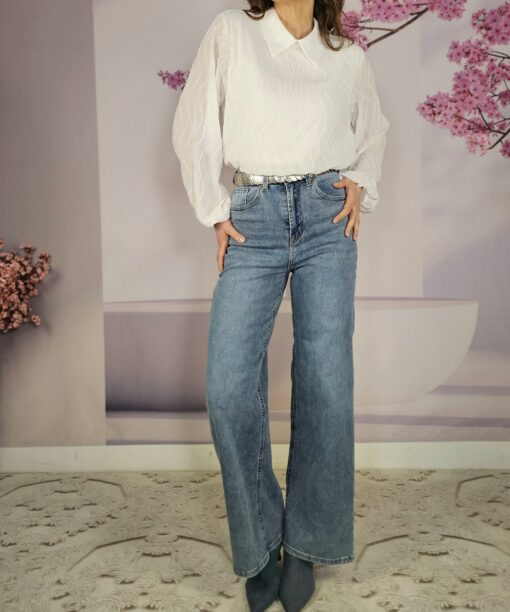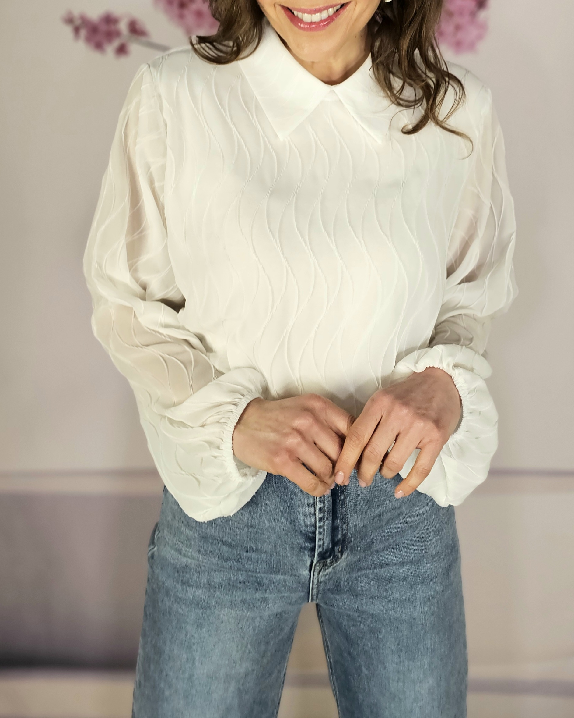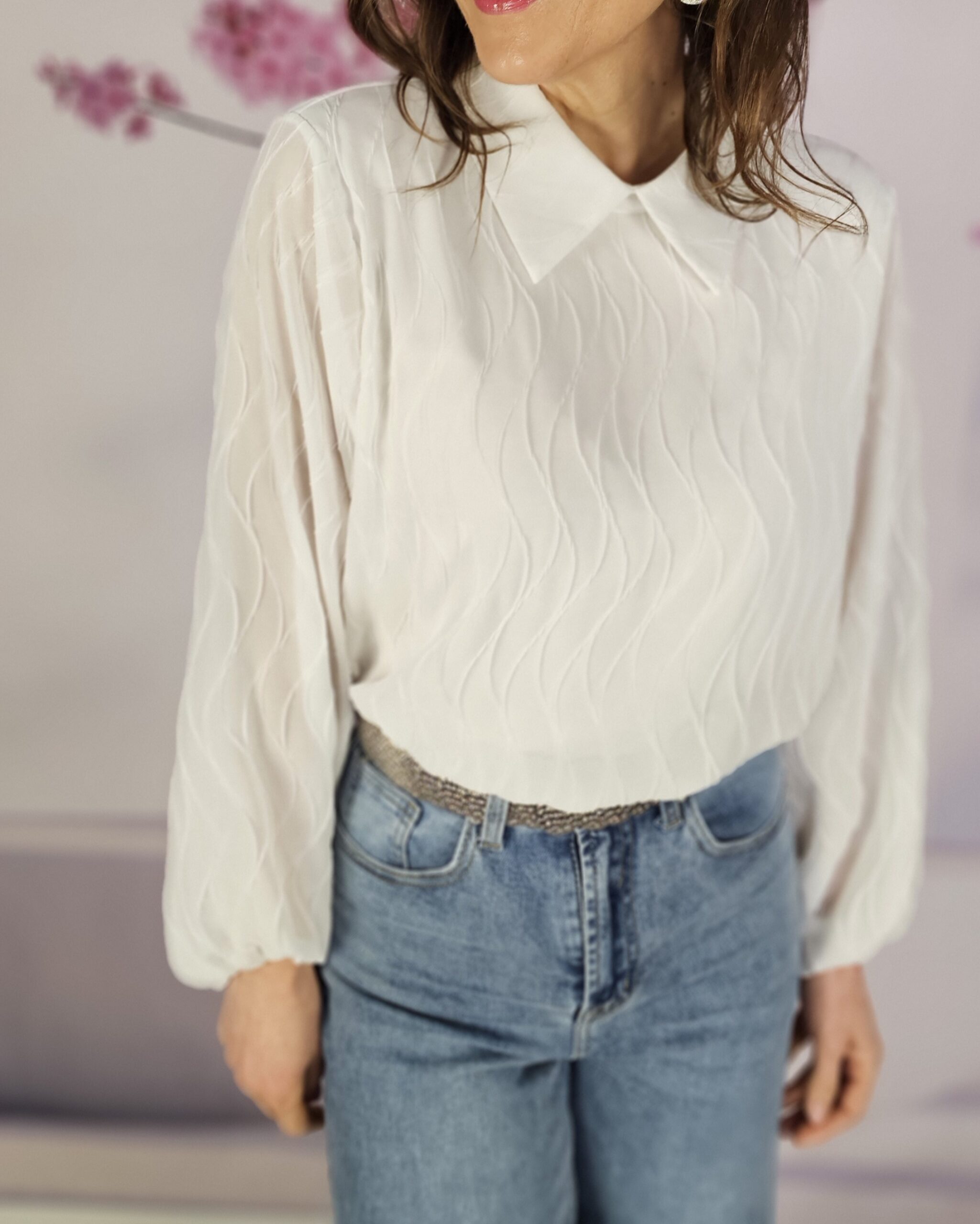 Cuello camisero, un dibujo que simula un rallado en zig zag espectacular, engomada en la cintura  y forrada en su interior.
