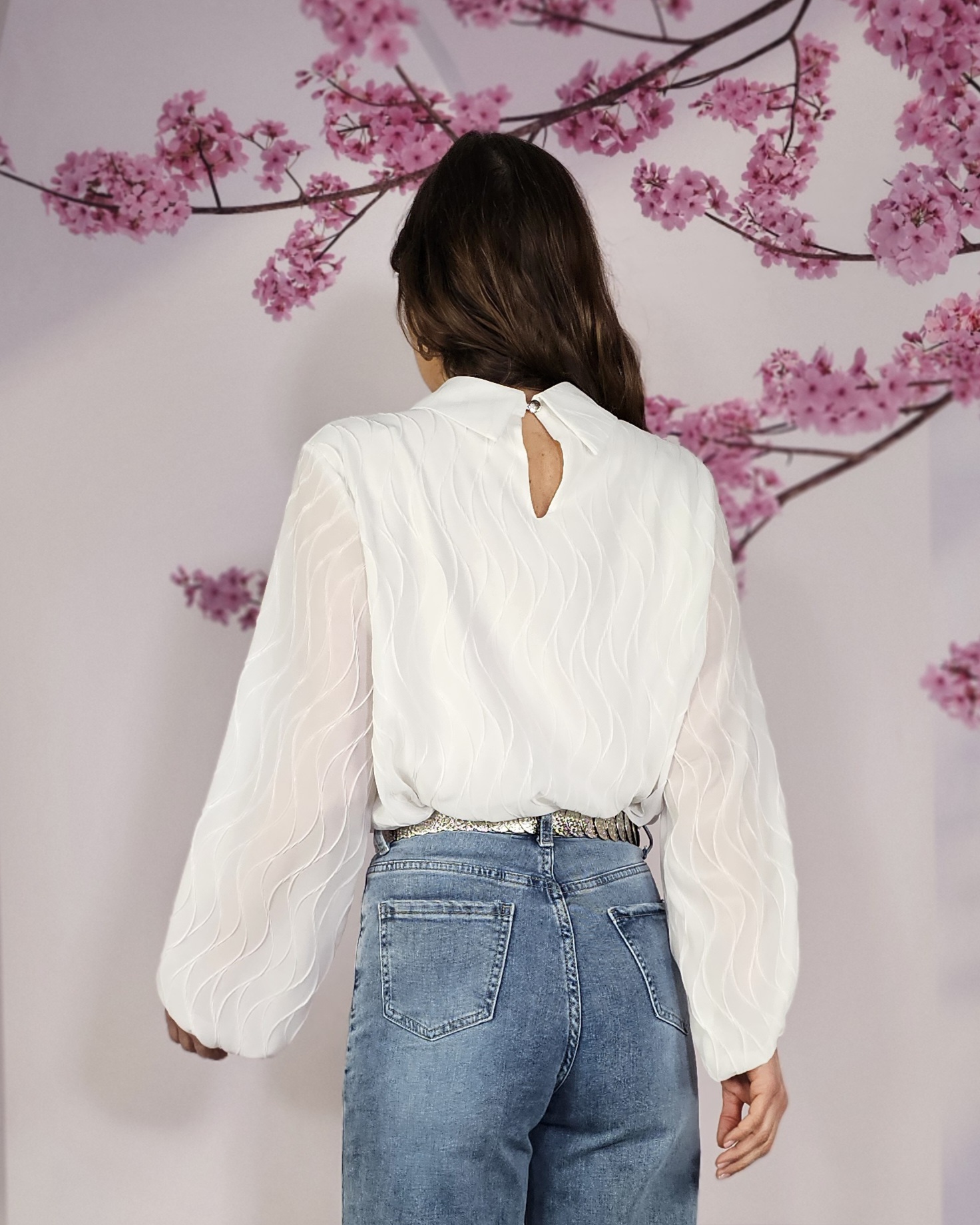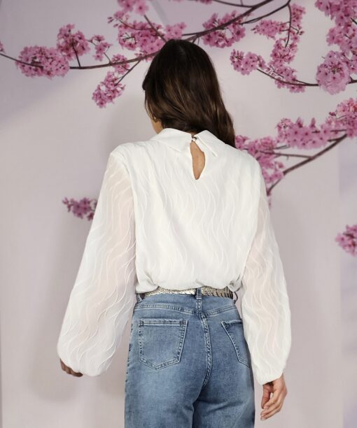 De manga larga con los puños engomados y cierre en la parte de atrás con botón de trevilla.