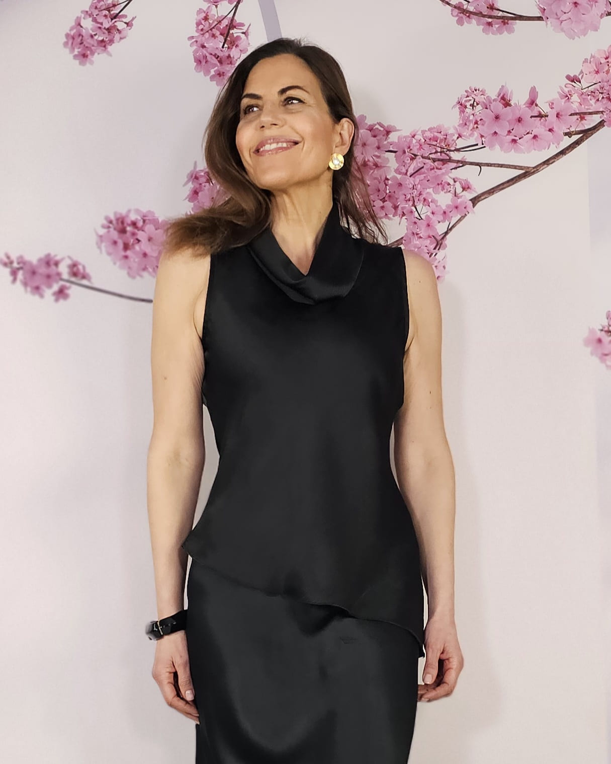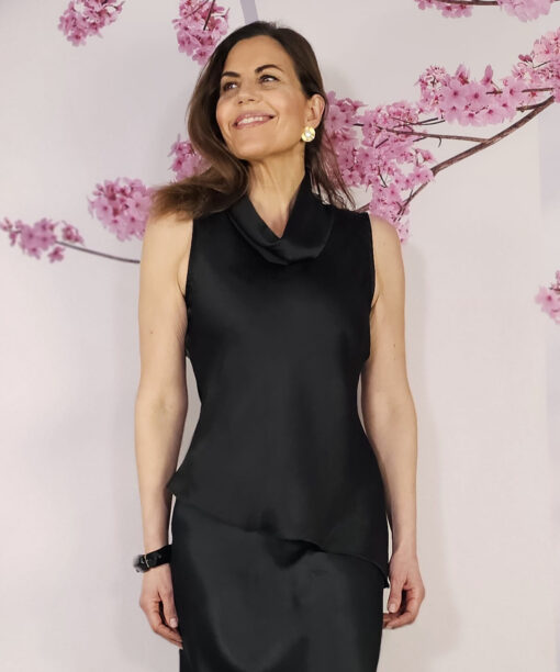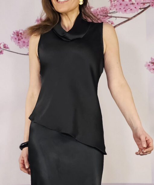 Brillo suave, tejido fluido…un negro suave satinado…es un top o blusa sin mangas, con cuello lagrima.