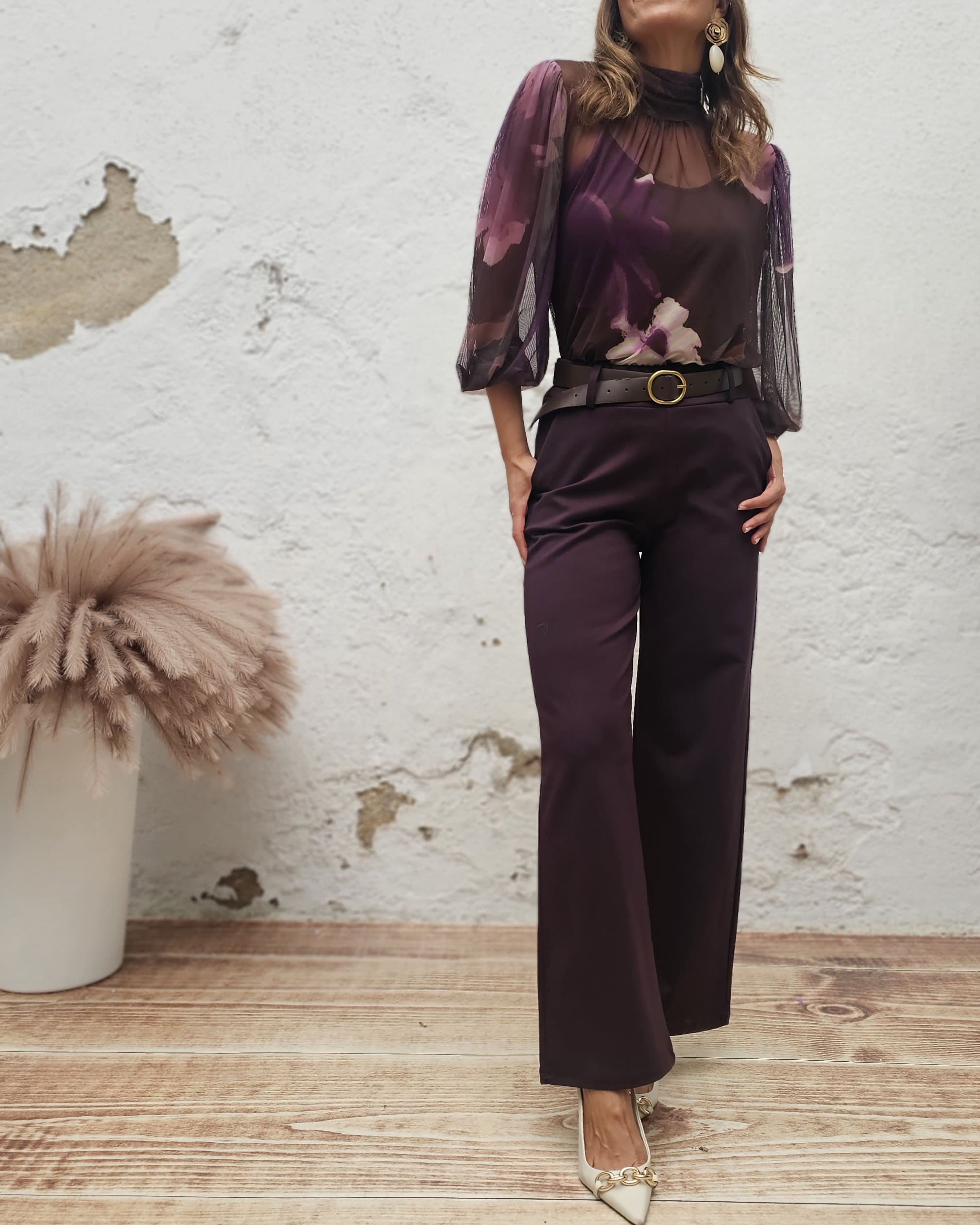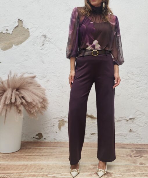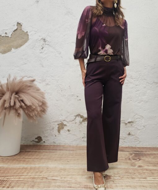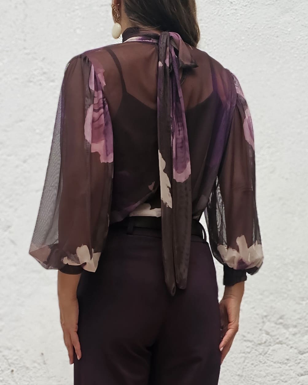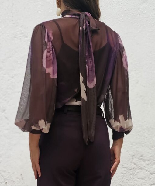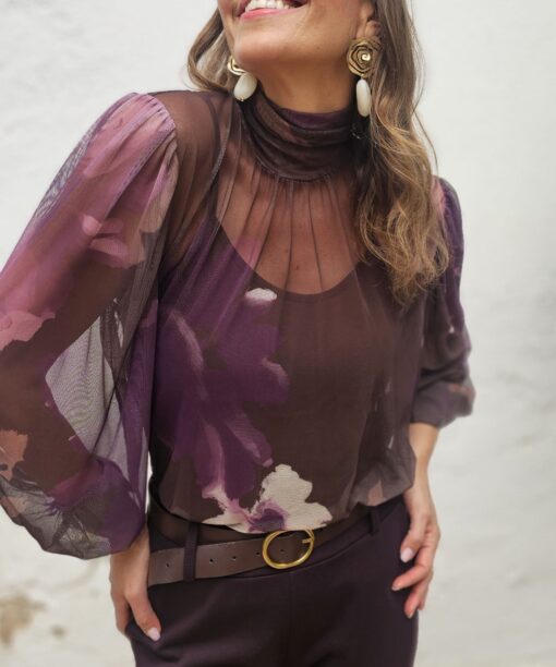 Tul en marrón con estampado rosa. Mnaga larga y puño engomado invisiblE.