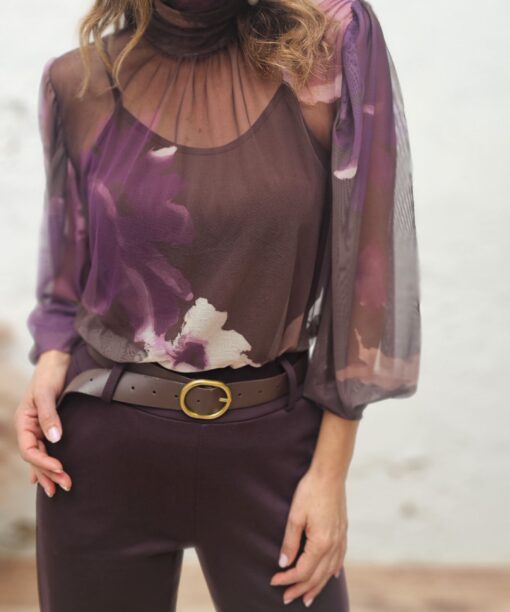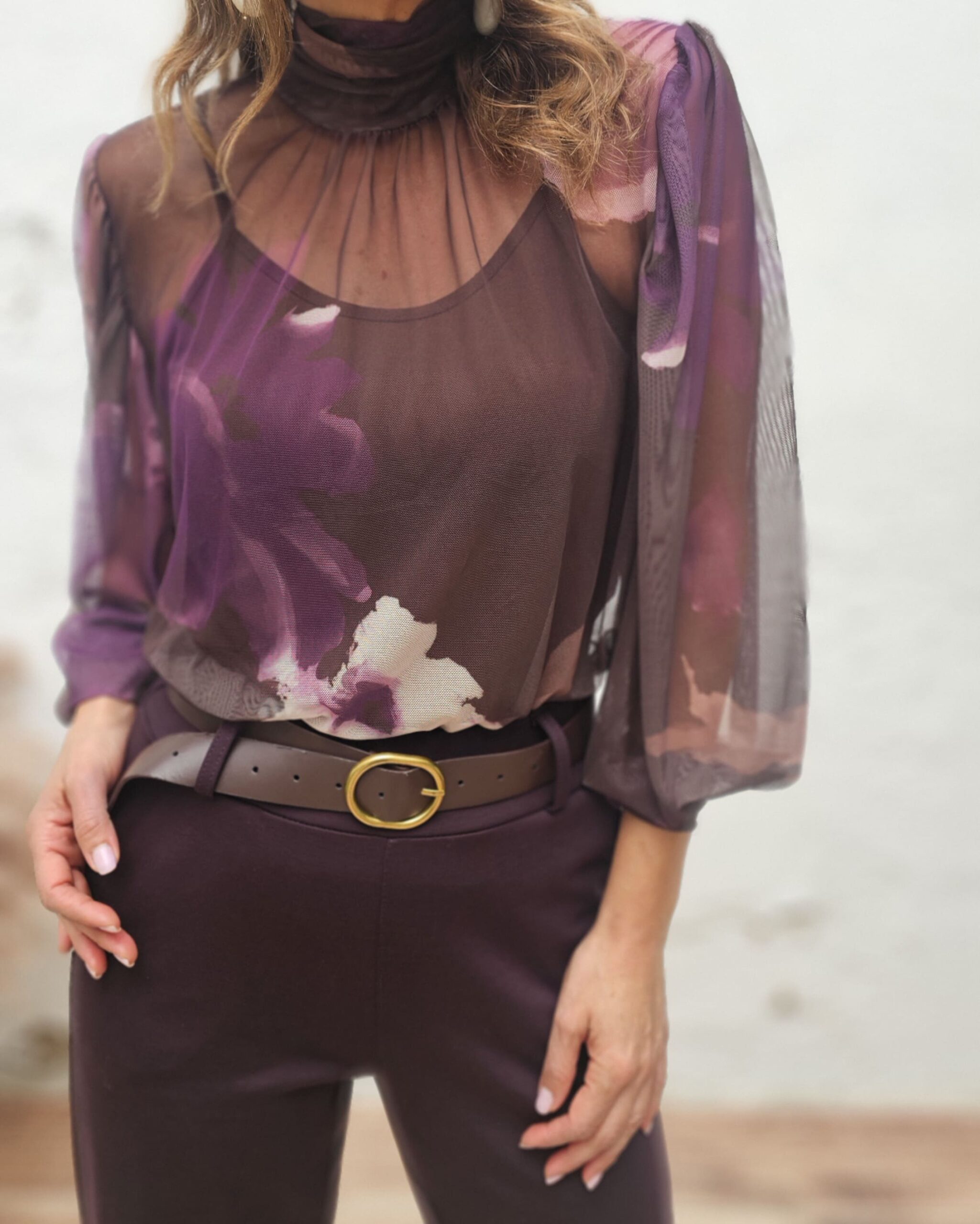 Una blusa de tul con su top compañero a juego. El top de tirantes marrón es un básico. El que te pones con ésta blusa y con millones de looks más.