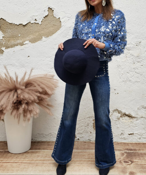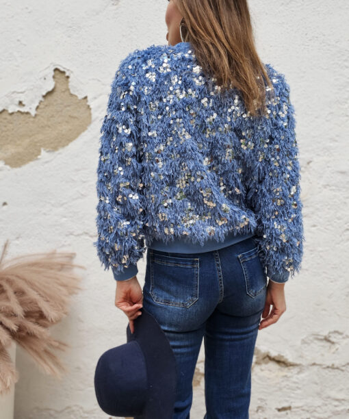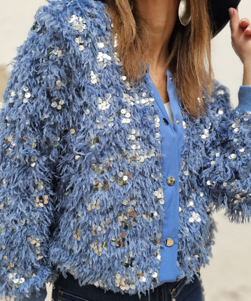 Pelito, lentejuelas en tono plata, cuello y manga engomado.