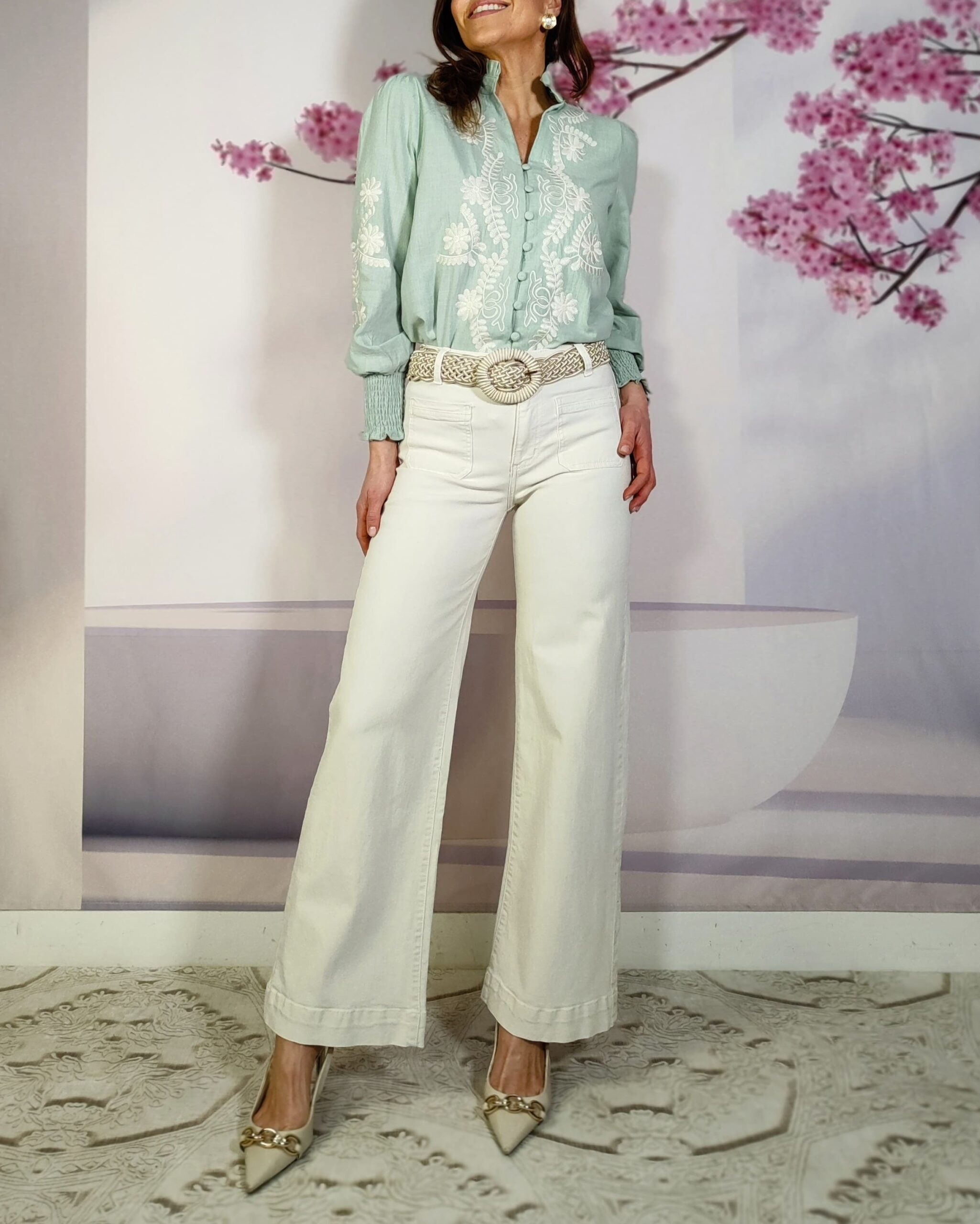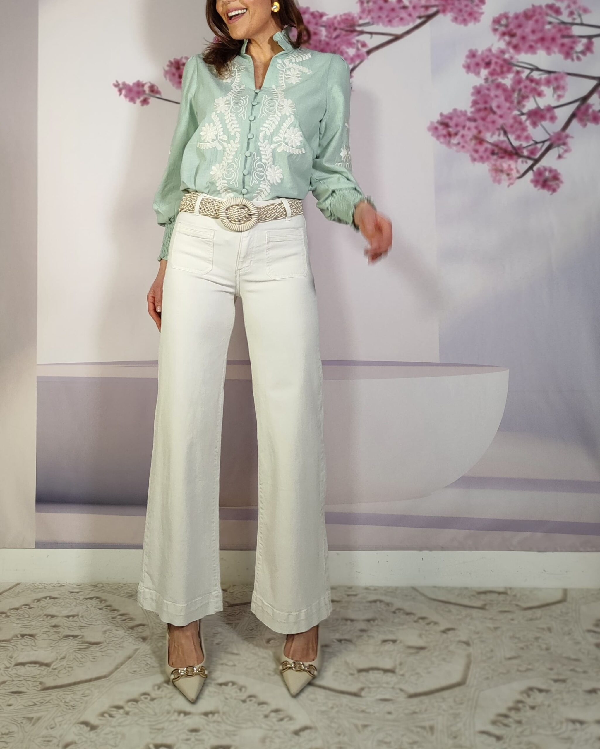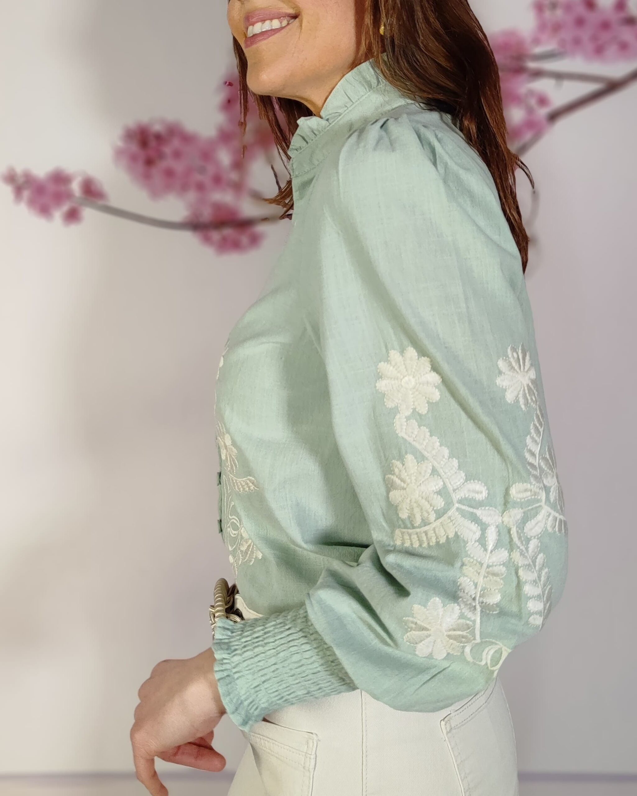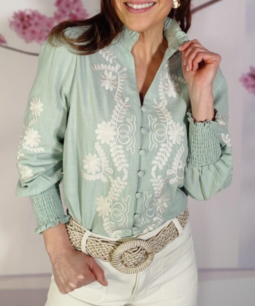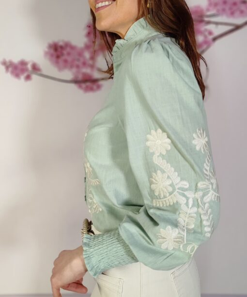 Bordado de flores y en parte delantera y en las mangas…que le da un aire romántico y boho.
