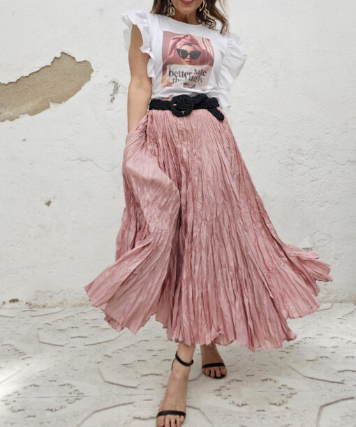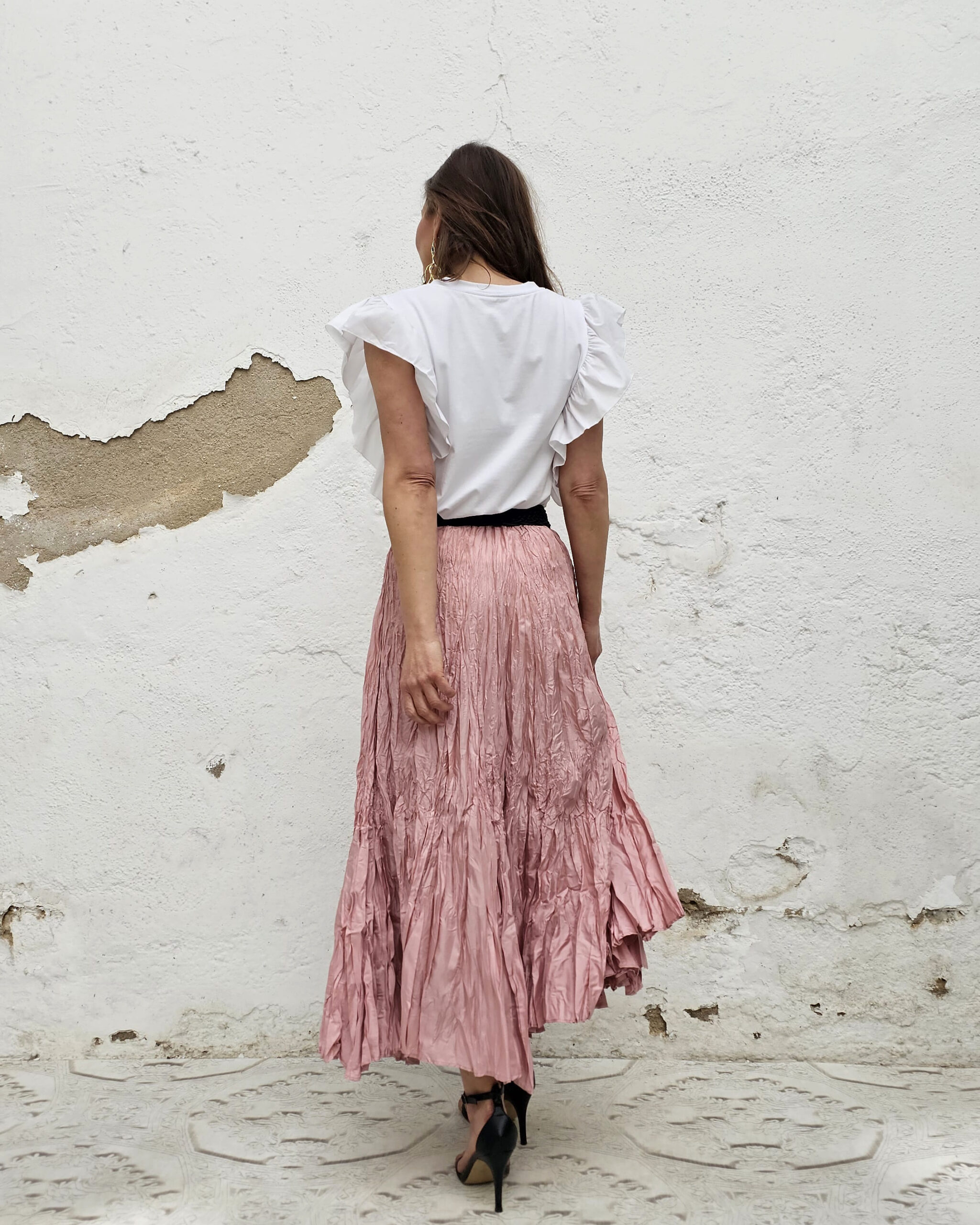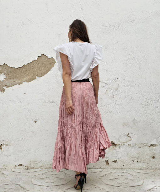Atenta porque la sisa es subida y tranquila que no se te ve el sujetador…lo que pasa es que las mangas de volantón destacan por encima de todo.