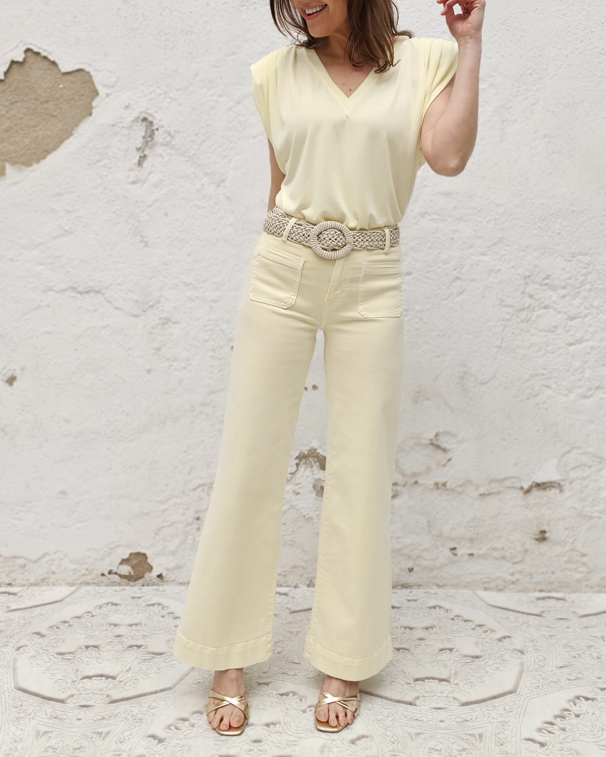 Una camiseta de pico perfecto, hombreras que abarcan todo en hombro hasta dejarse caer levemente hacia el brazo.