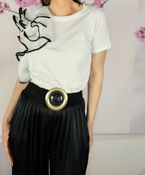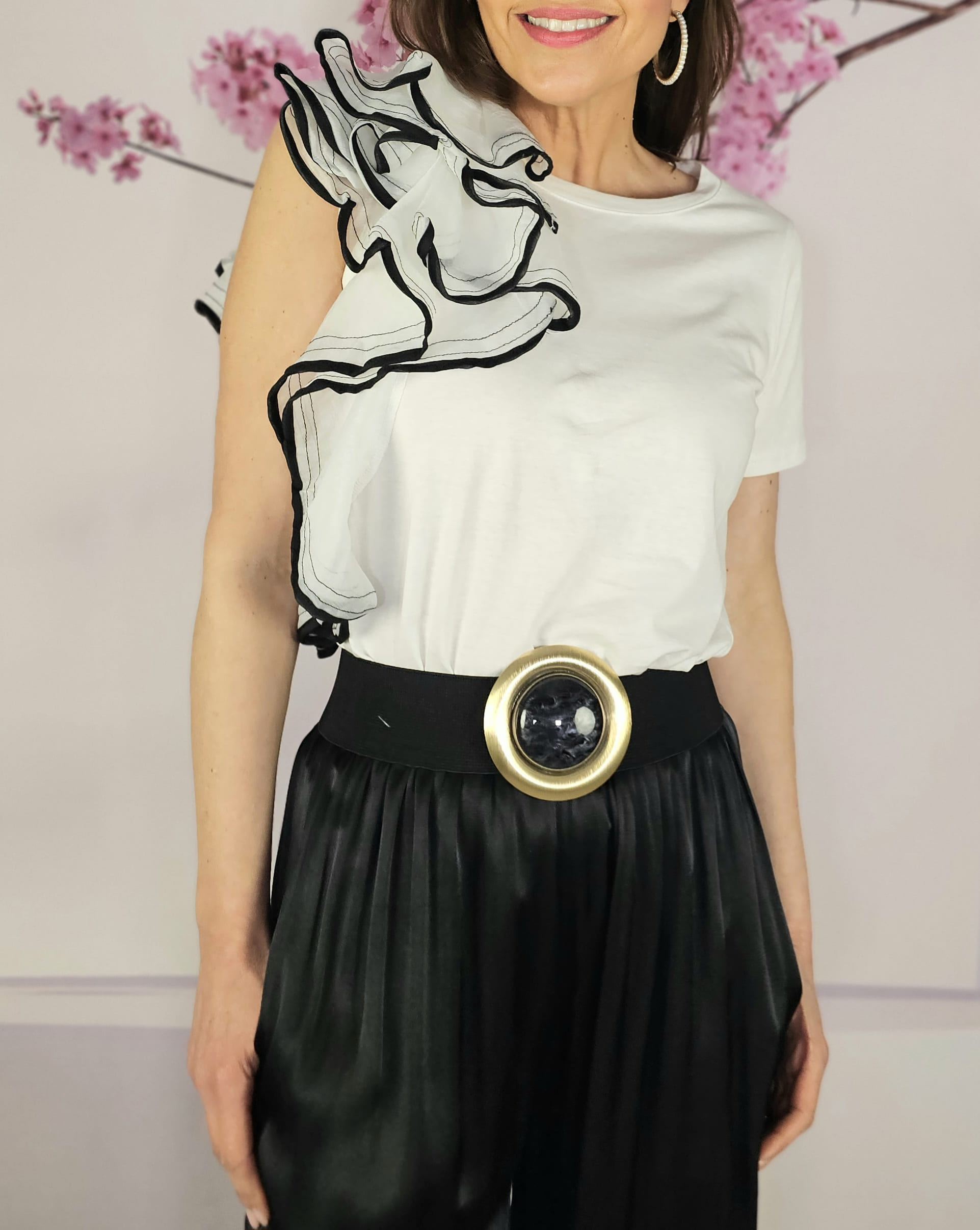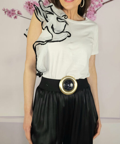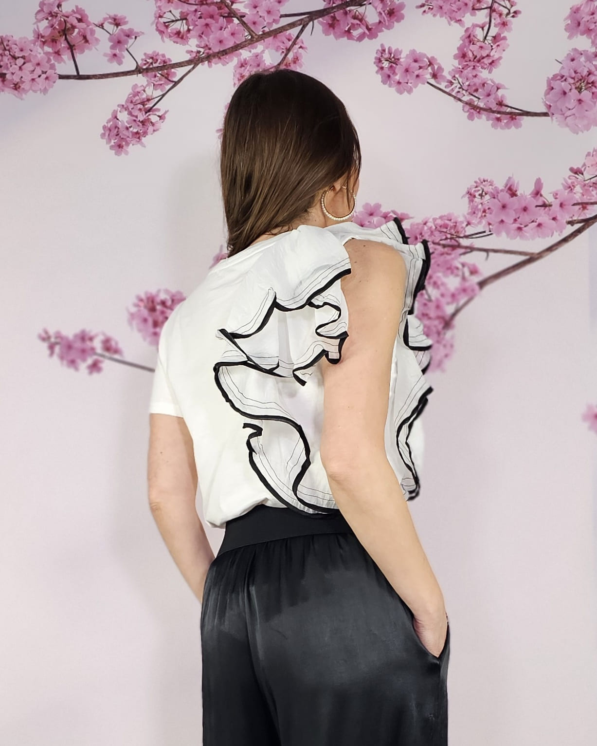 Una chorrrera preciosa recorre todo el lado derecho con un relieve sutil en tono negro.
