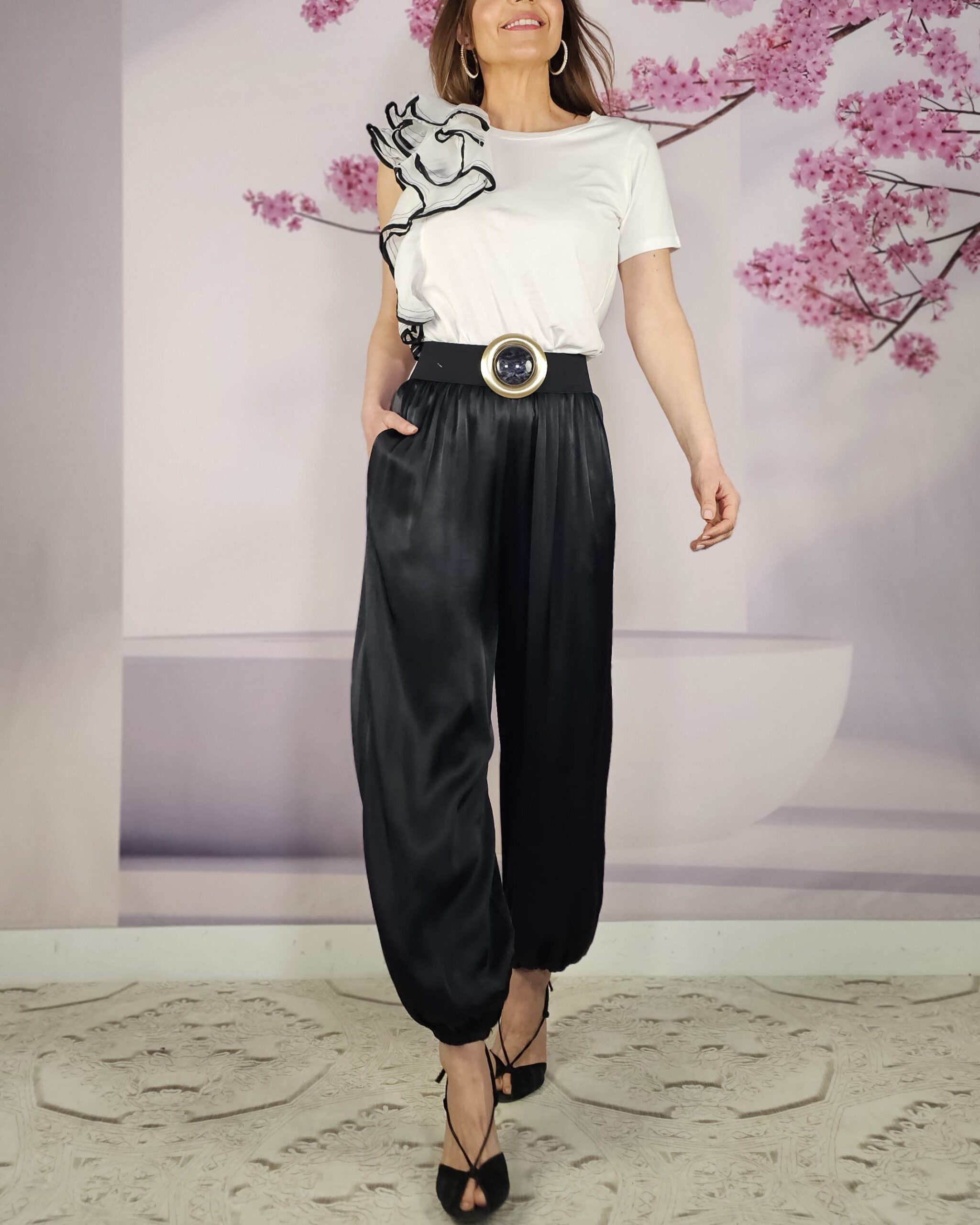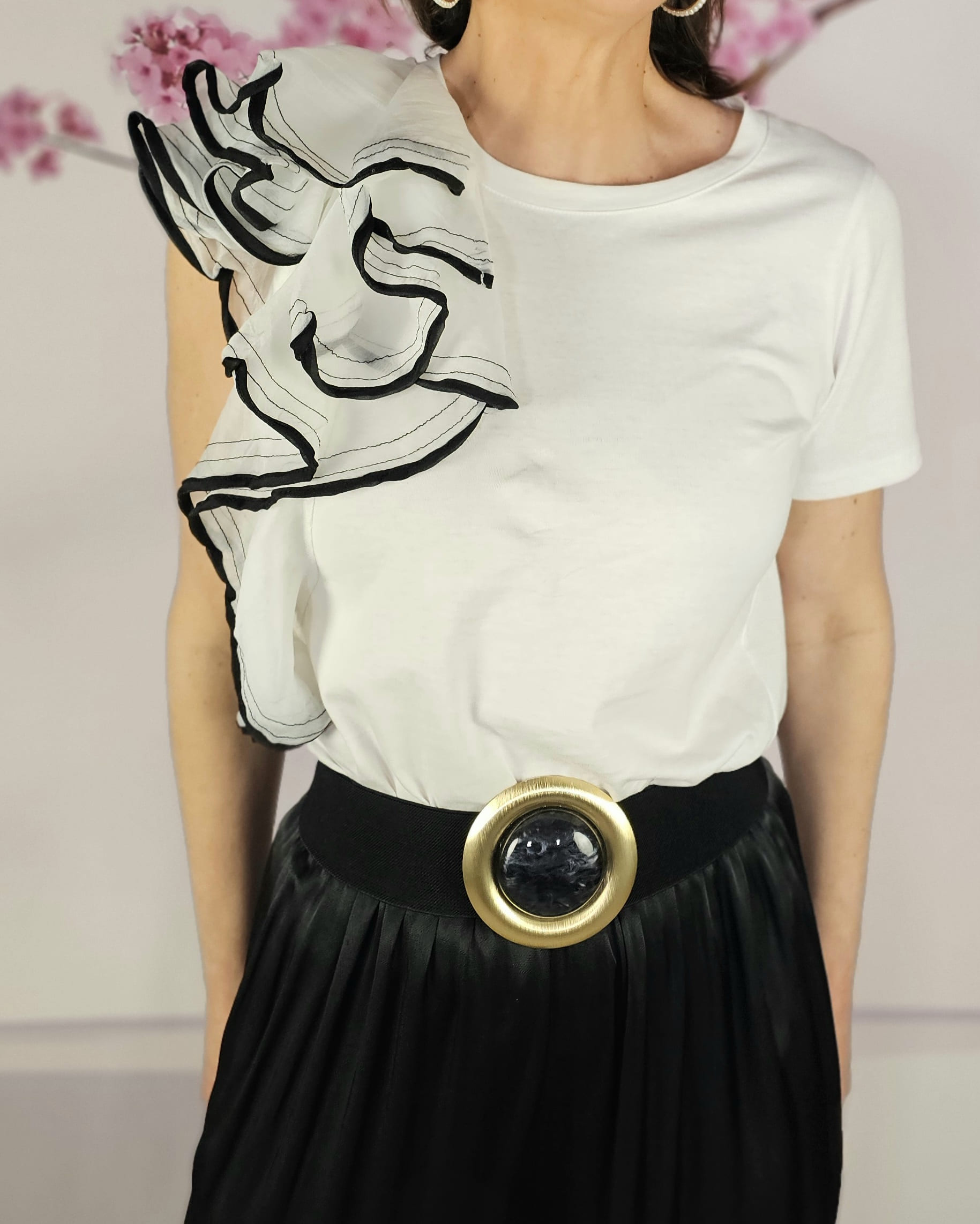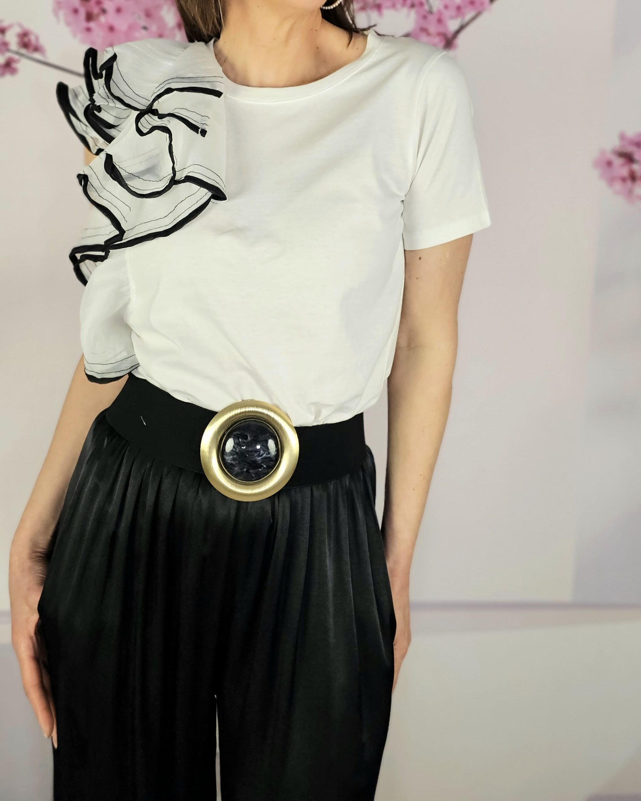 Una chorrrera preciosa recorre todo el lado derecho con un relieve sutil en tono negro.
