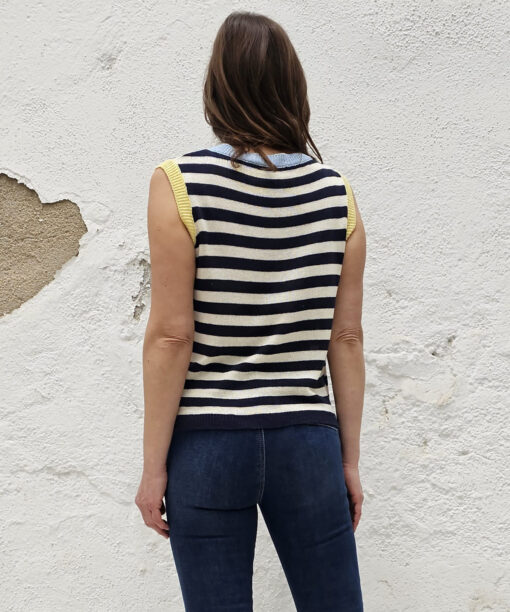 Rayas marineras, cuello celeste, manga amarilla…un absoluto espectáculo y no transparenta nada.