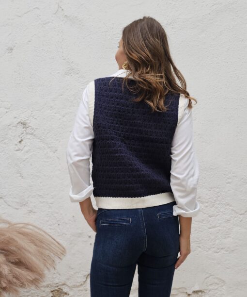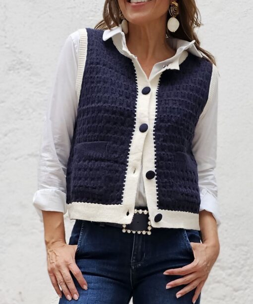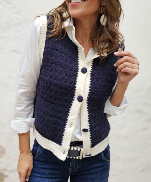 De los de tacto de lanita de toda la vida. En azul marino bordeado en tono crudo y con los botones forrados también en azul marino.