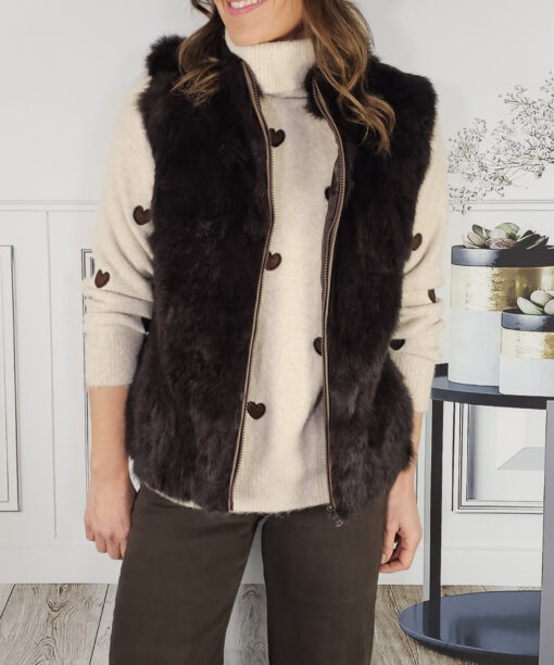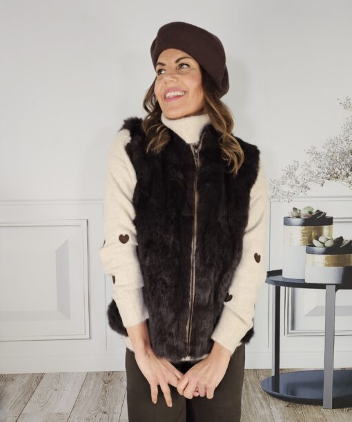 El chaleco Suecia de pelo natural de conejo. Calentito, estiloso, con cremallera y bolsillos en la posición natural de las manos. Forrado en tono marroncito