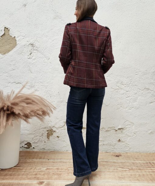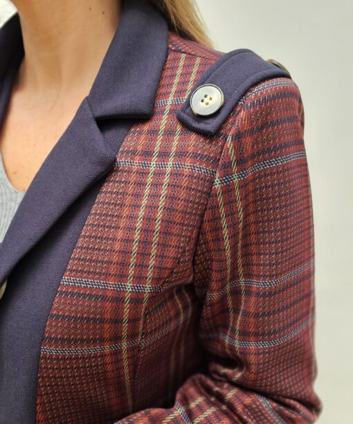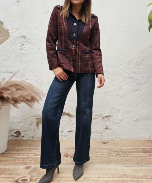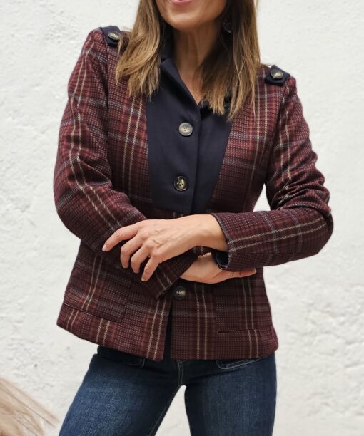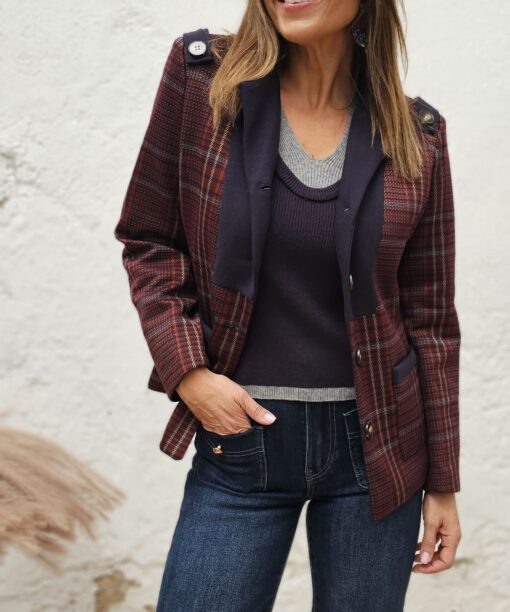 Un cuadro precioso donde predomina en vino tinto con ligeras rayas azules y mostacitas.