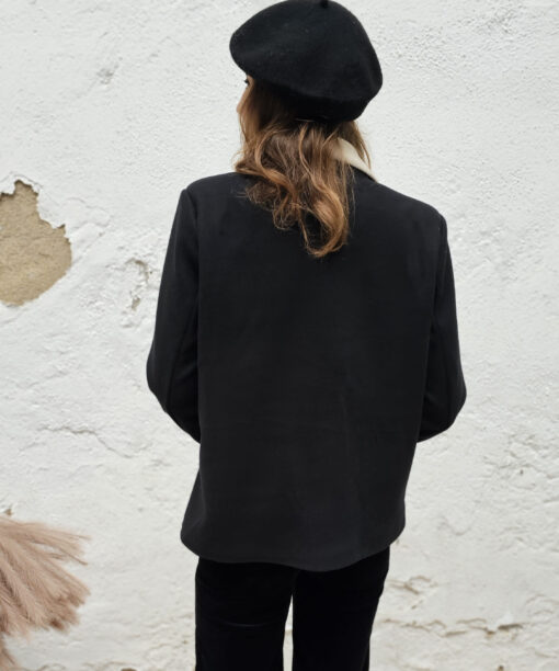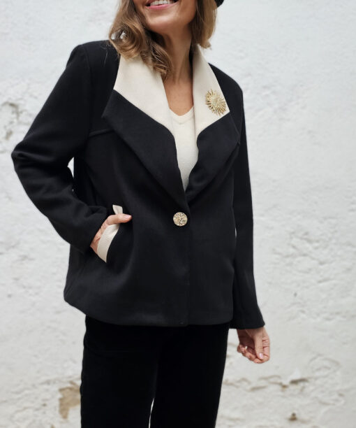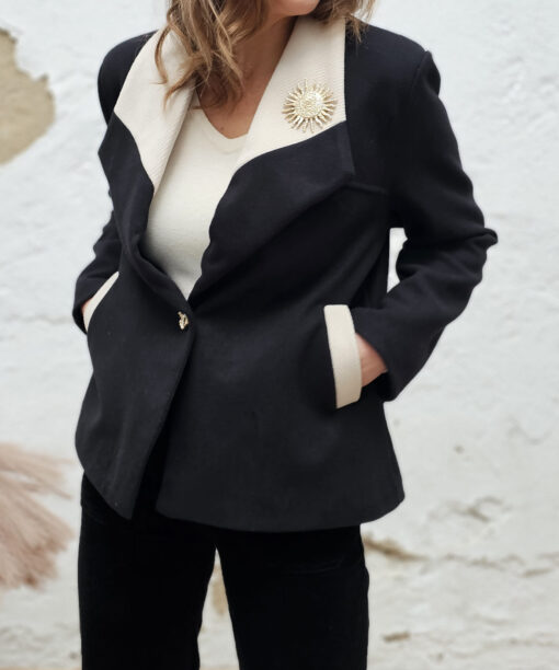 Negro con solapas beige y con un detella importante: Da talla desde la 40 a la 44.