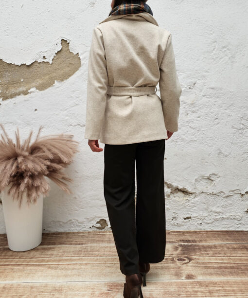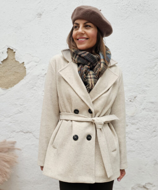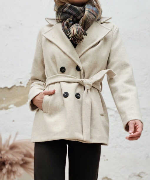 Un chaquetón que cumple todo: Bolsillos en la posición natural de las manos, solapas perfectas y cinturón a juego.