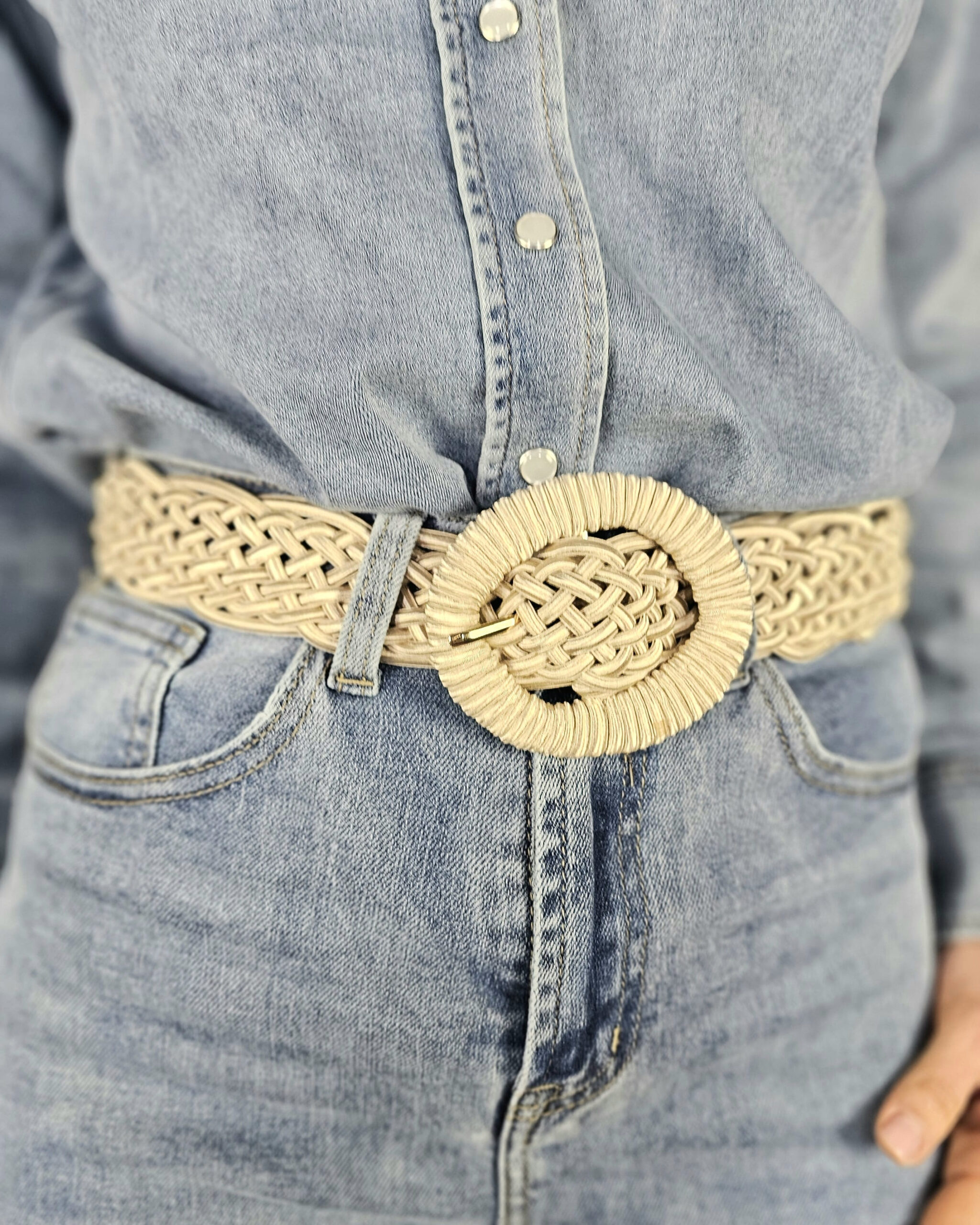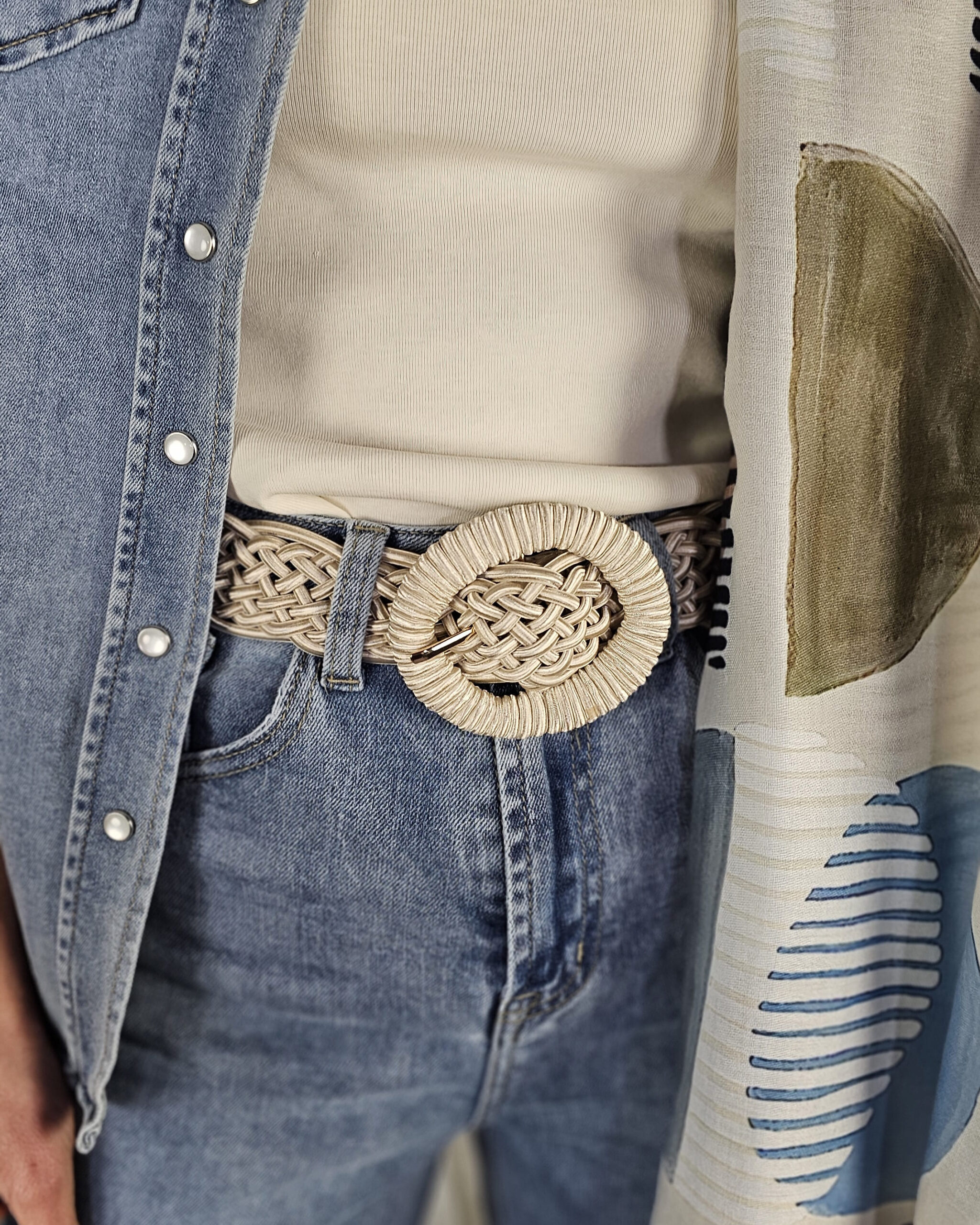 Un cinturón trenzado en tono crema que es una pijada total. Con el Vaquero Naiara queda clavado.
