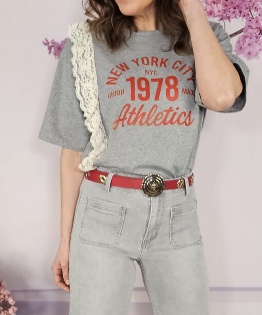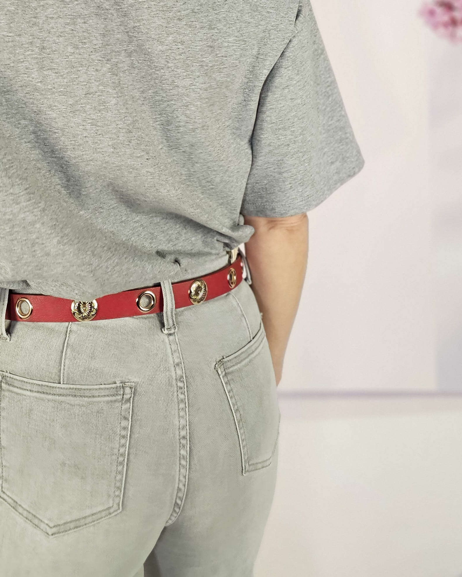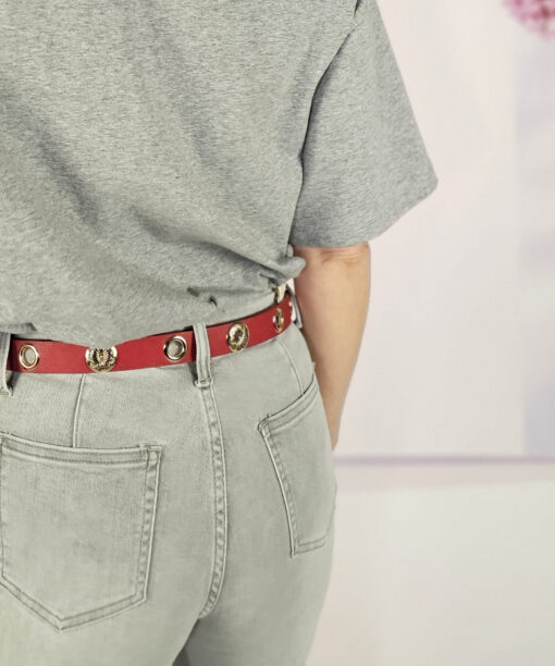 Un cinturón que combina ojales con chapa dorada. Ojal, chapa, ojal, chapa…alrededor de todo el cinturón.