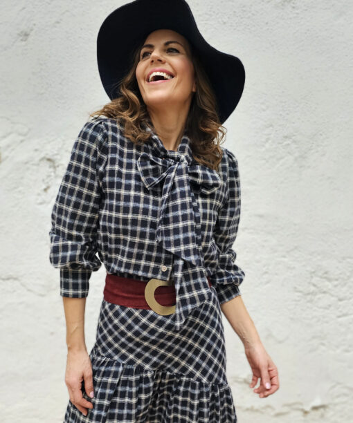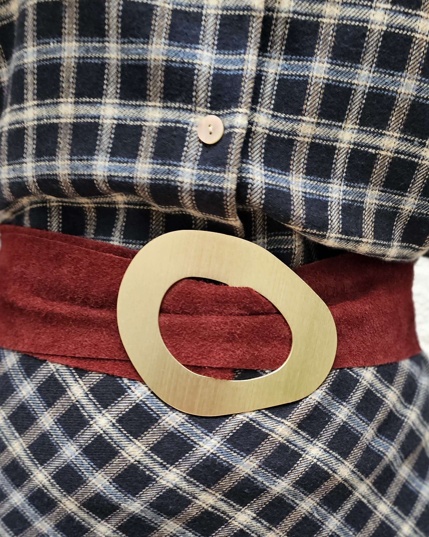 Cinturón de antelina y hebilla grande en dorado.
