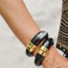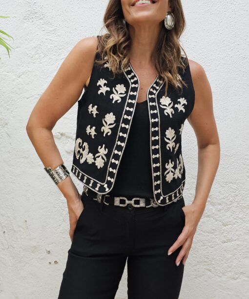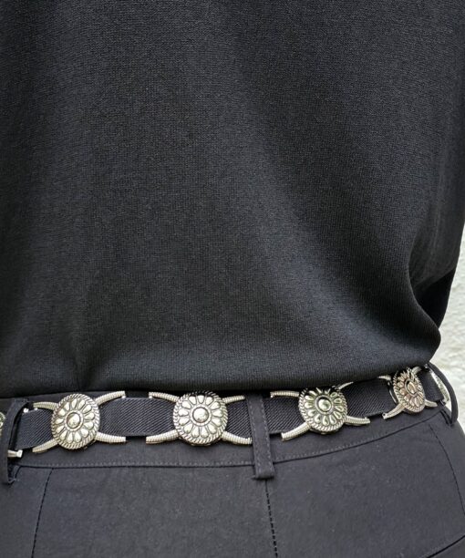 Elástico negro con metal tipo escudo en color plata haciendo un efecto de zig zag.