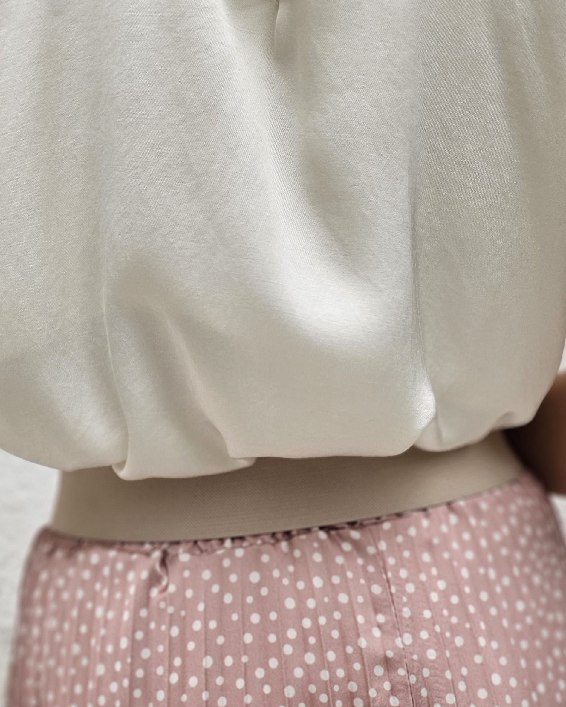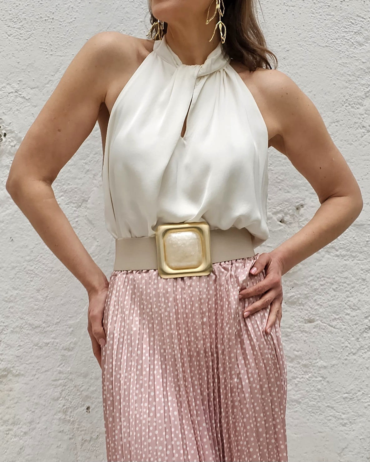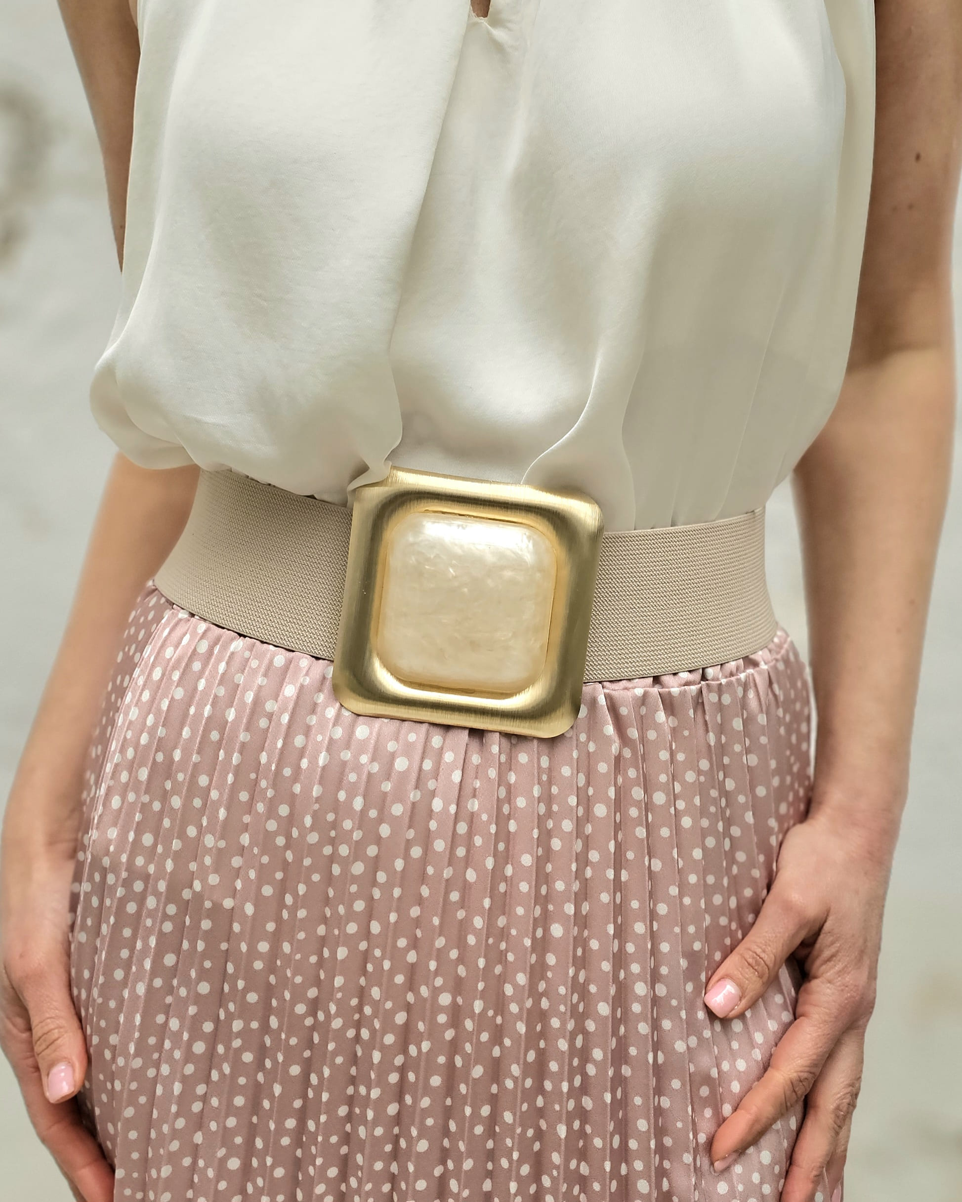 Un cinturón engomado, con hebilla dorada y piedra en color crema. Una maravilla lo mires por donde lo mires