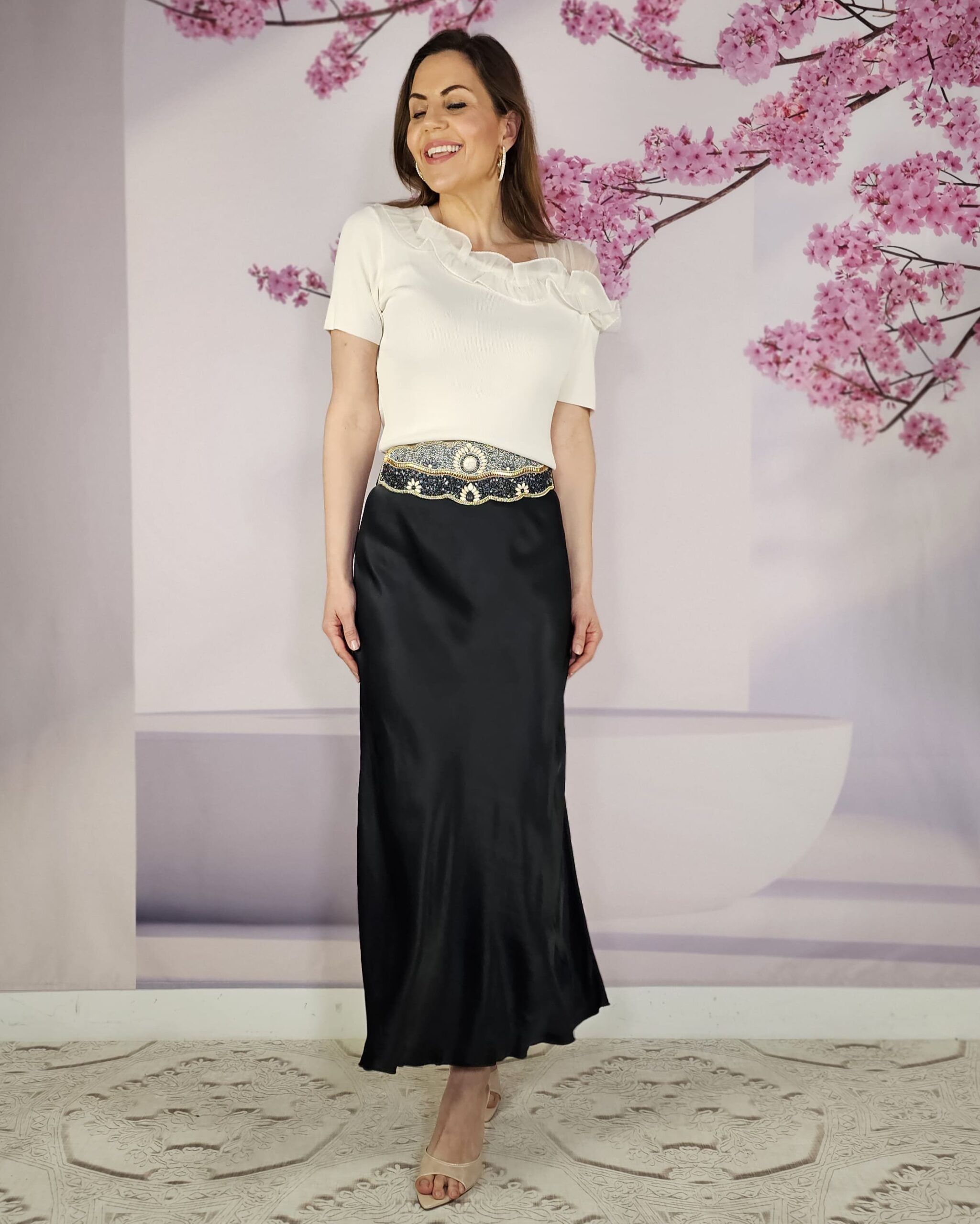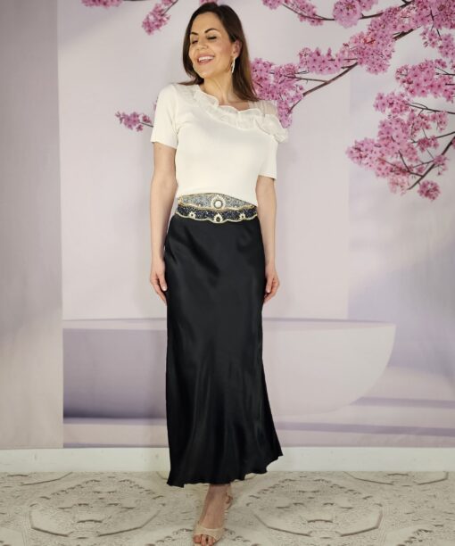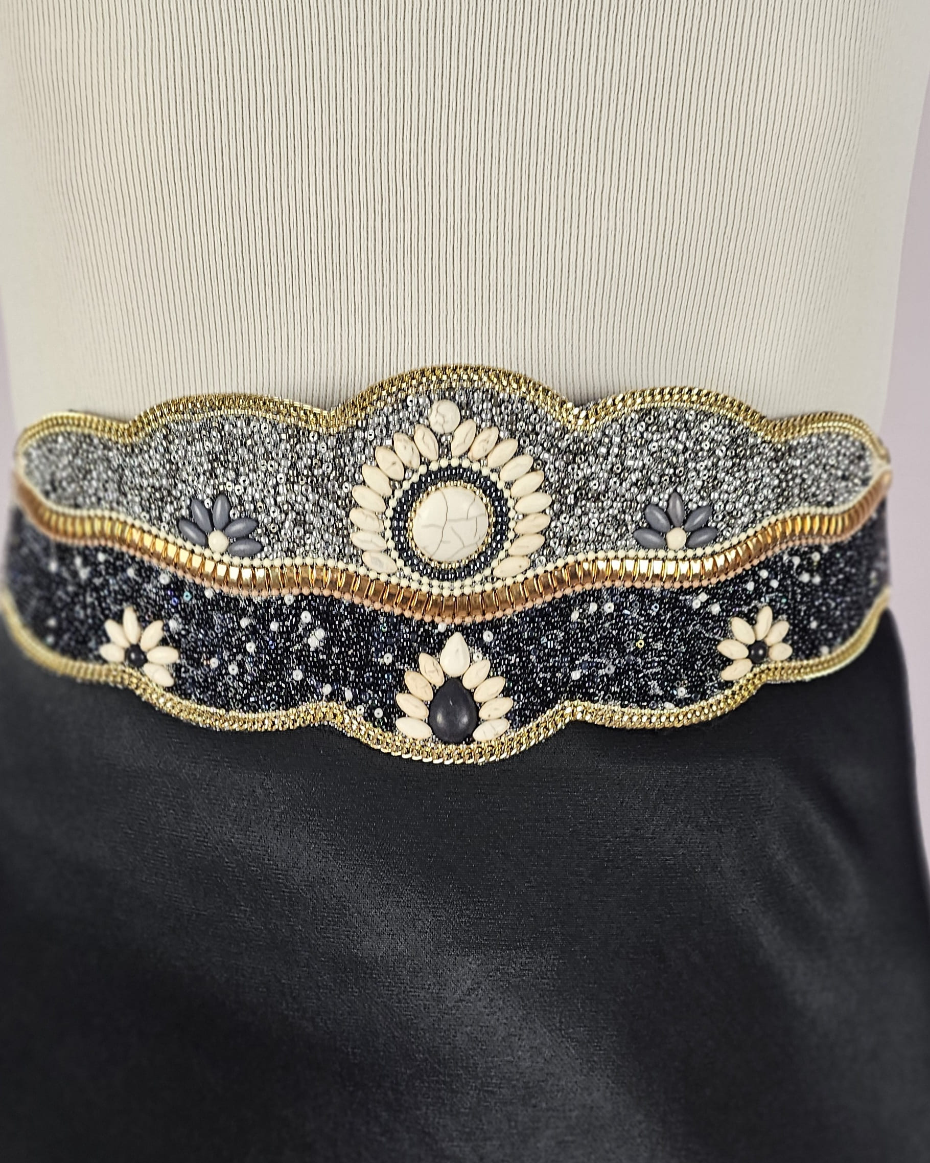 Tipo fajín por delante con pedrería en bicolor: Plata y negro.