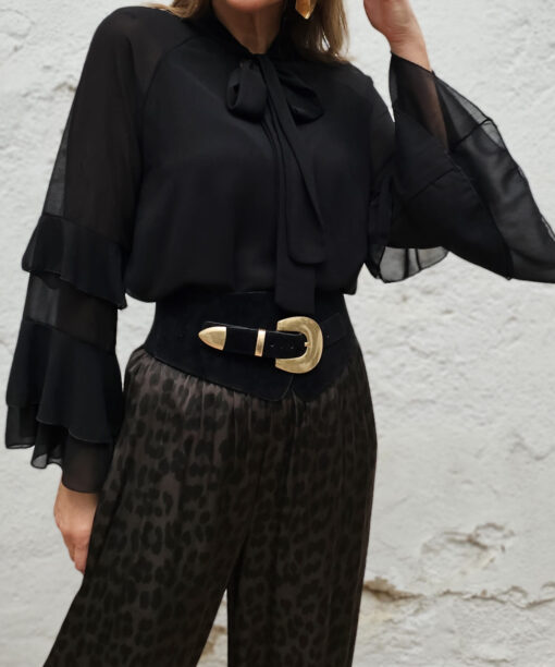 Es un cinturón de serraje con hebilla dorada. Una pasada de cinturón que le da a tu look forma.
