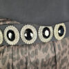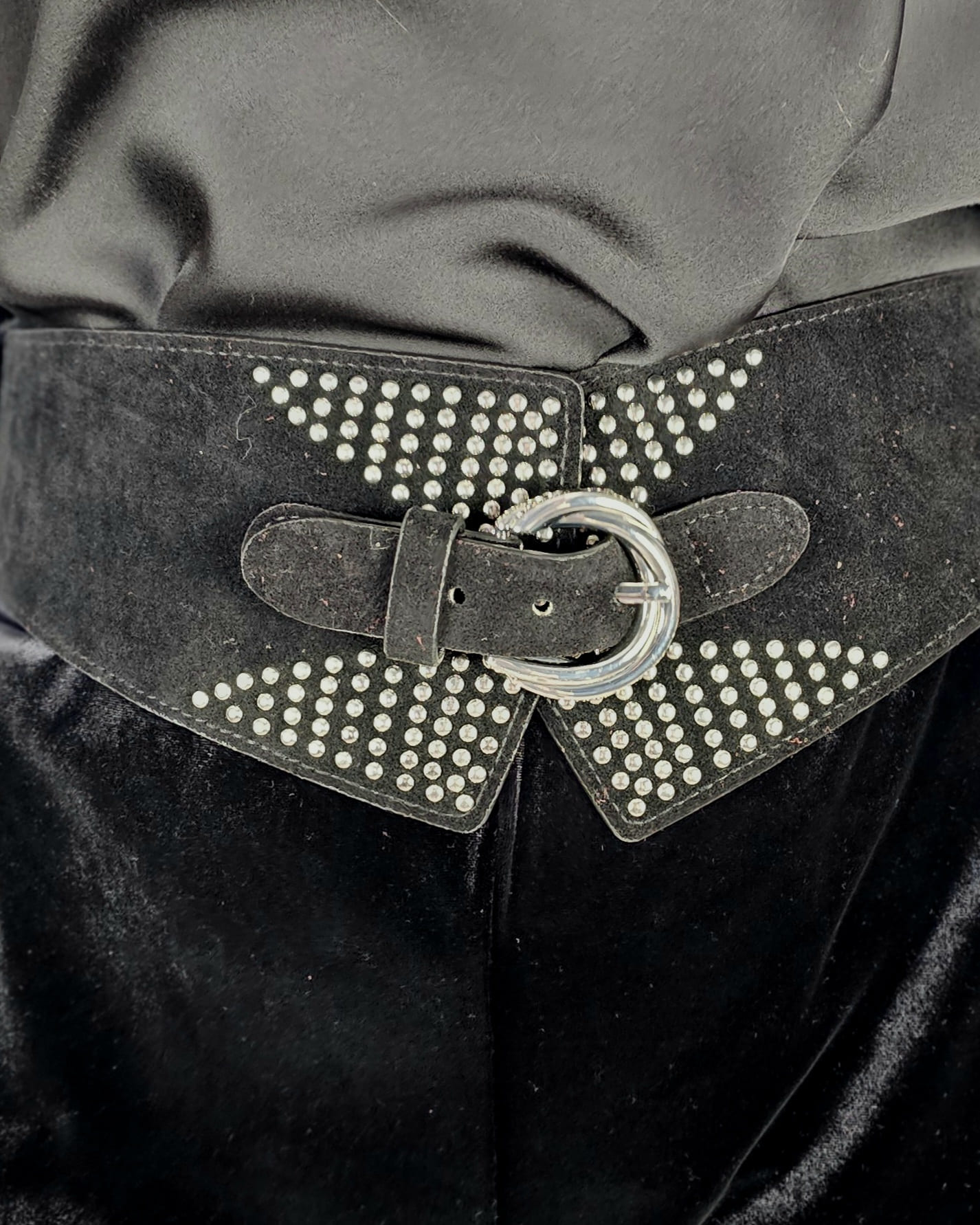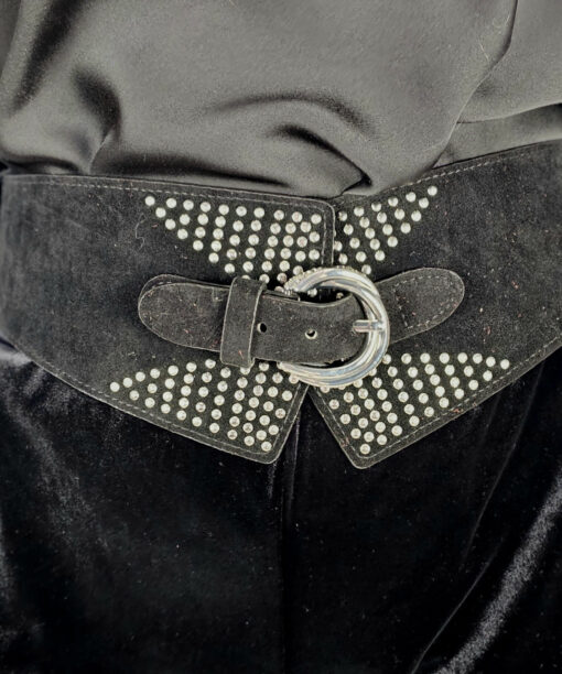 Hebilla y strass plateada en un cinturón de ante engomado.