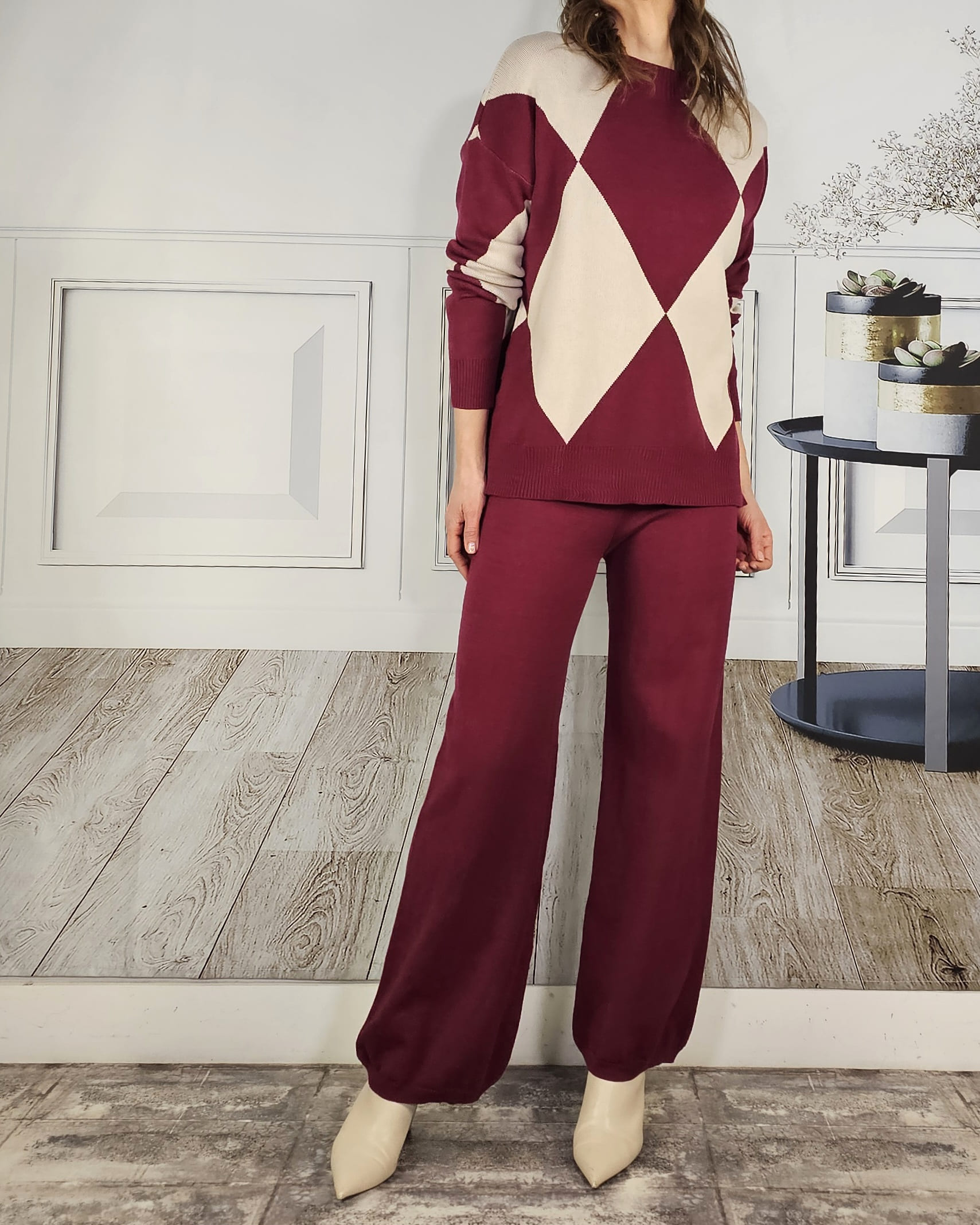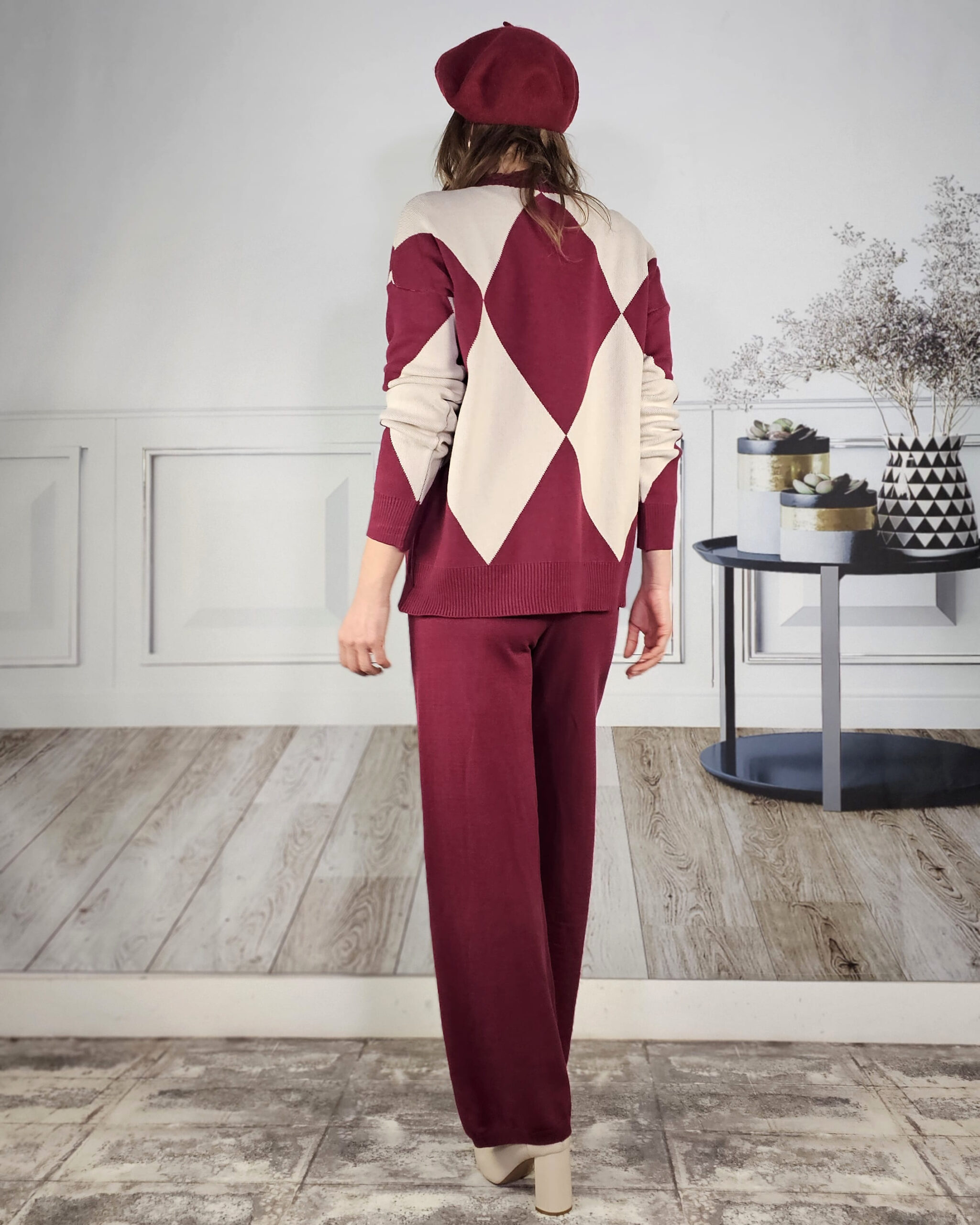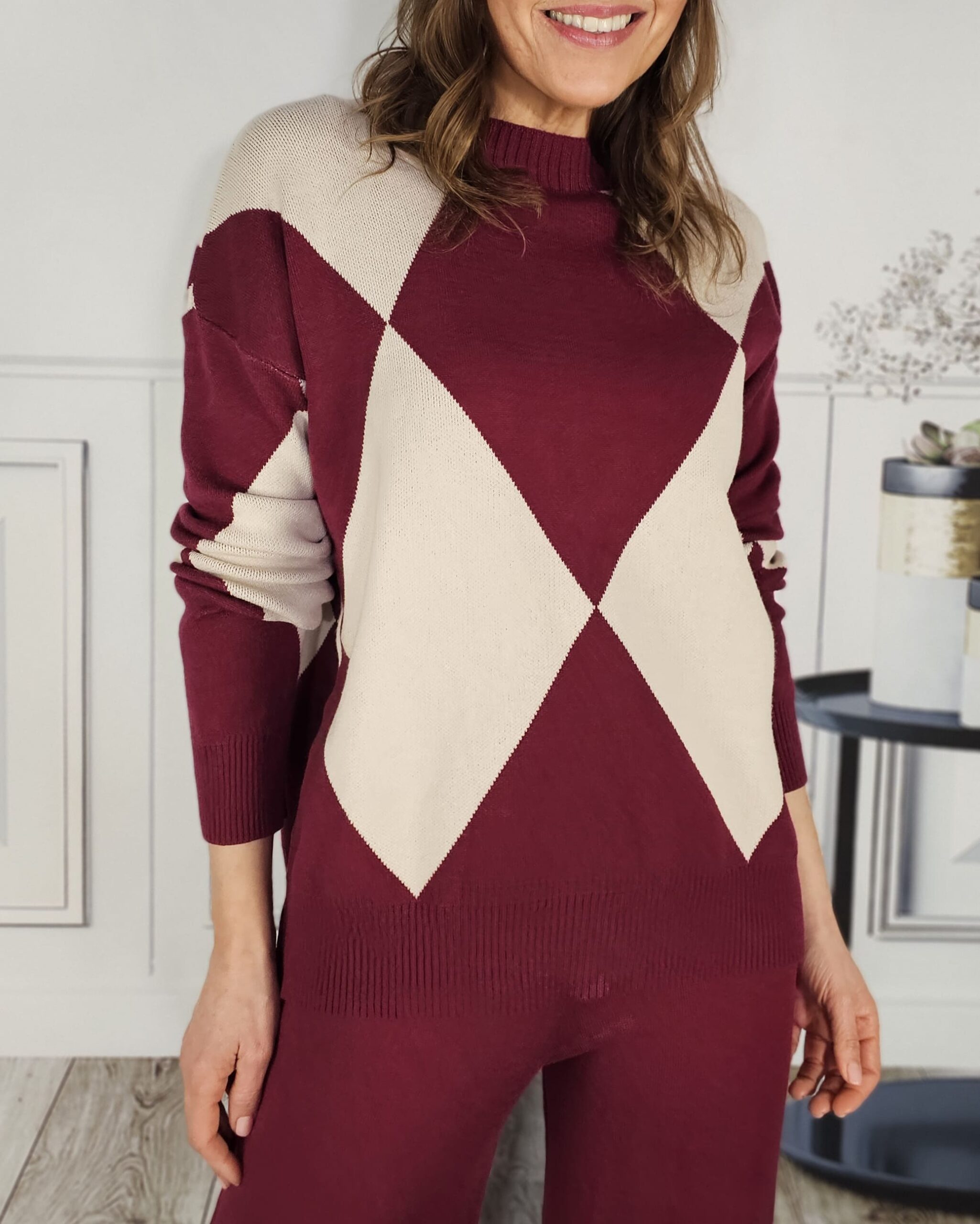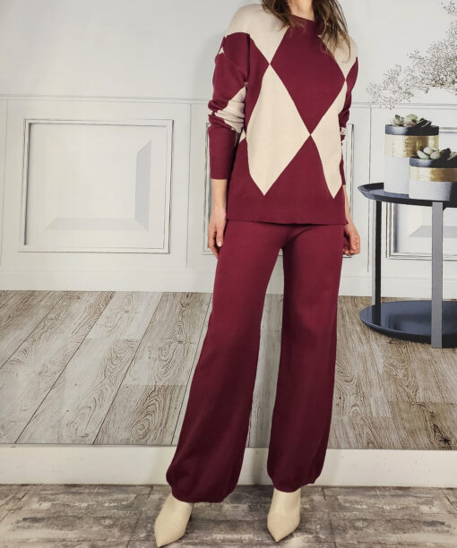 Tono vino tinto. Pantalón listo recto y jersey de cuello redondo con dibujo de rombos alrededor de todo el cuerpo.
