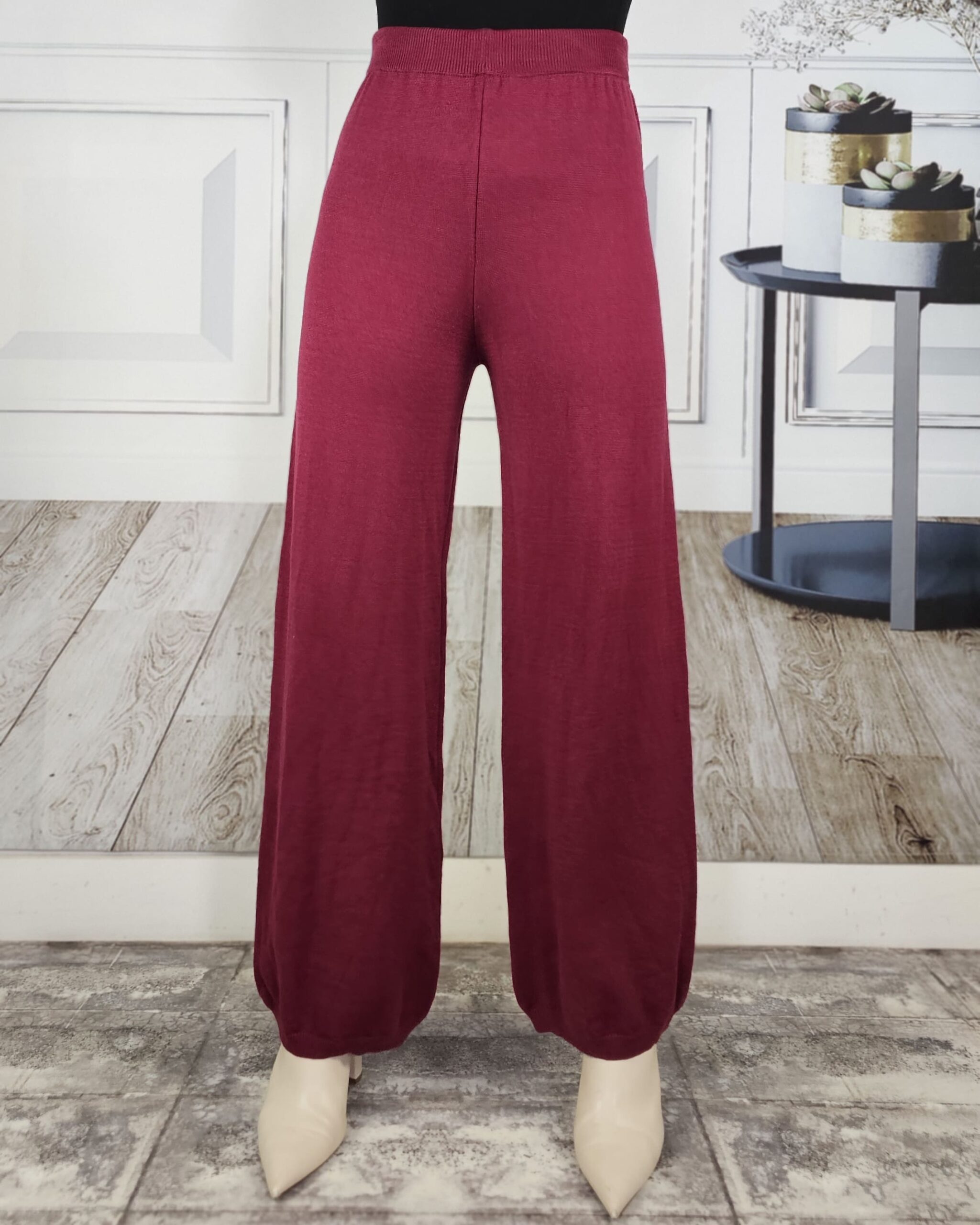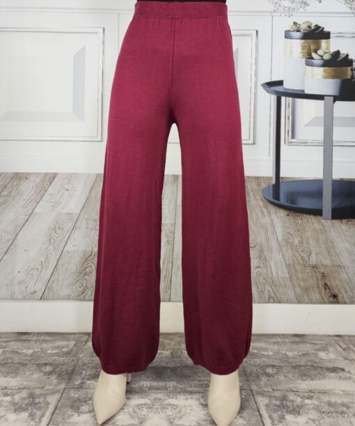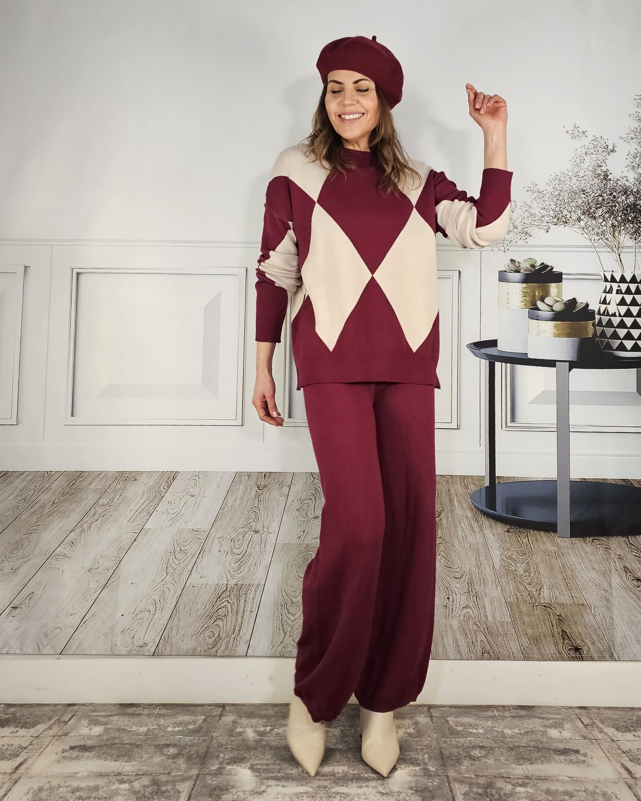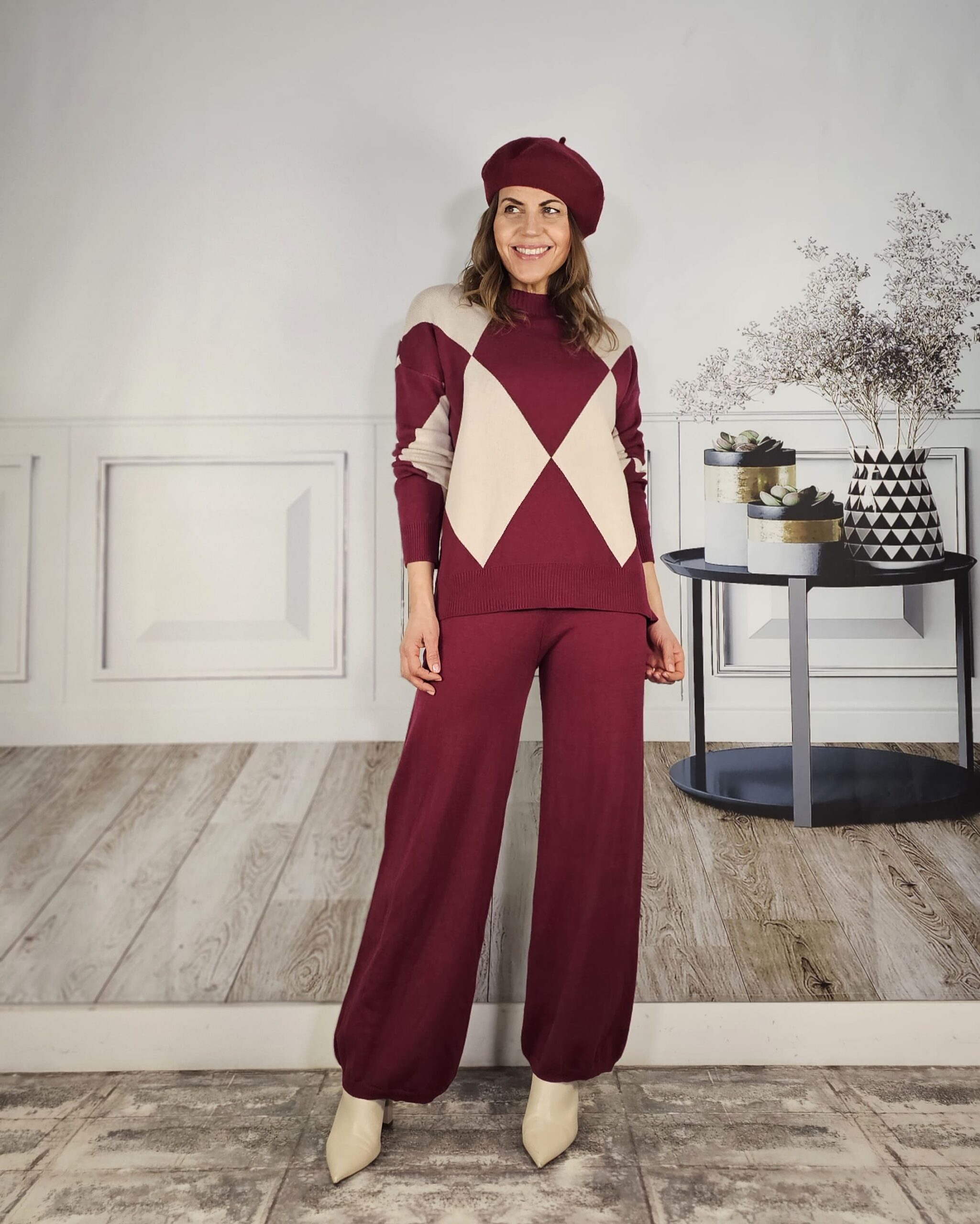Tono vino tinto. Pantalón listo recto y jersey de cuello redondo con dibujo de rombos alrededor de todo el cuerpo.