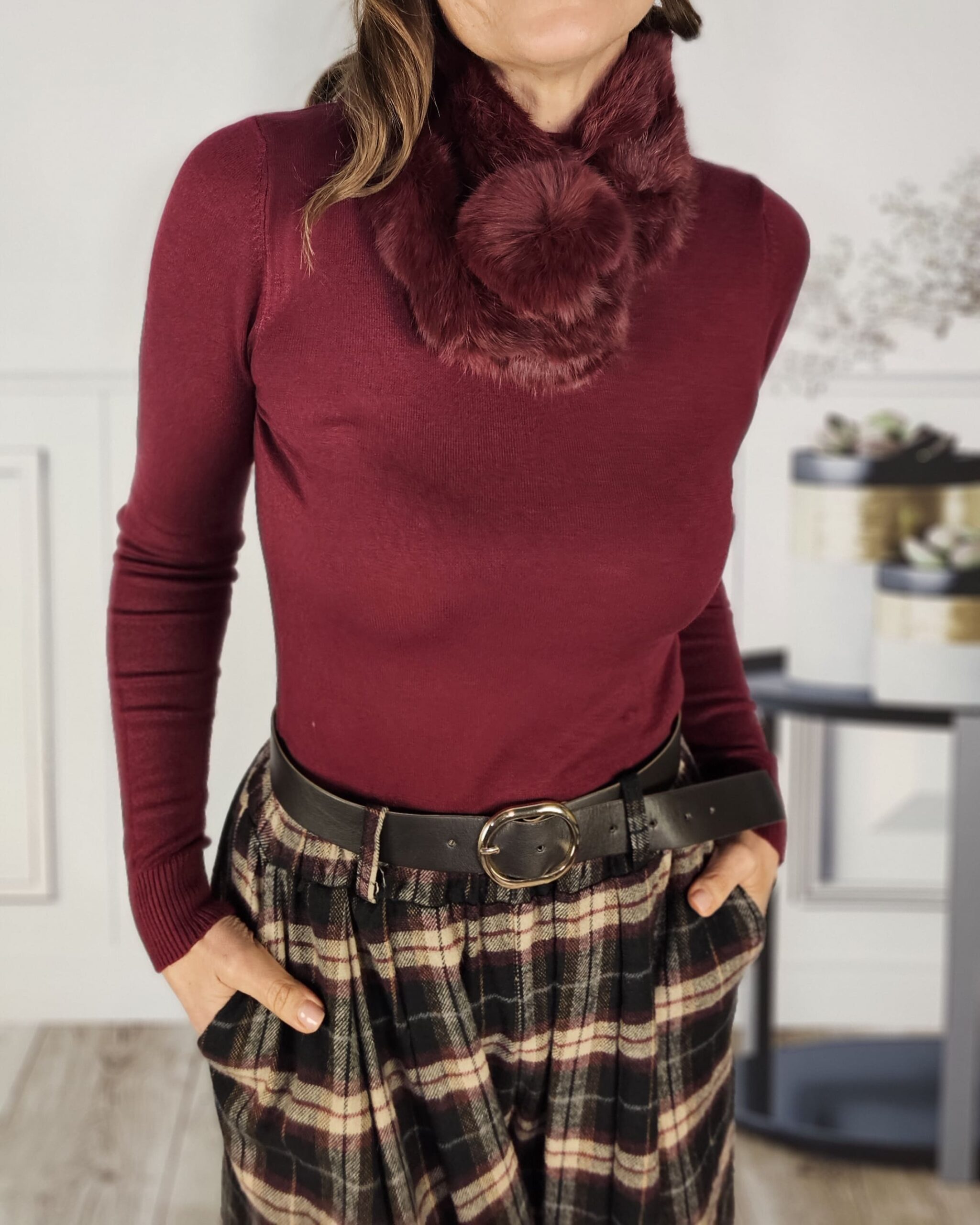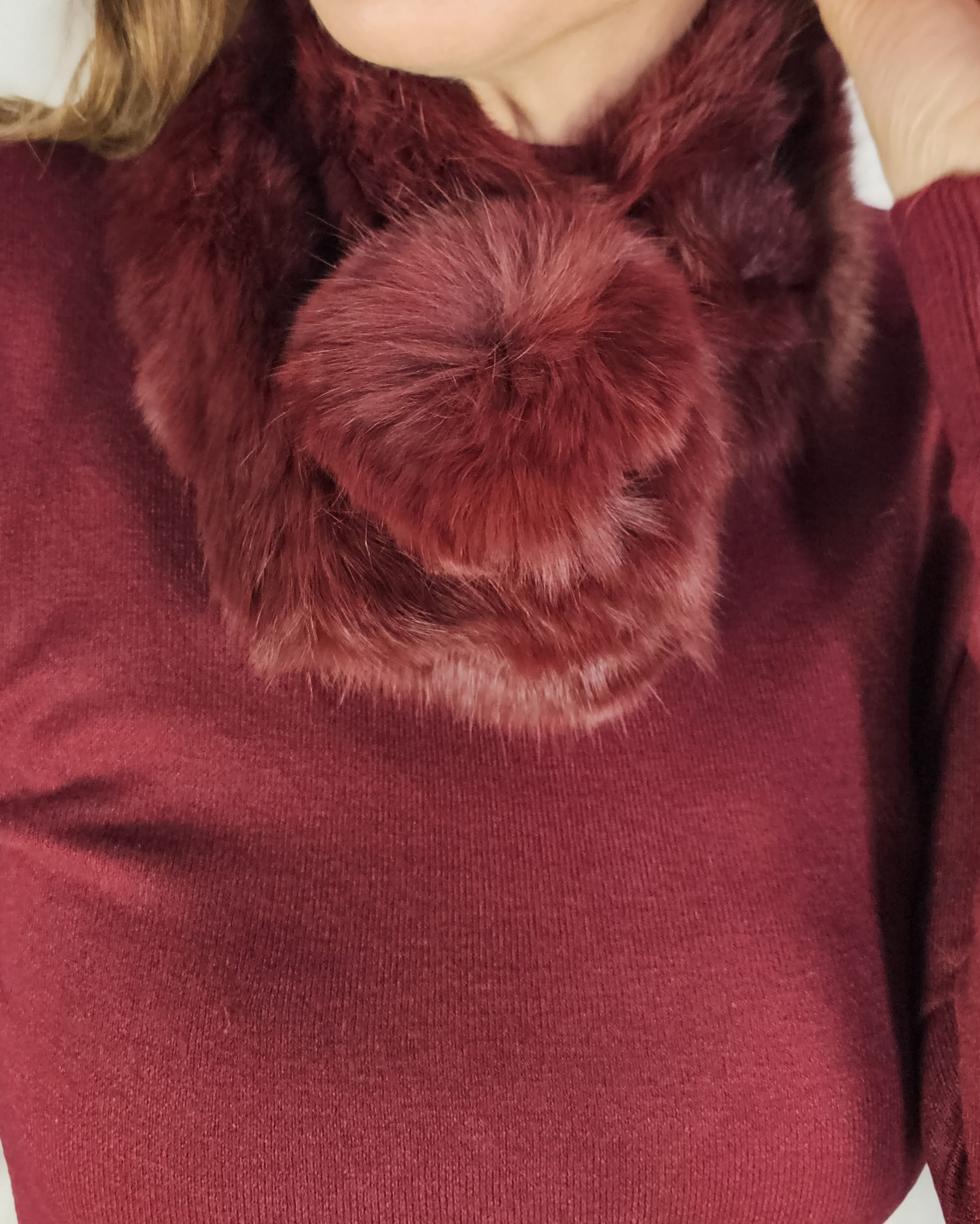 Un cuellecito de pelo natural con borlón que se entrelaza con el cuello.