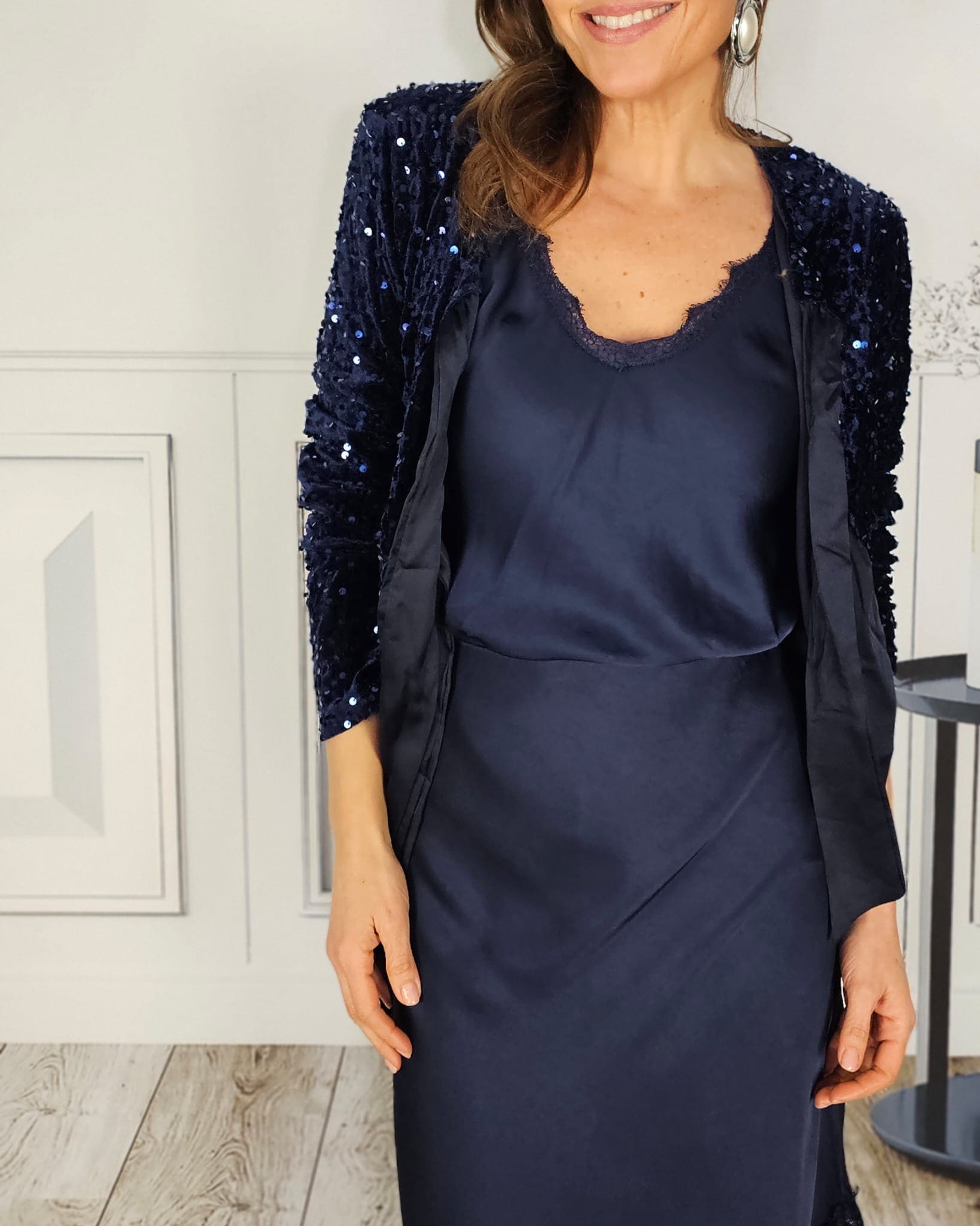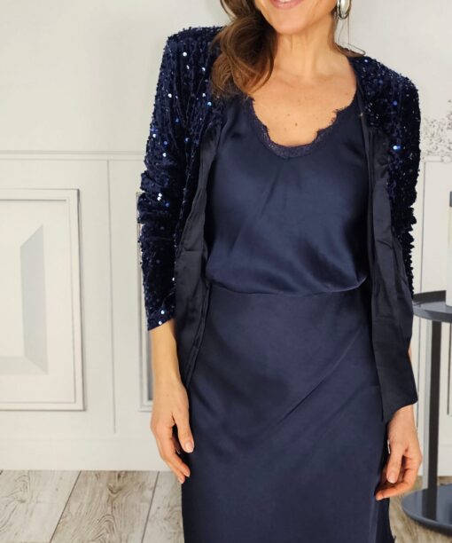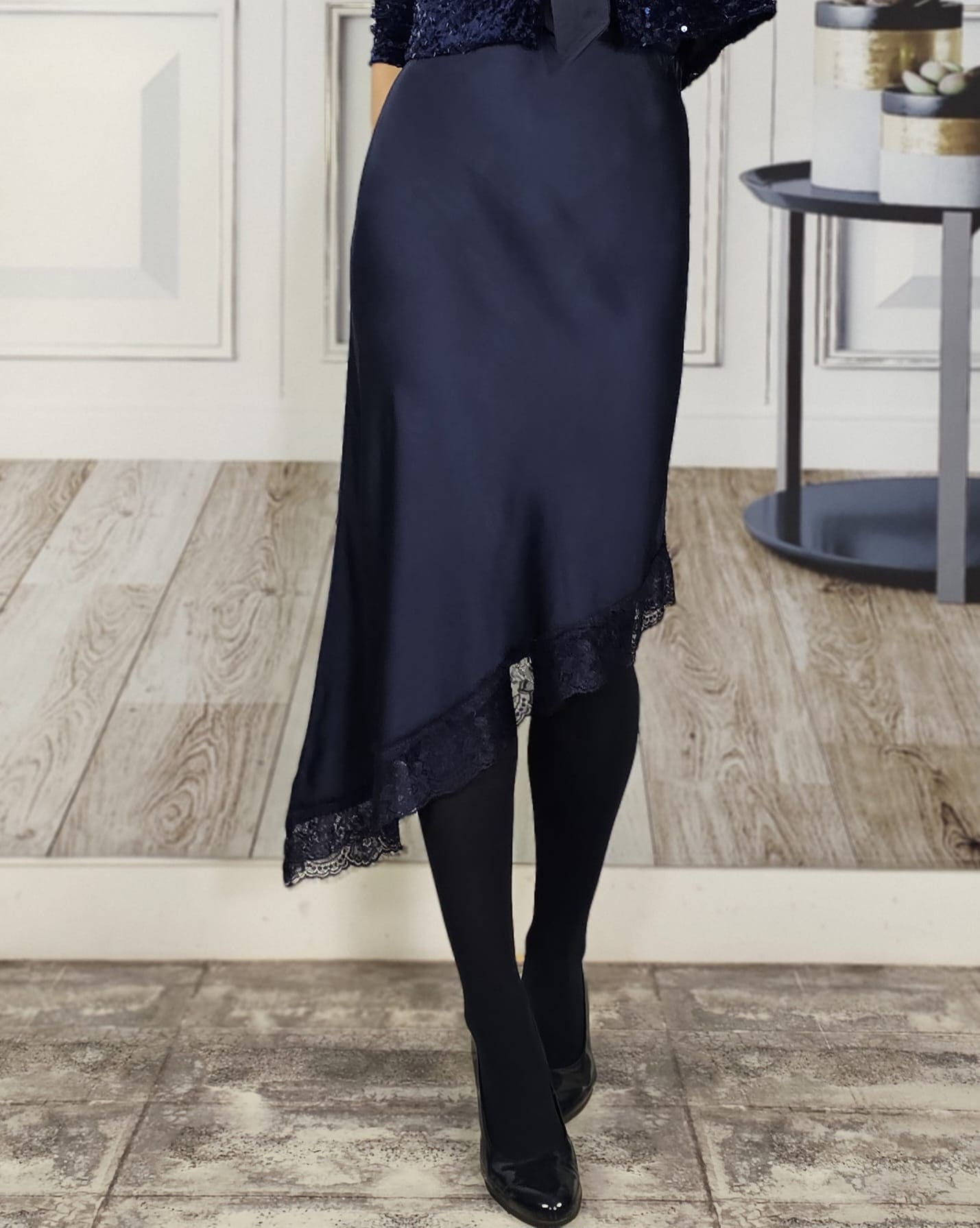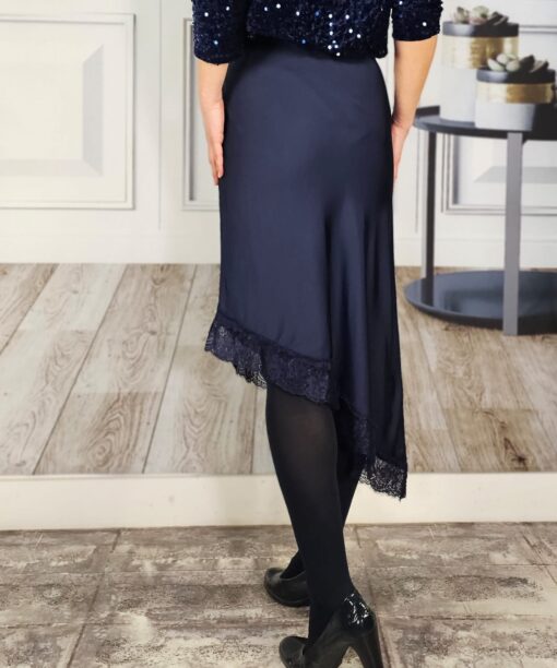 Raso, largo asimétrico con encaje a juego, cortada al bies (no se ve la costura).