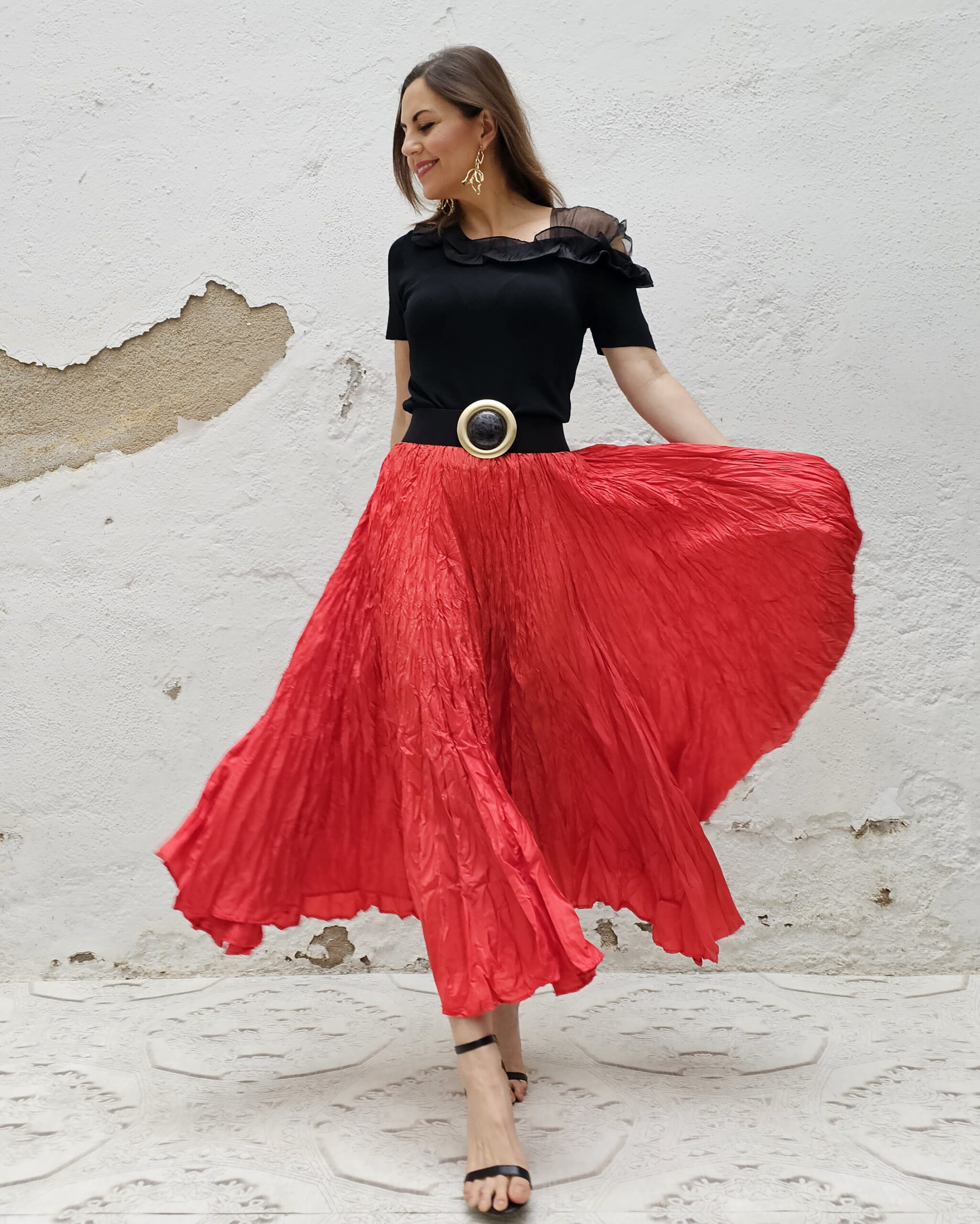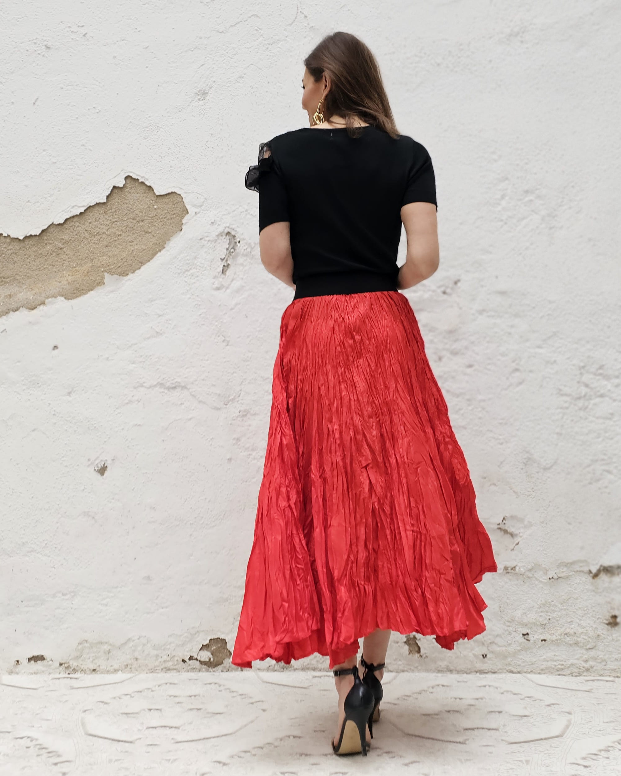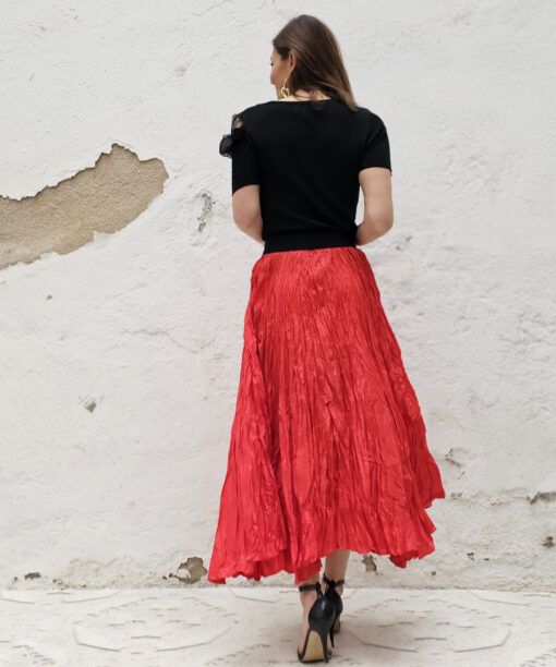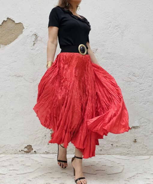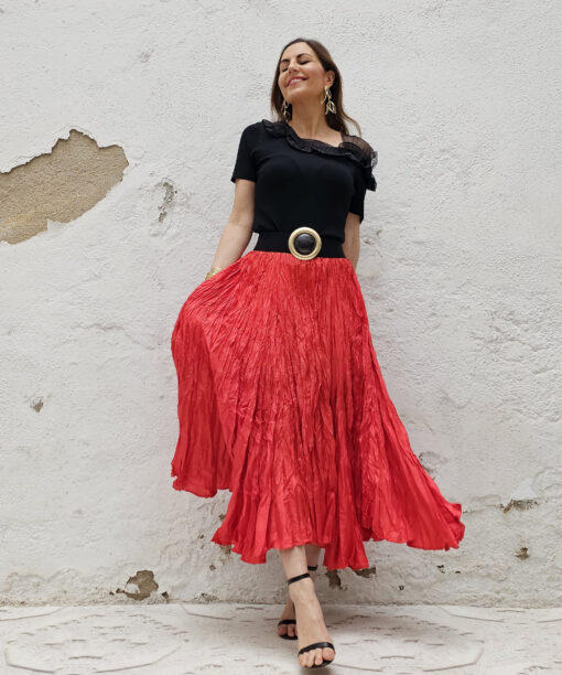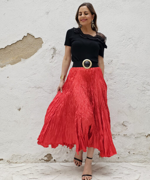 Una falda plisada con efecto arrugado permanente, lo que le da un movimiento espectacular.