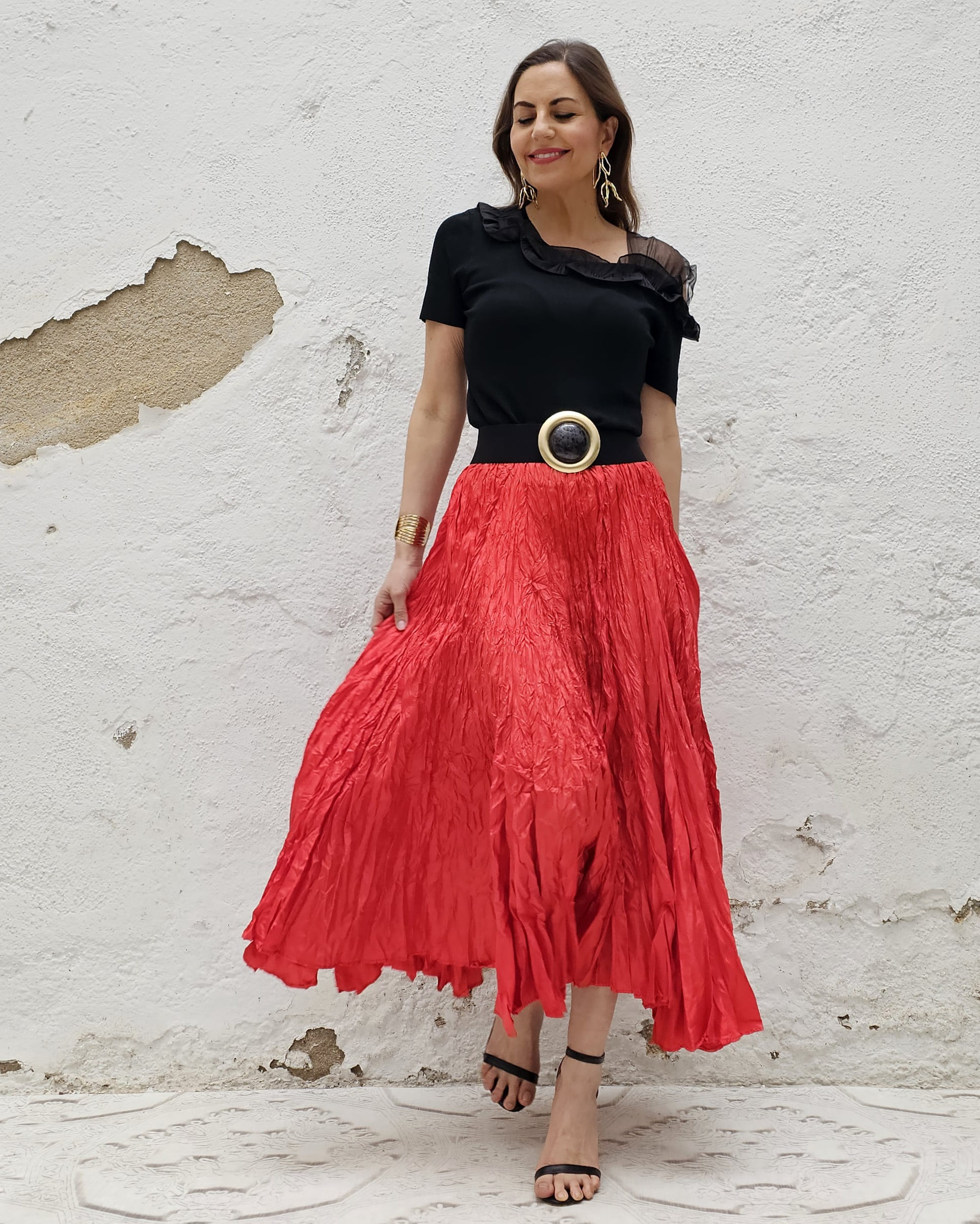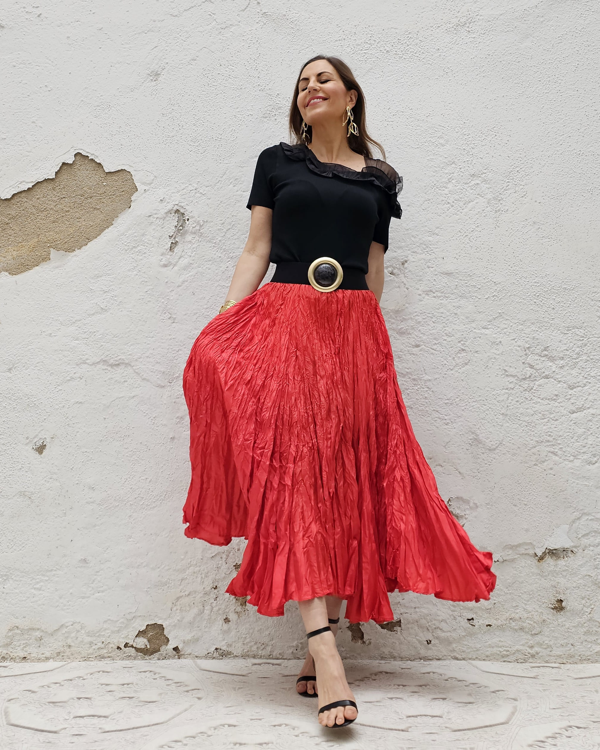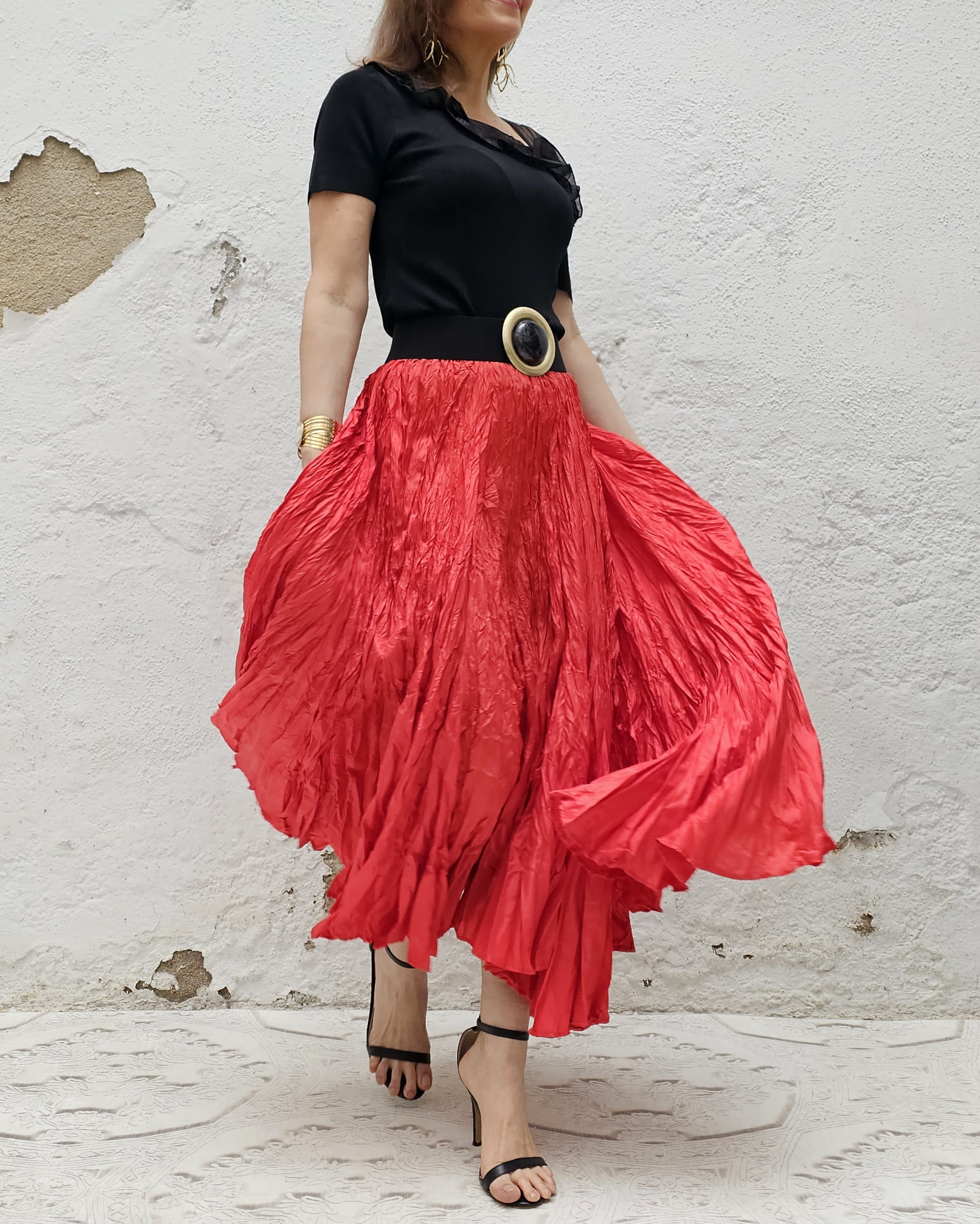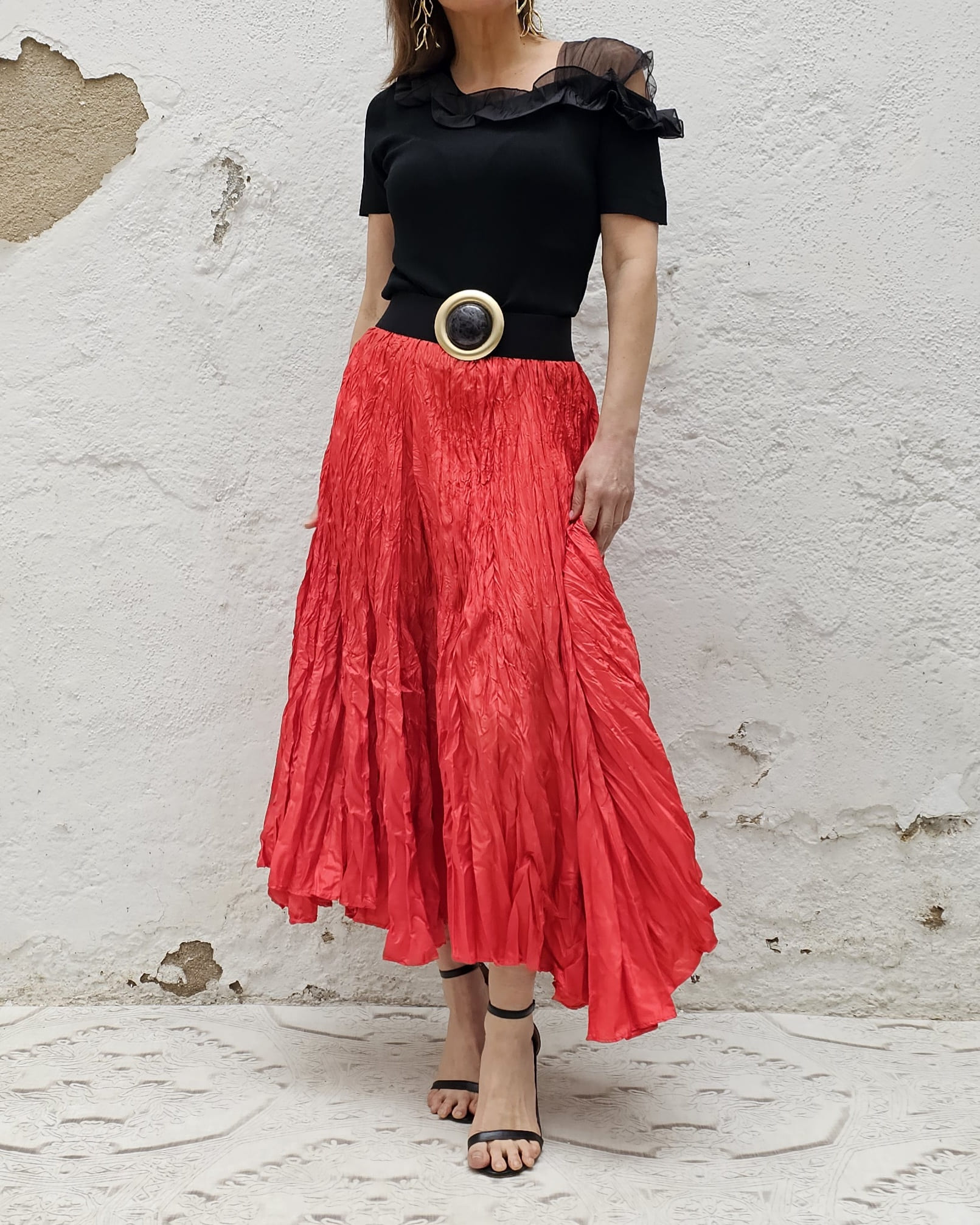 Una falda plisada con efecto arrugado permanente, lo que le da un movimiento espectacular.