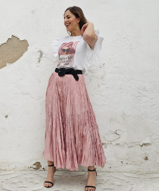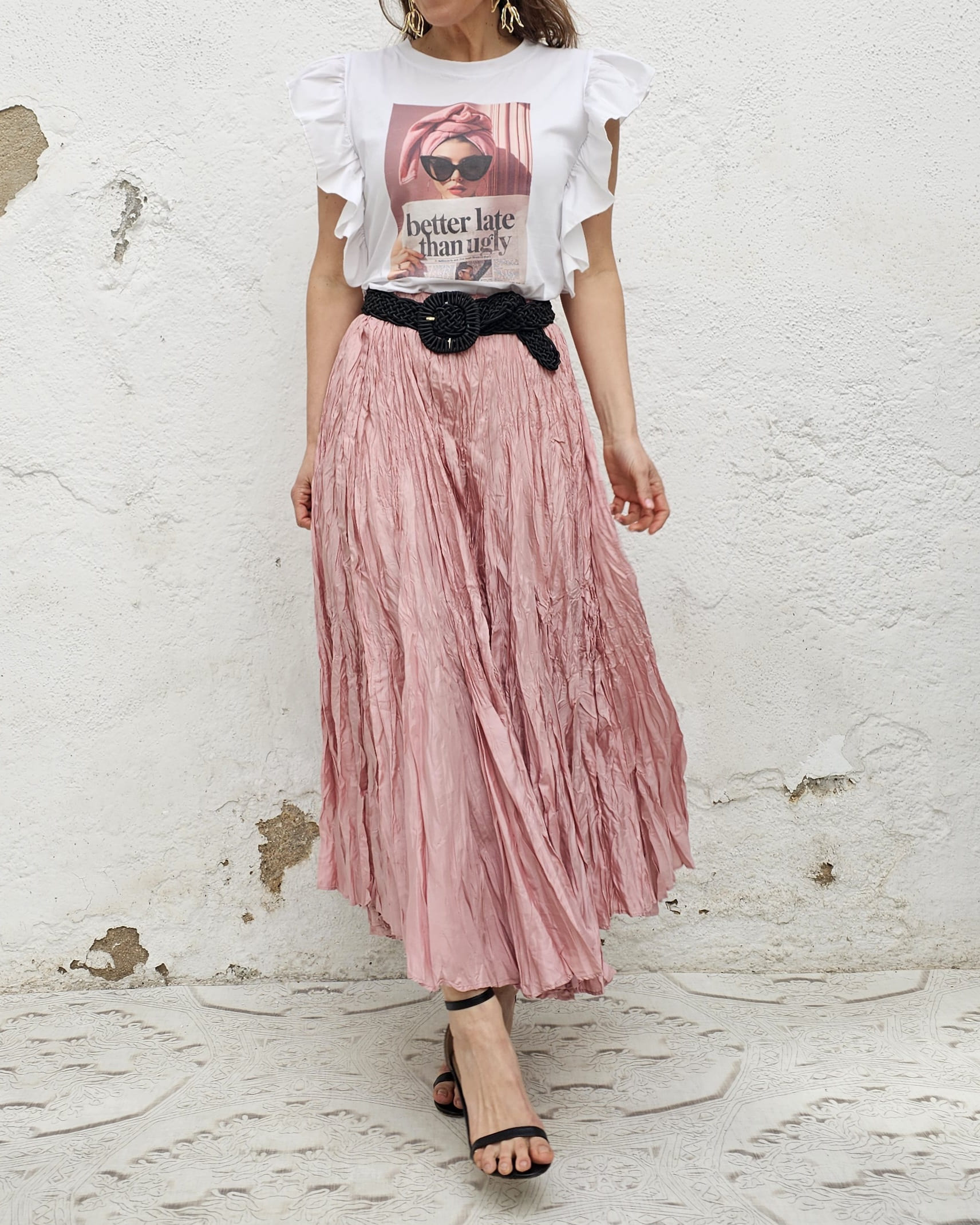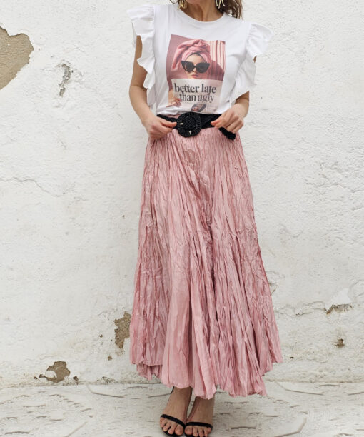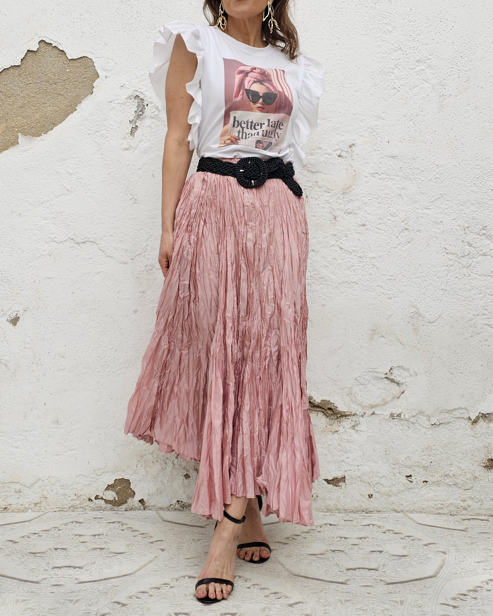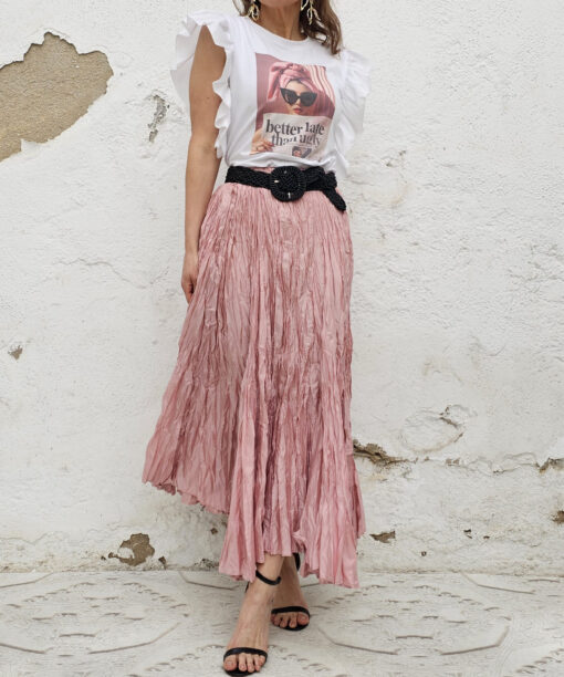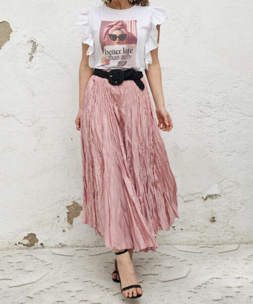 Una falda plisada con efecto arrugado permanente, lo que le da un movimiento espectacular.