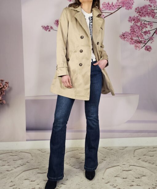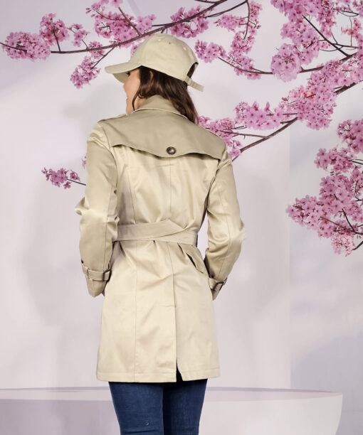 Doble botonadura en la parte delantera con botones color madera suave. Bosillos en la posición natural de las manos, cinturón a juego del mismo tono y puños ajustables con tira y hebilla.