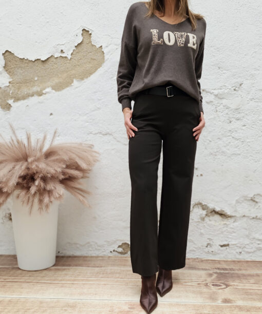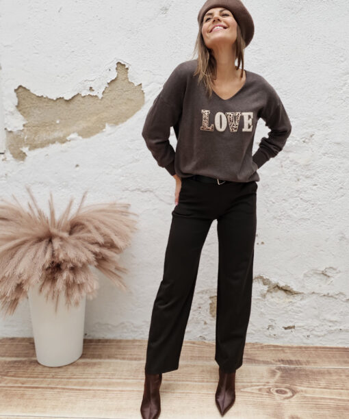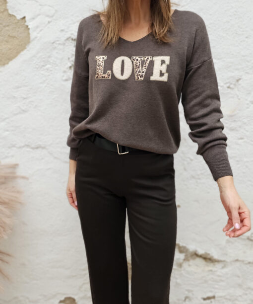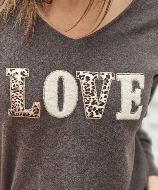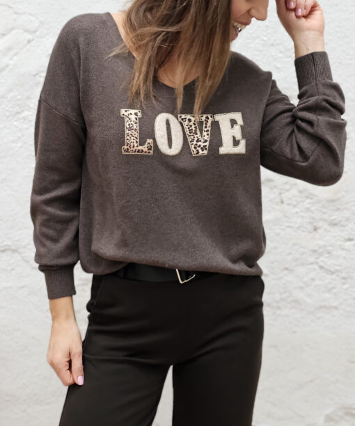 Cuello de pico, letras LOVE en tono print y beige, manguita larga…