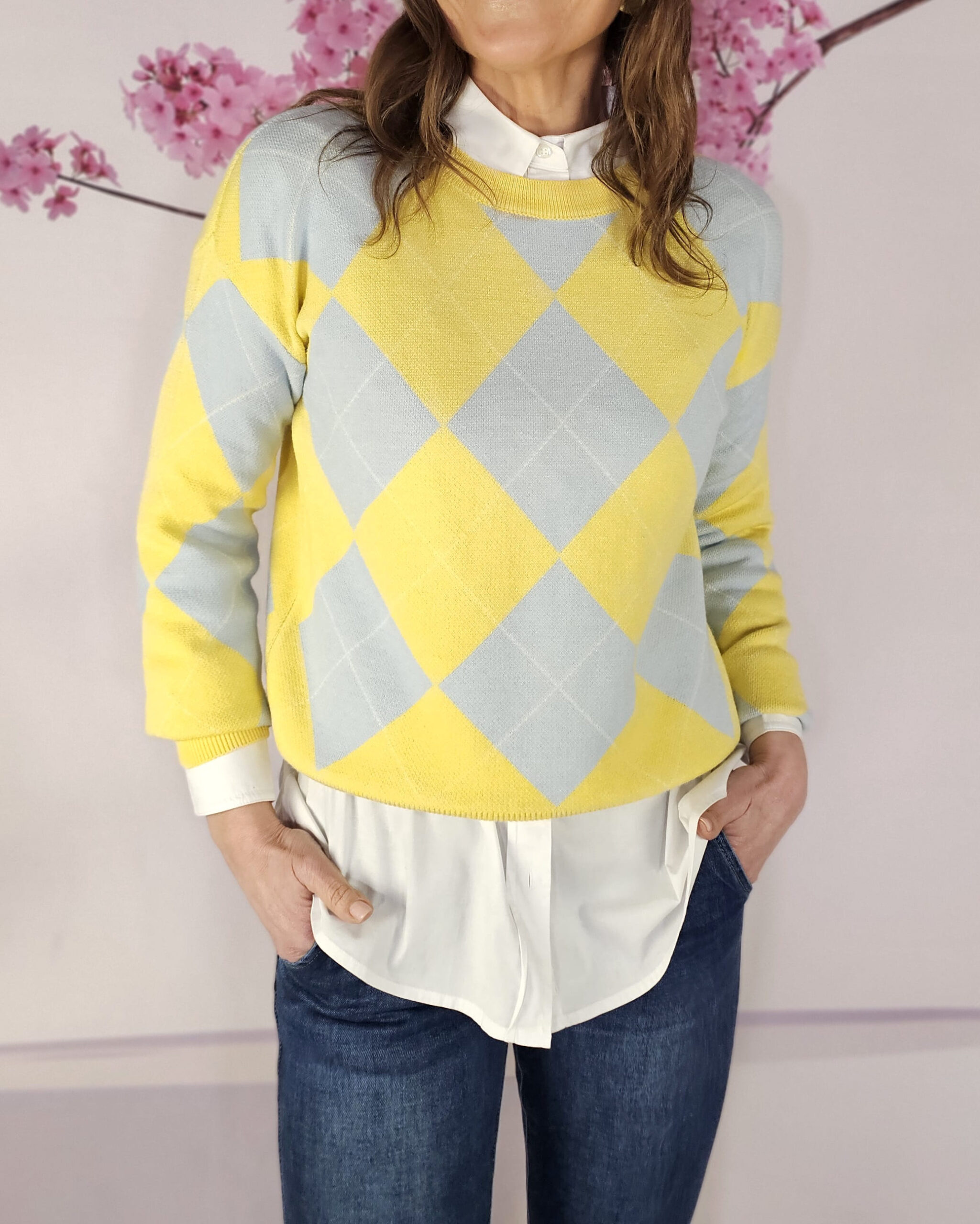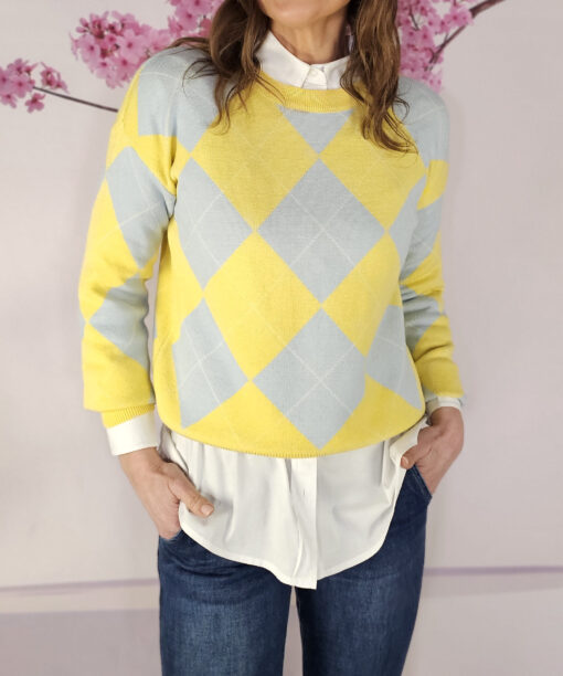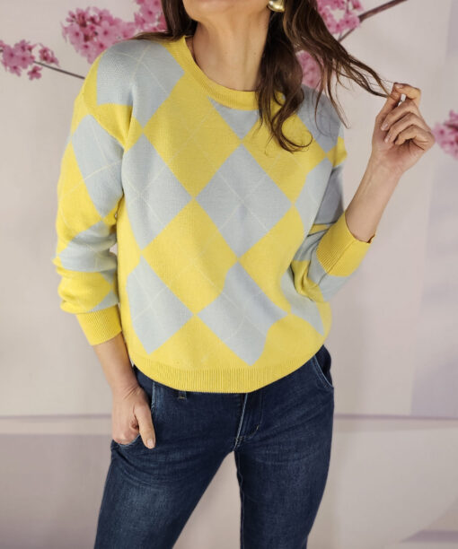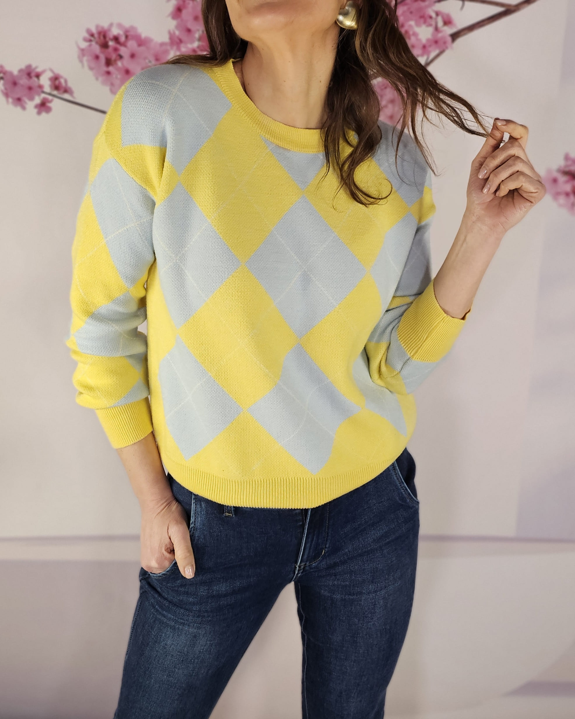 Tonos amarillos y celeste en forma de rombos. Cuello redondo y tacto precioso.