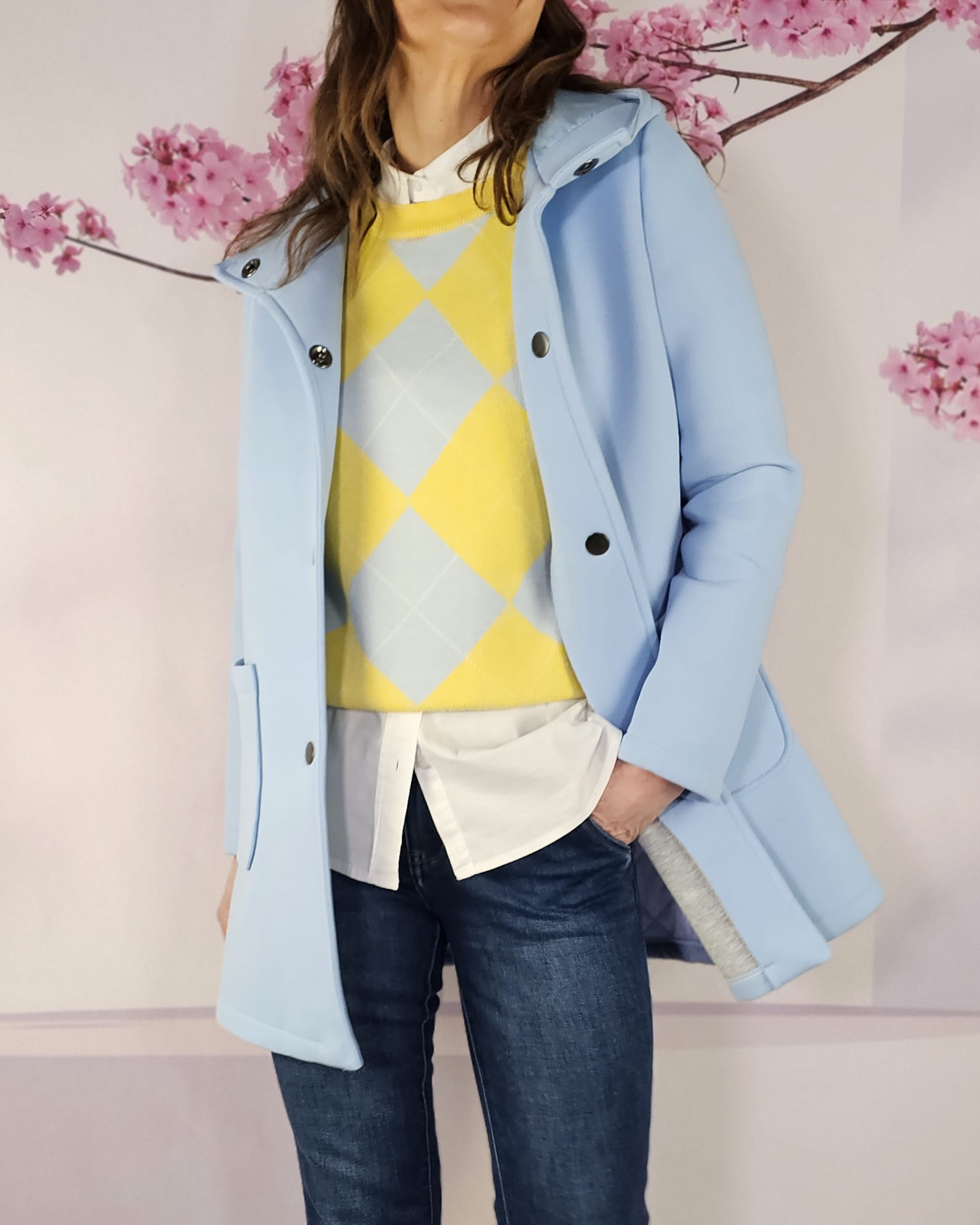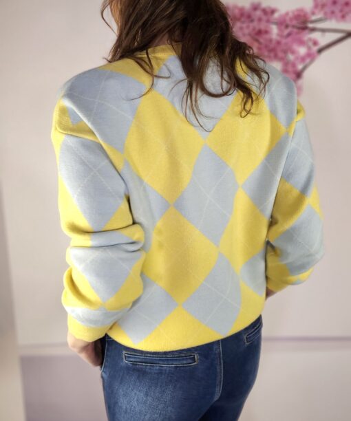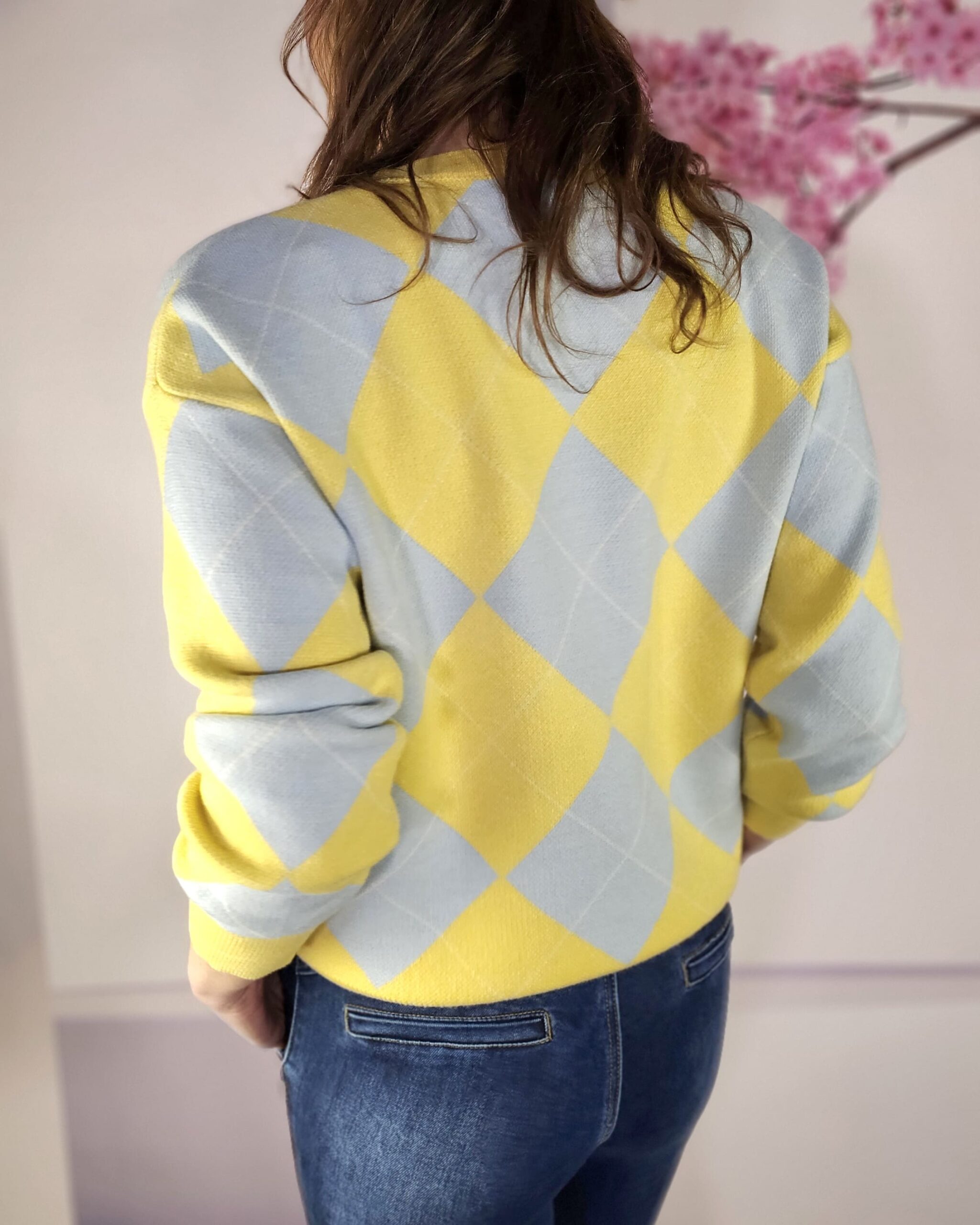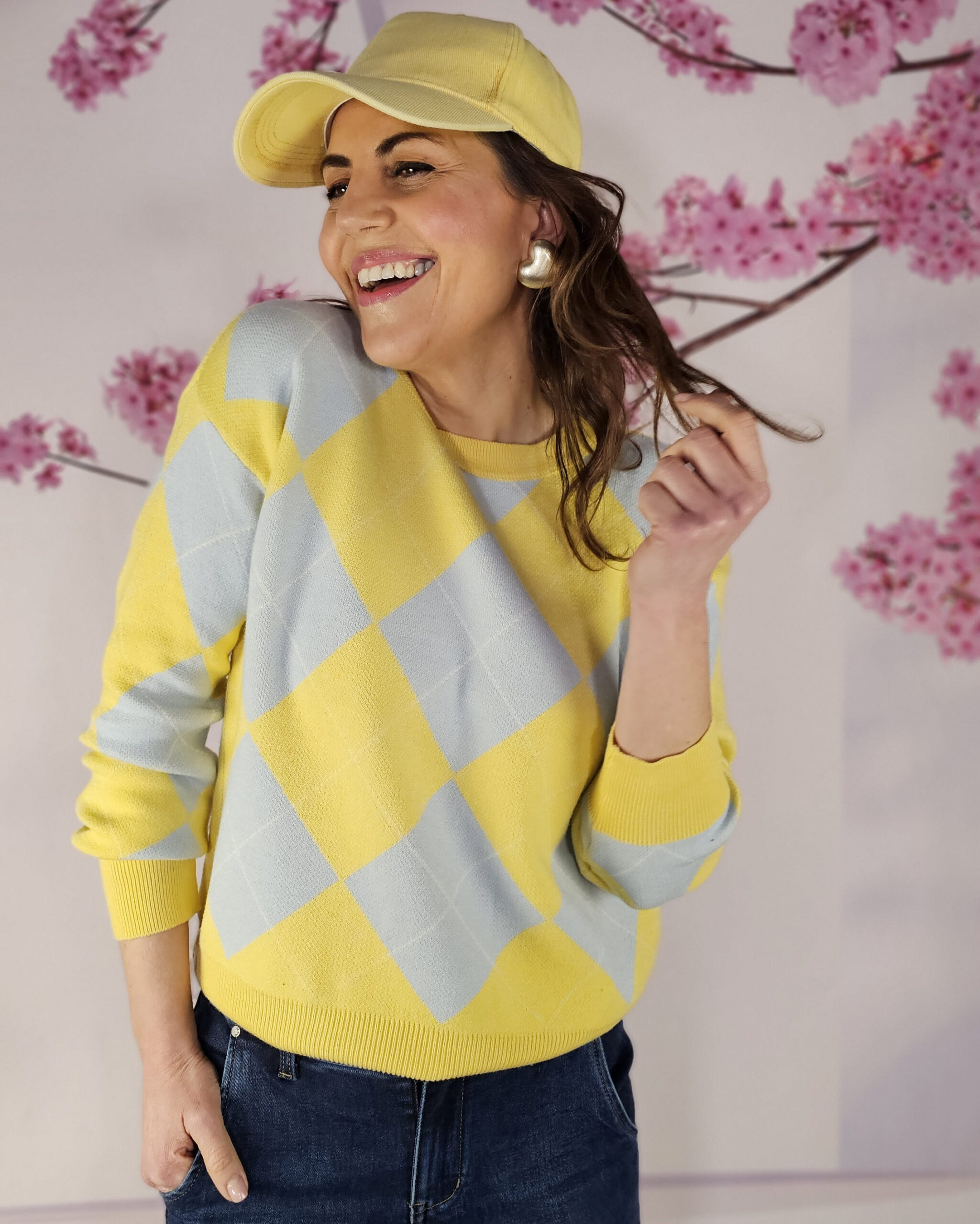 Tonos amarillos y celeste en forma de rombos. Cuello redondo y tacto precioso.