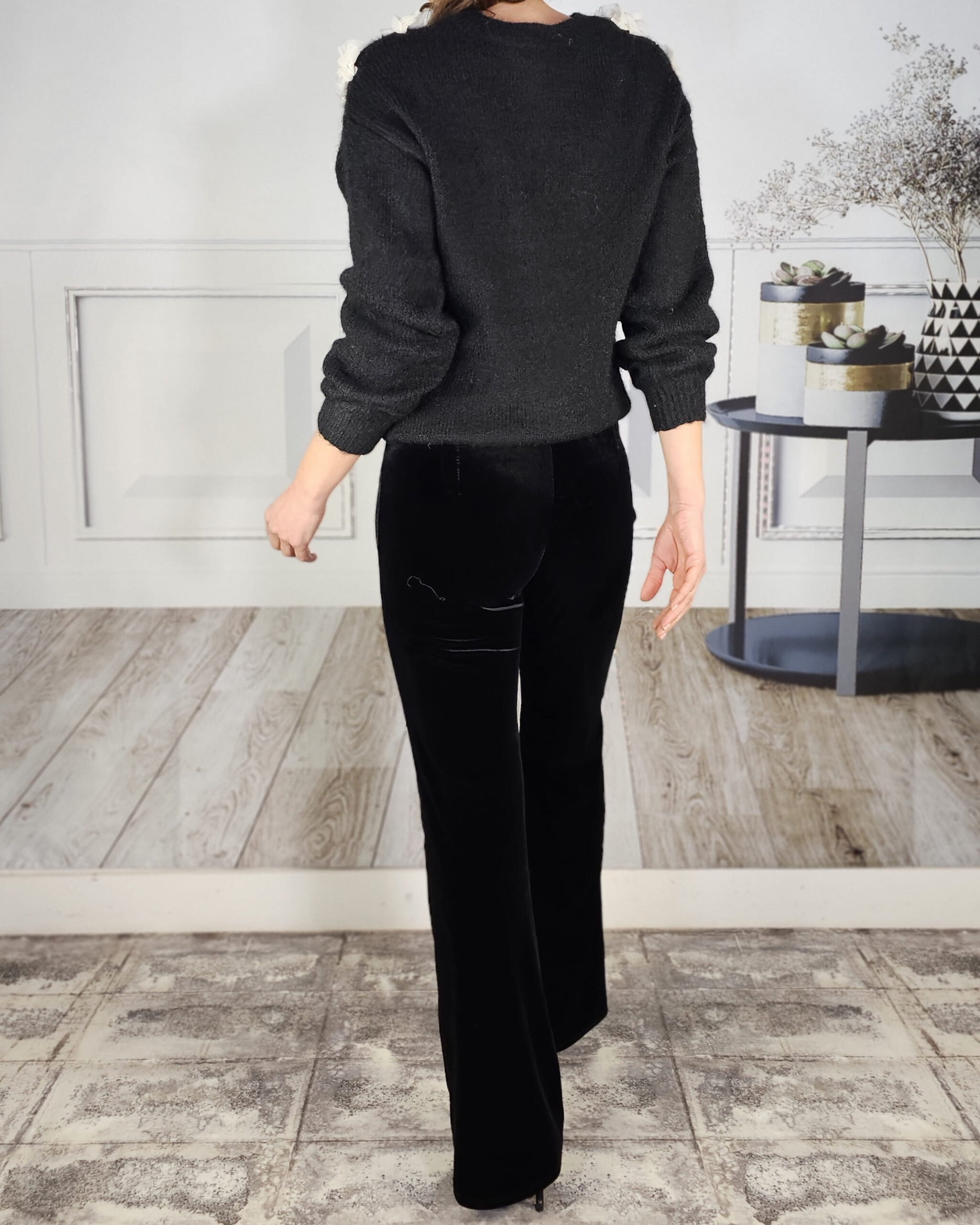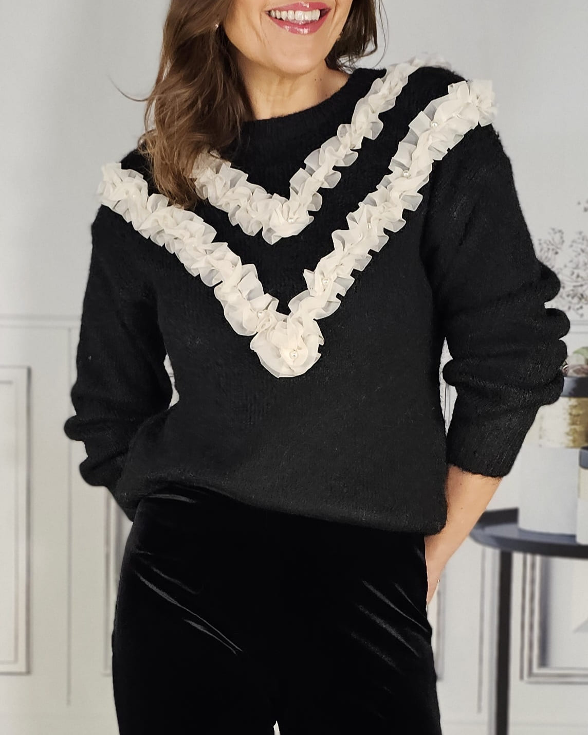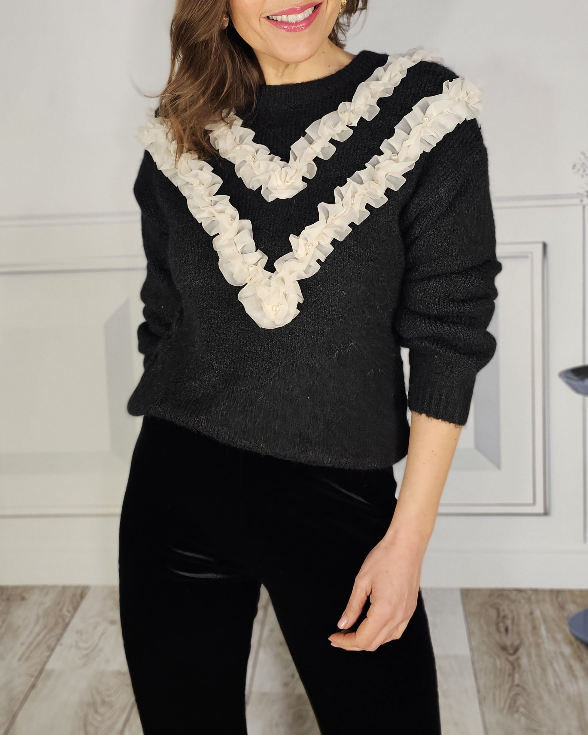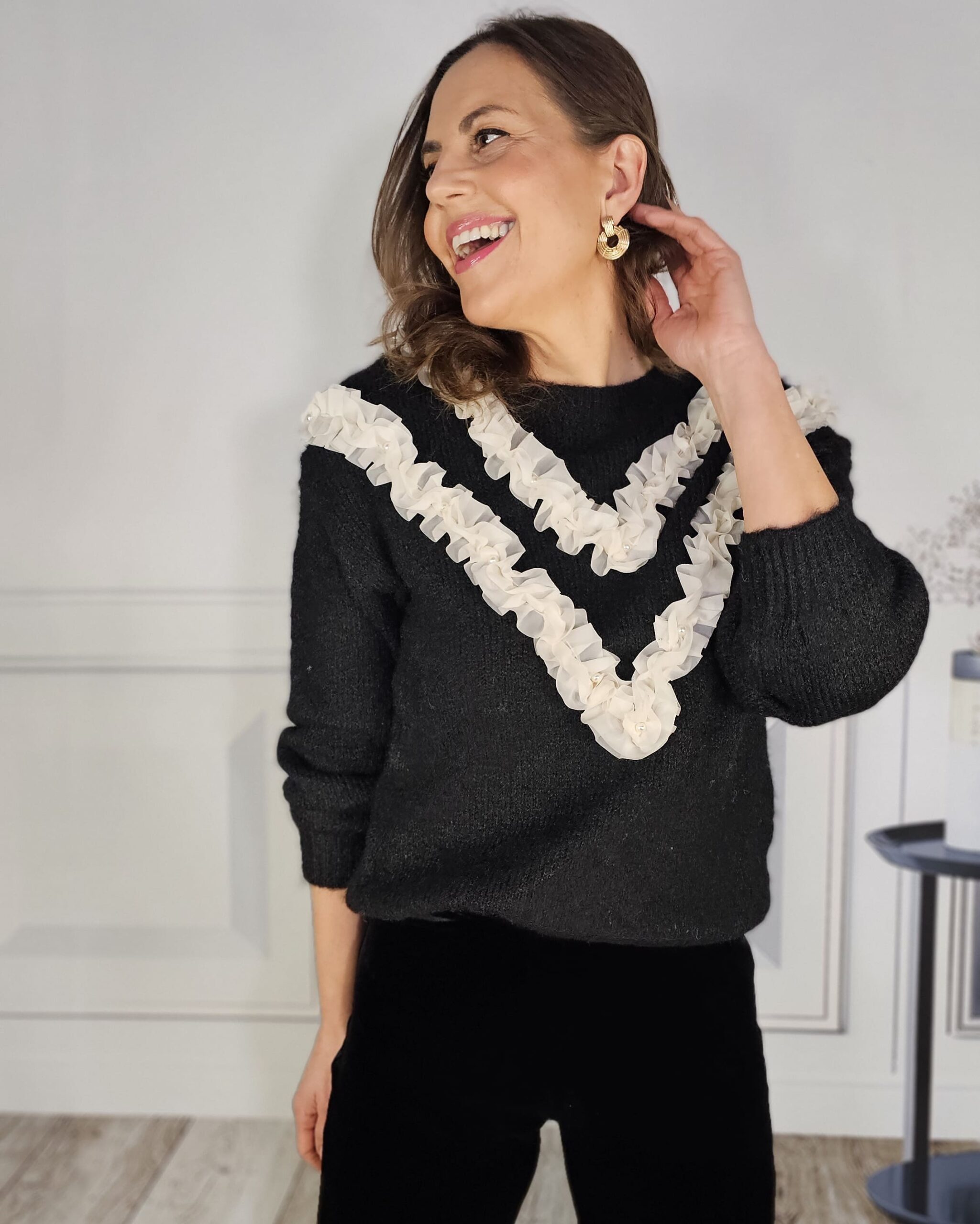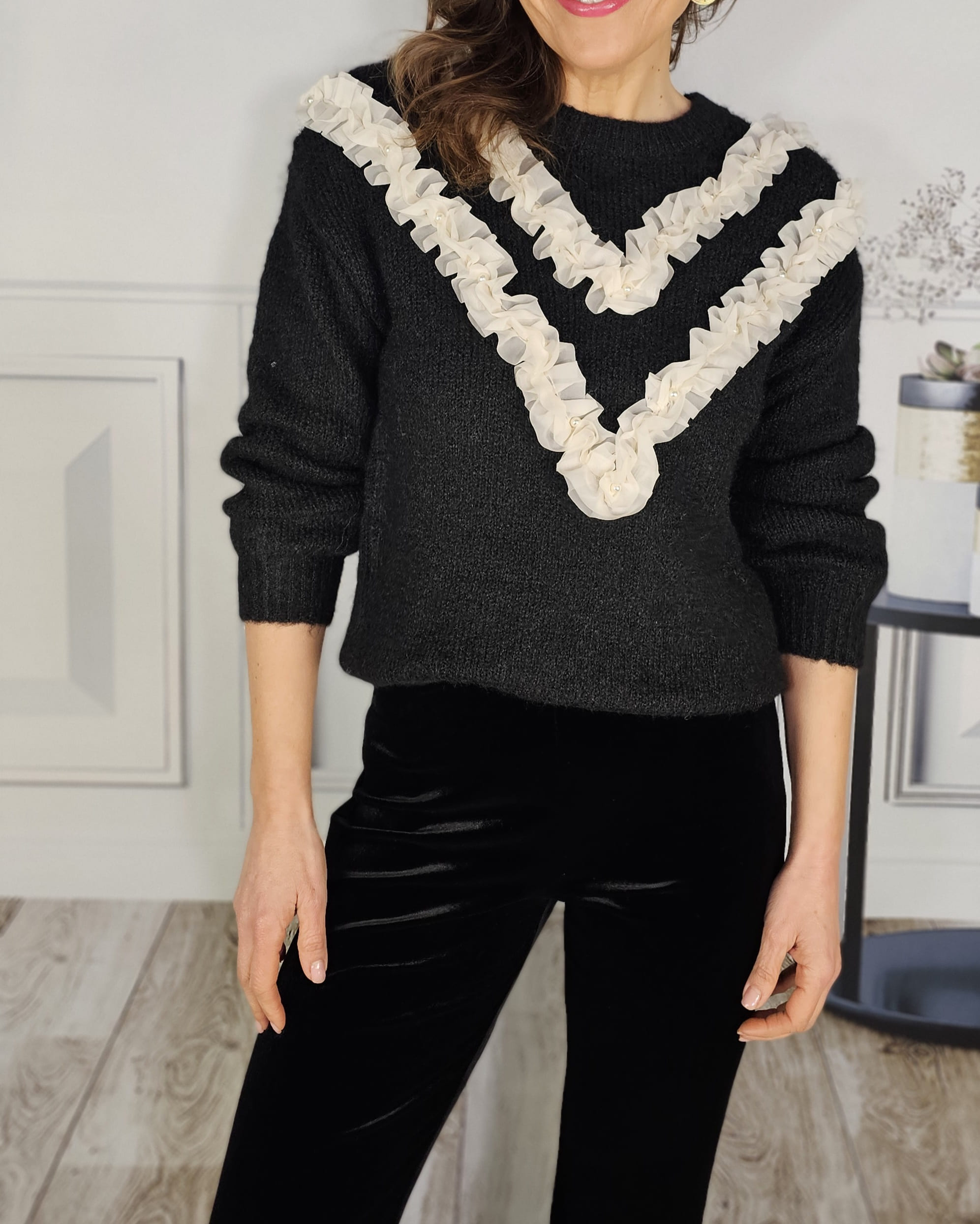 Volantito con perlitas…un jersey super estiloso que con el Pantalón de terciopelo negro hace un conjuntazo festivo.