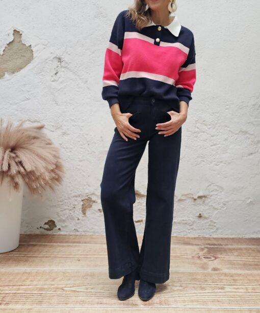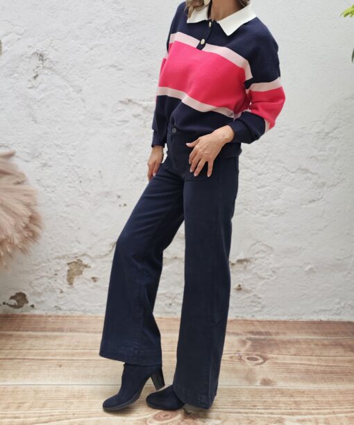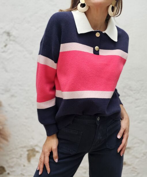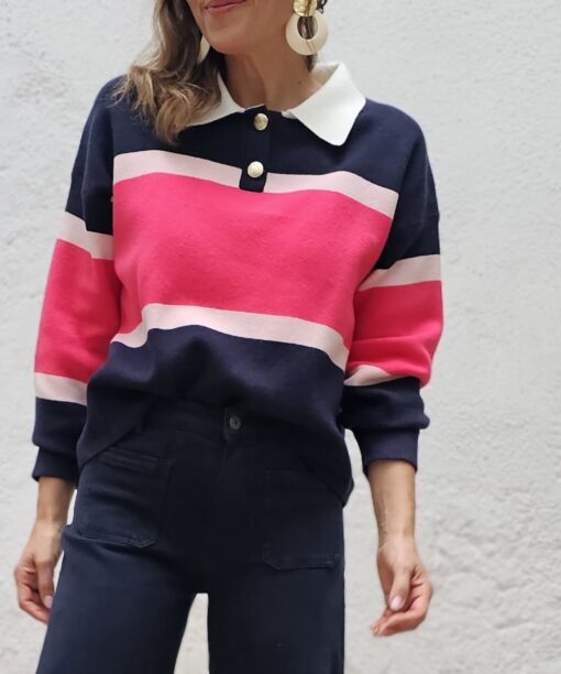 Tres tonos: Marino, fucsia y rosita. No nos cansamos de decirlo: Que jersey más pijo.