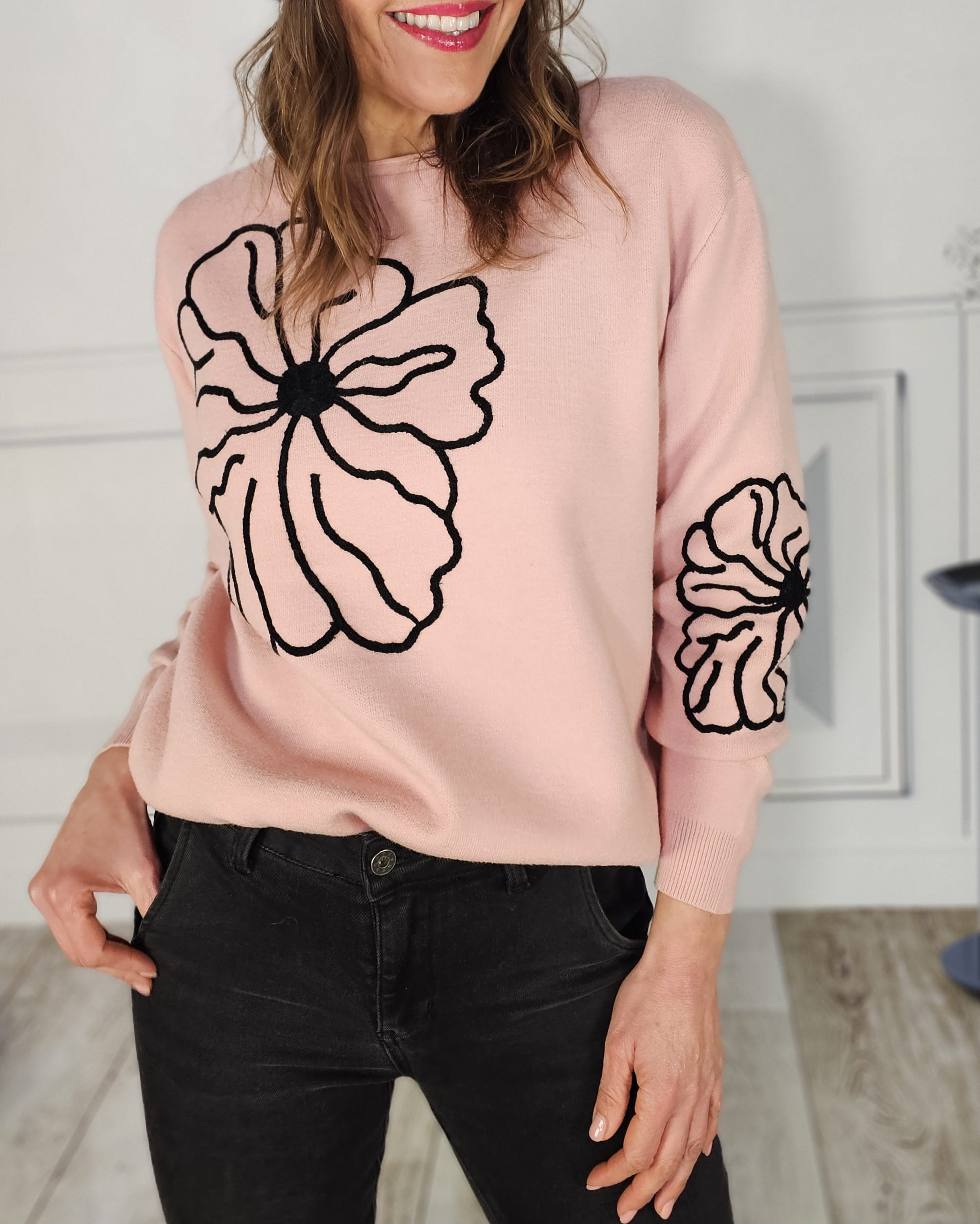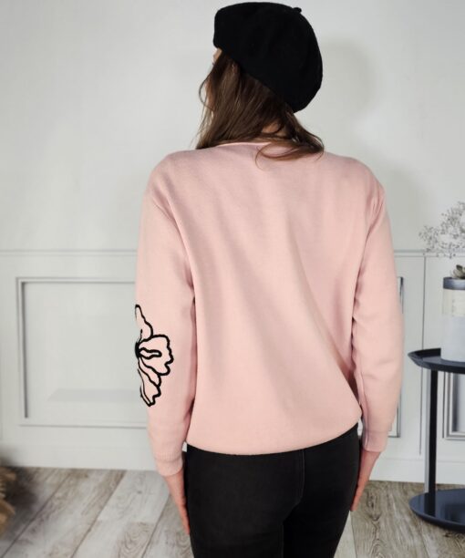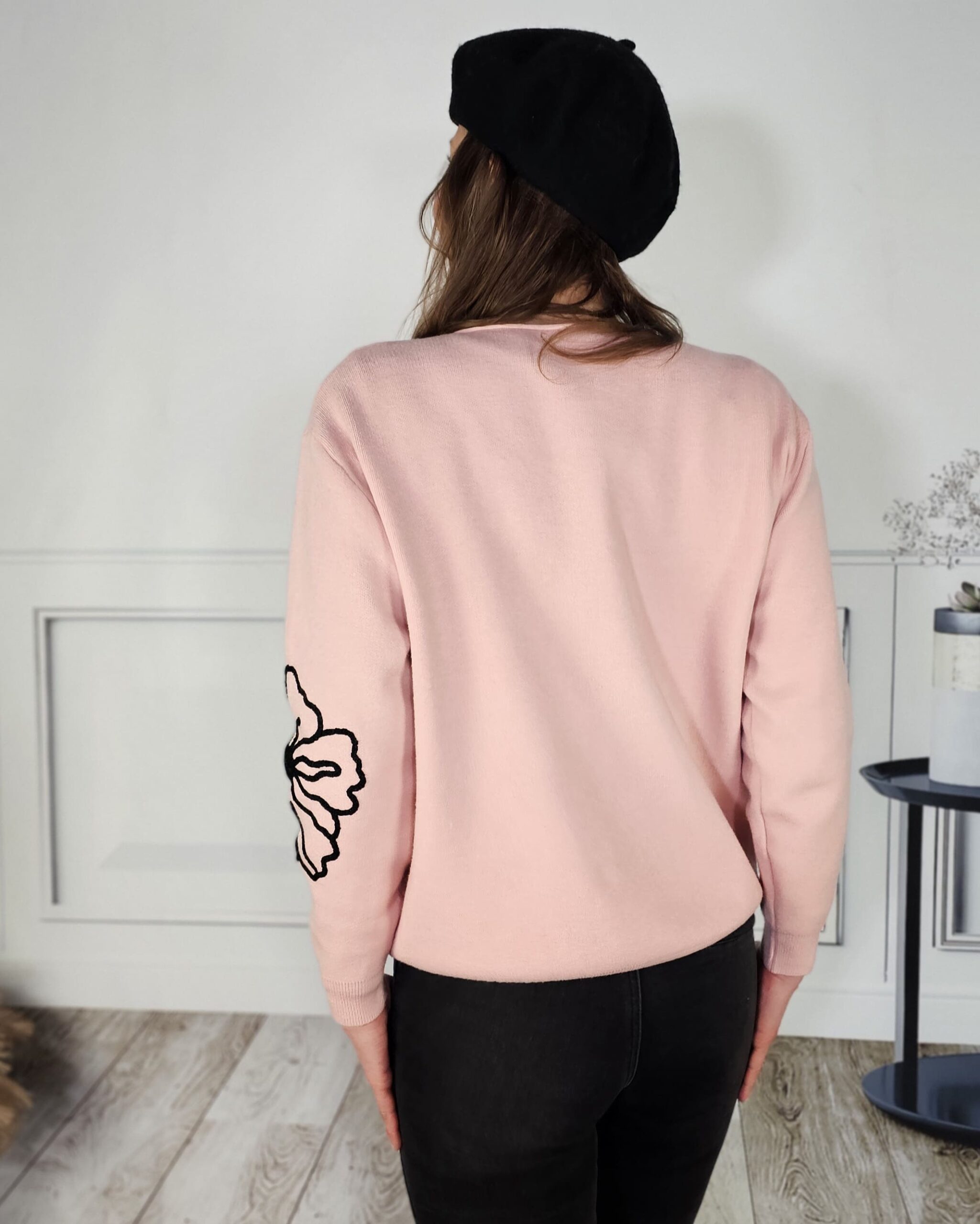 Flor bordada en el pecho y en la manga izquiera, cuello redondo ligeramente con efecto barco.