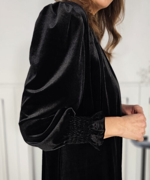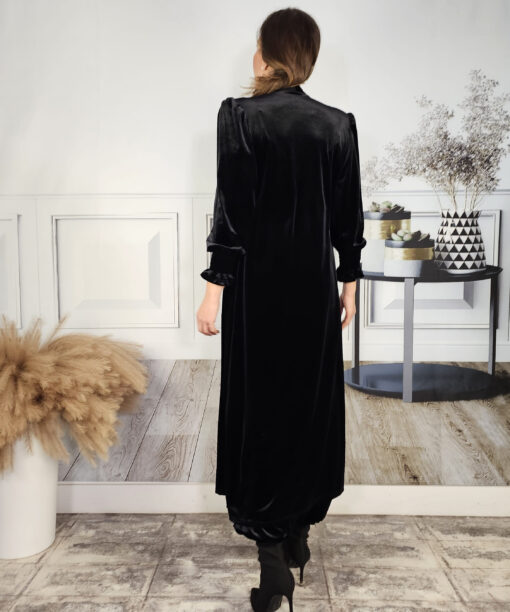 Terciopelo, levita, mangas rizadas, hombros ligeramente abullonados.