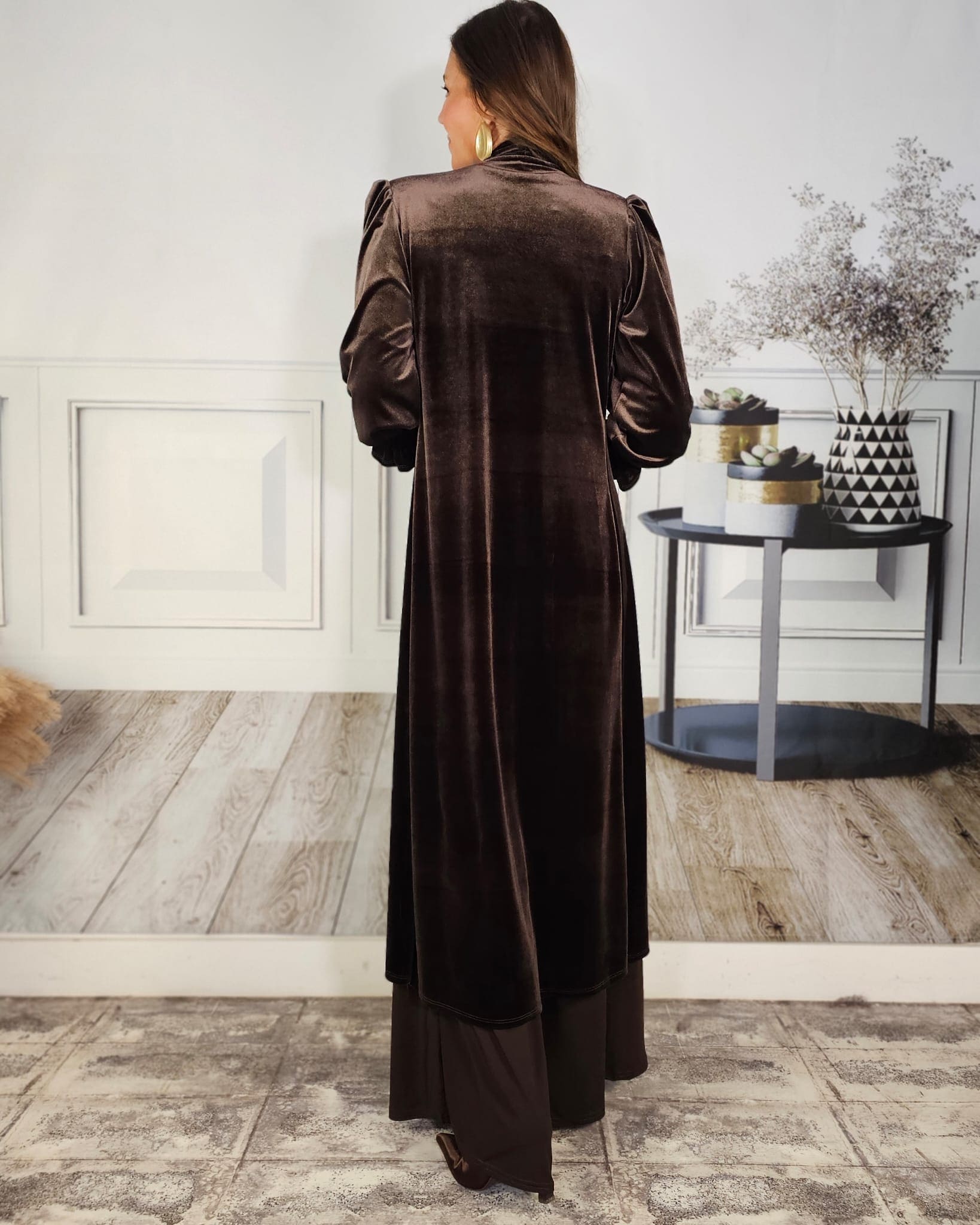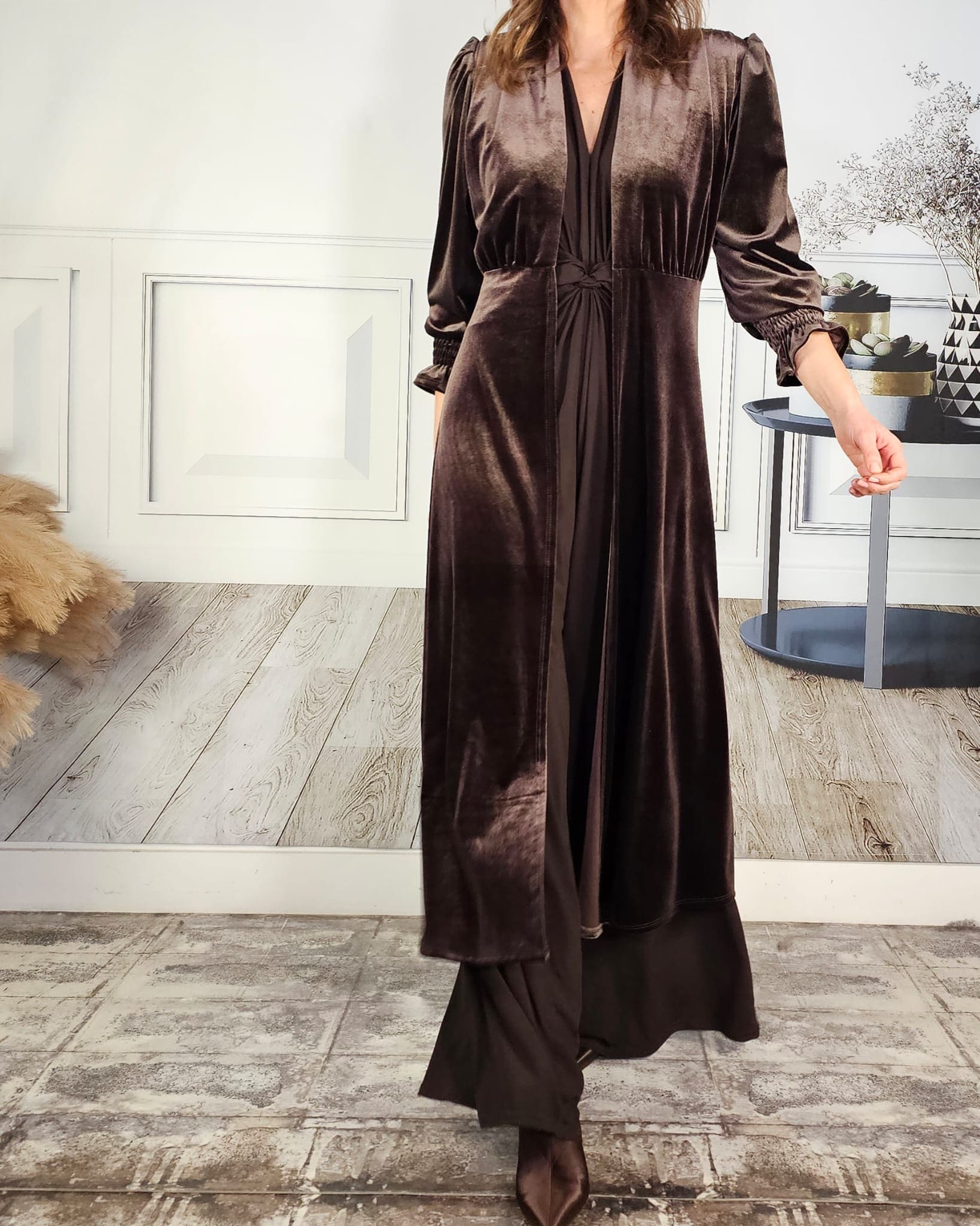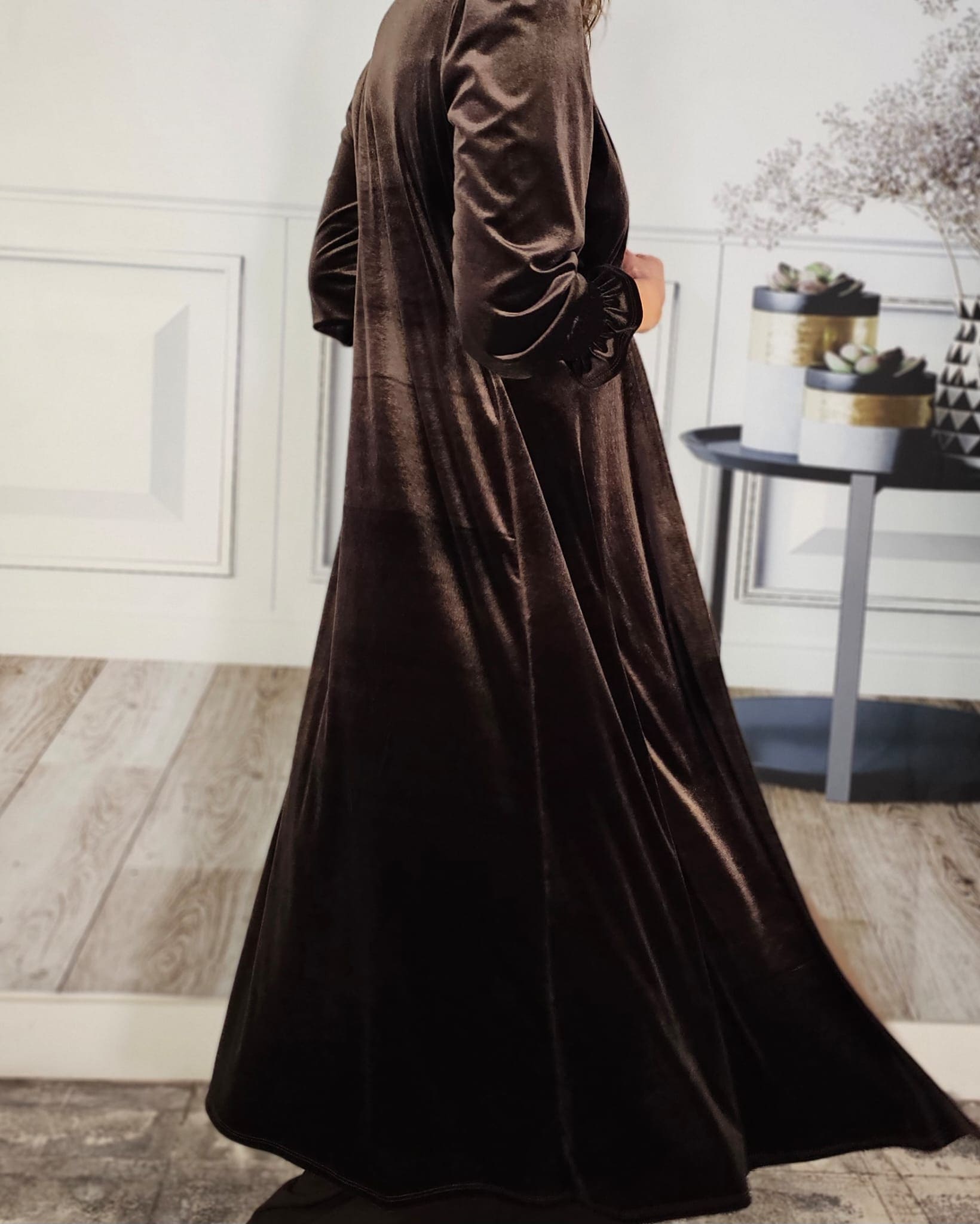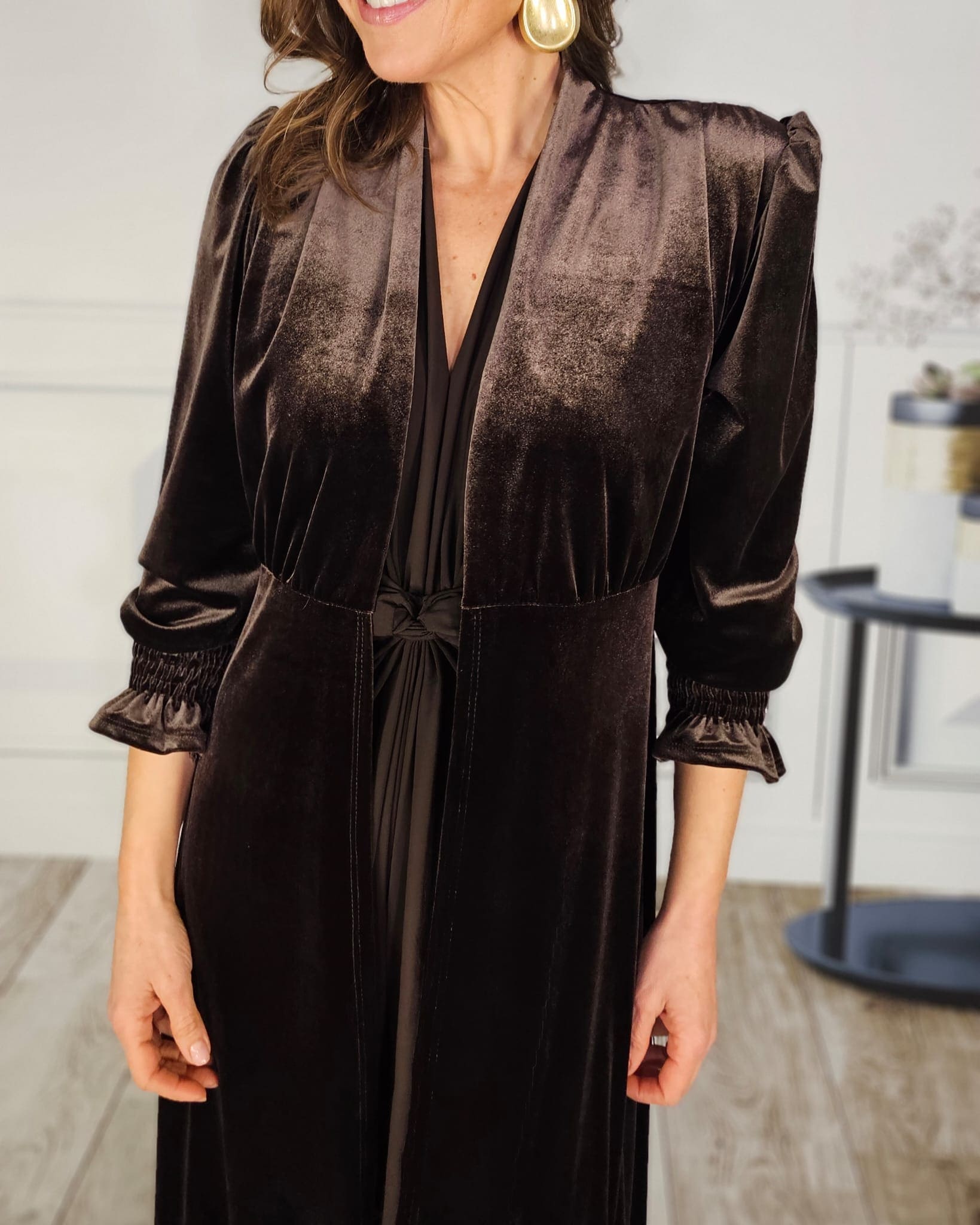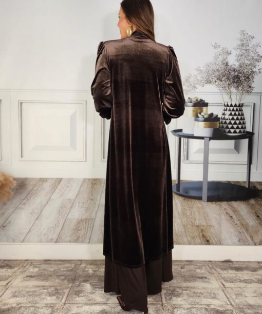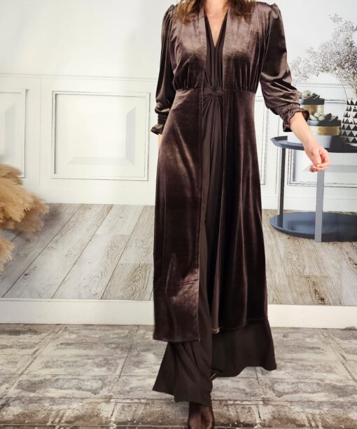 Terciopelo, levita, mangas rizadas, hombros ligeramente abullonados.