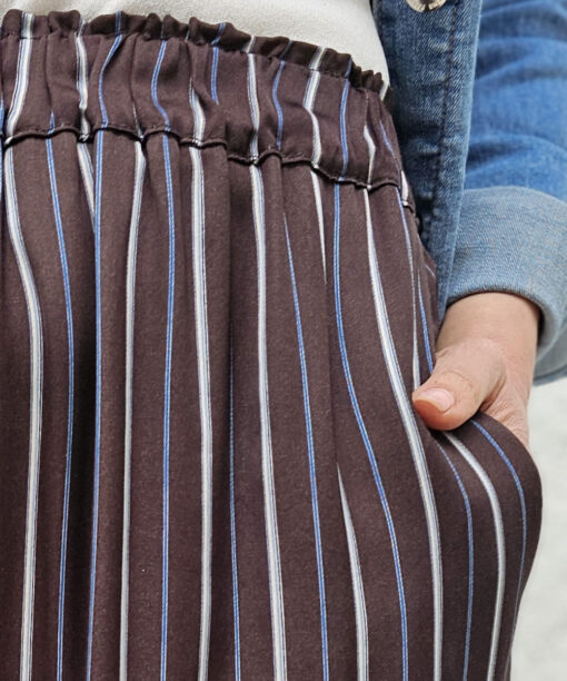 En tono marrón chocolate con rayas sutiles en tonos azules y crudas.