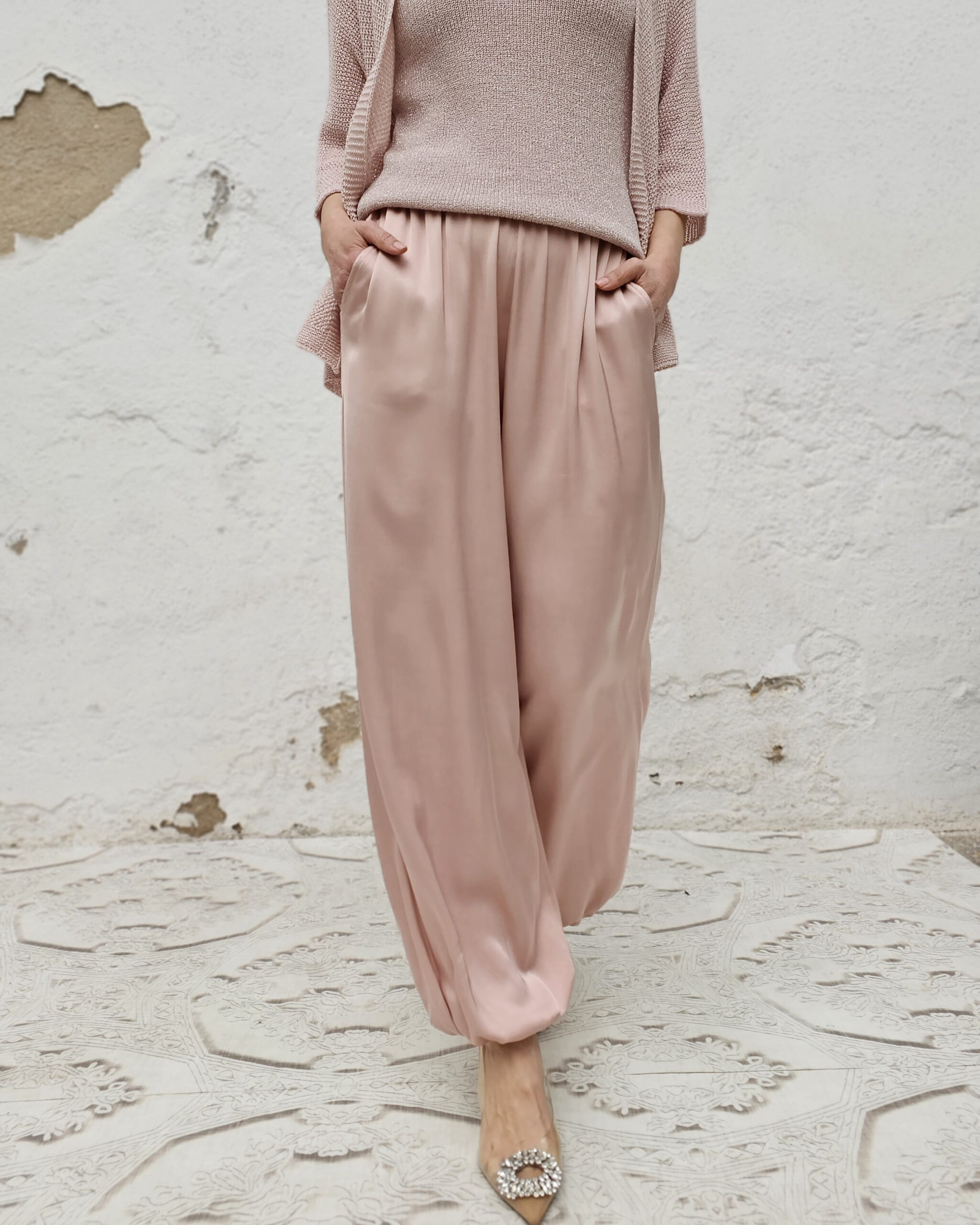Un pantalón bombacho (engomado en el tobillo), que es más largo que los enseñados otros años, con bolsillos en la posición natural de las manos y engomado en cintura.