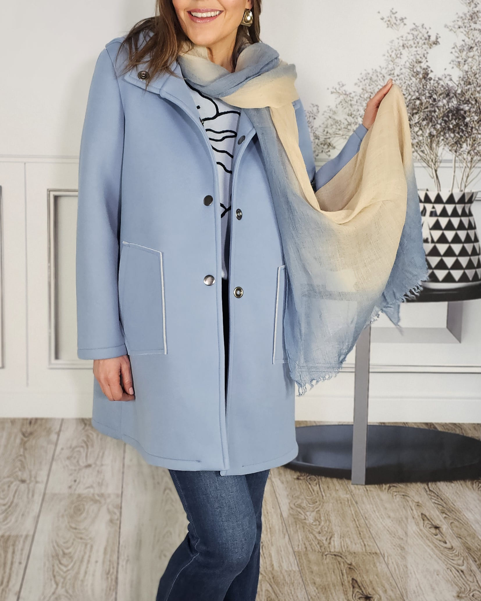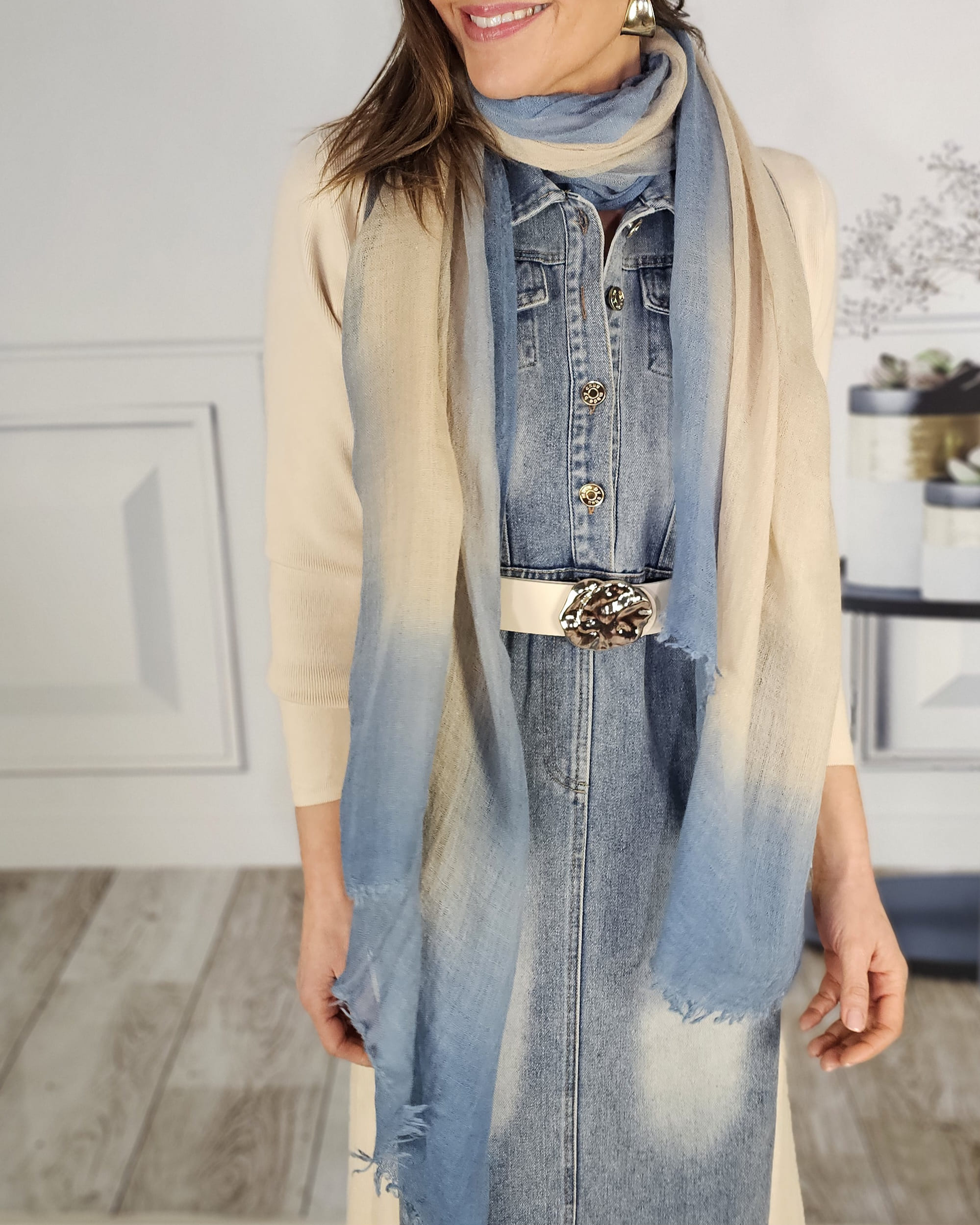 Suave, en tonos azules y crudos…deflecadito…una pashmina muy pija.